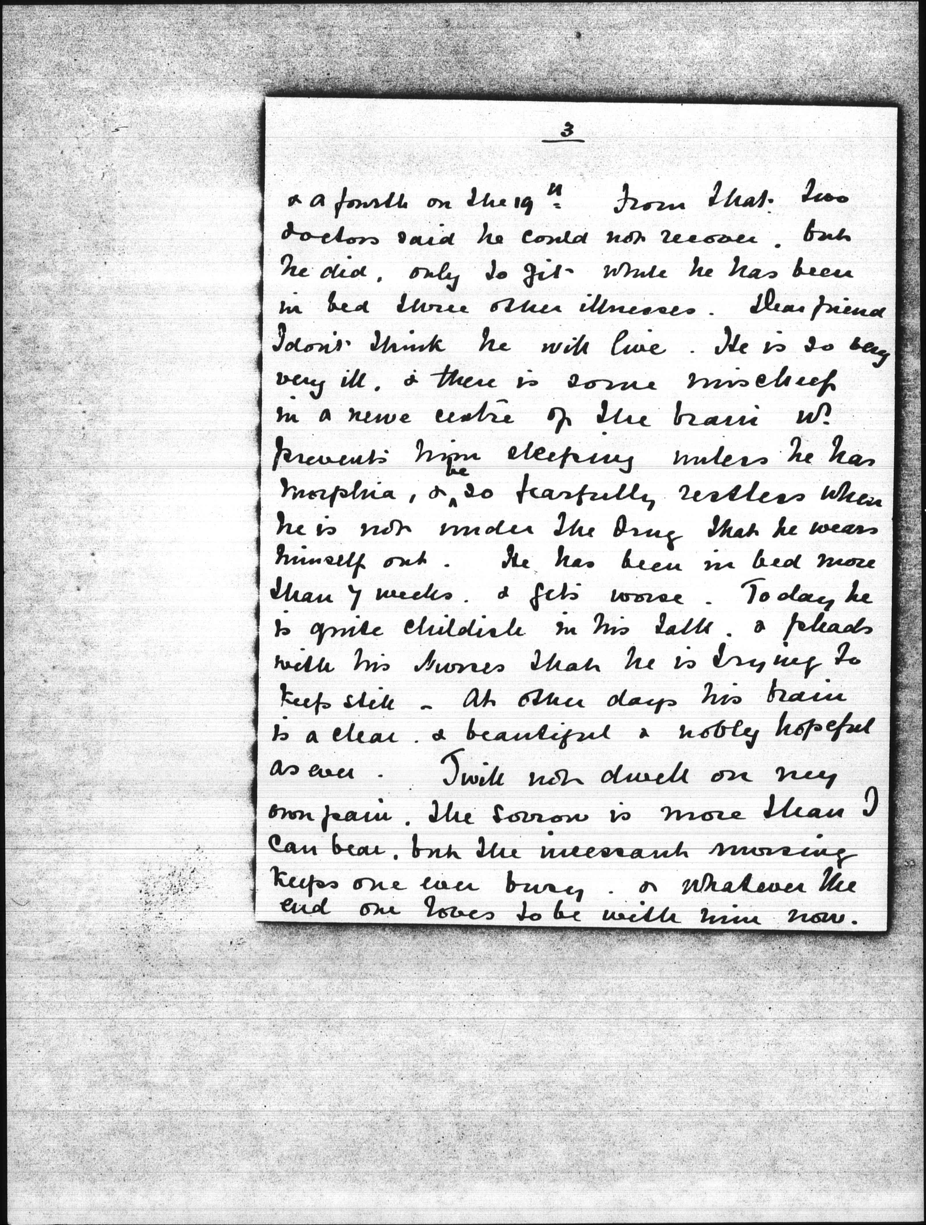 We took this little house, so as to open [illegible] down into brighter air for a few days, but we were only just settled in here, on April 8th when he had an attack, another on the 11th a third on the 18 [page 3] & a fourth on the 19th From that two doctors said he could not recover but he did, only to get while he has been in bed three other illnesses. Dear friend I don't think he will live. He is so very very ill, & there is some mischief in a nerve center of the brain wh. prevents him sleeping unless he has morphia, & <he> so fearfully restless when he is not under the Drug that he wears himself out. He has been in bed more than 7 weeks & gets worse. Today he is quite childish in his talk & pleads with his nurses that he is trying to keep still. At other days his brain is [as] clear & beautiful & nobly hopeful as ever. I will not dwell on my own pain. The sorrow is more than I can bear, but the incessant moving keeps one ever busy & whatever the end one loves to be with him now. [page 4]