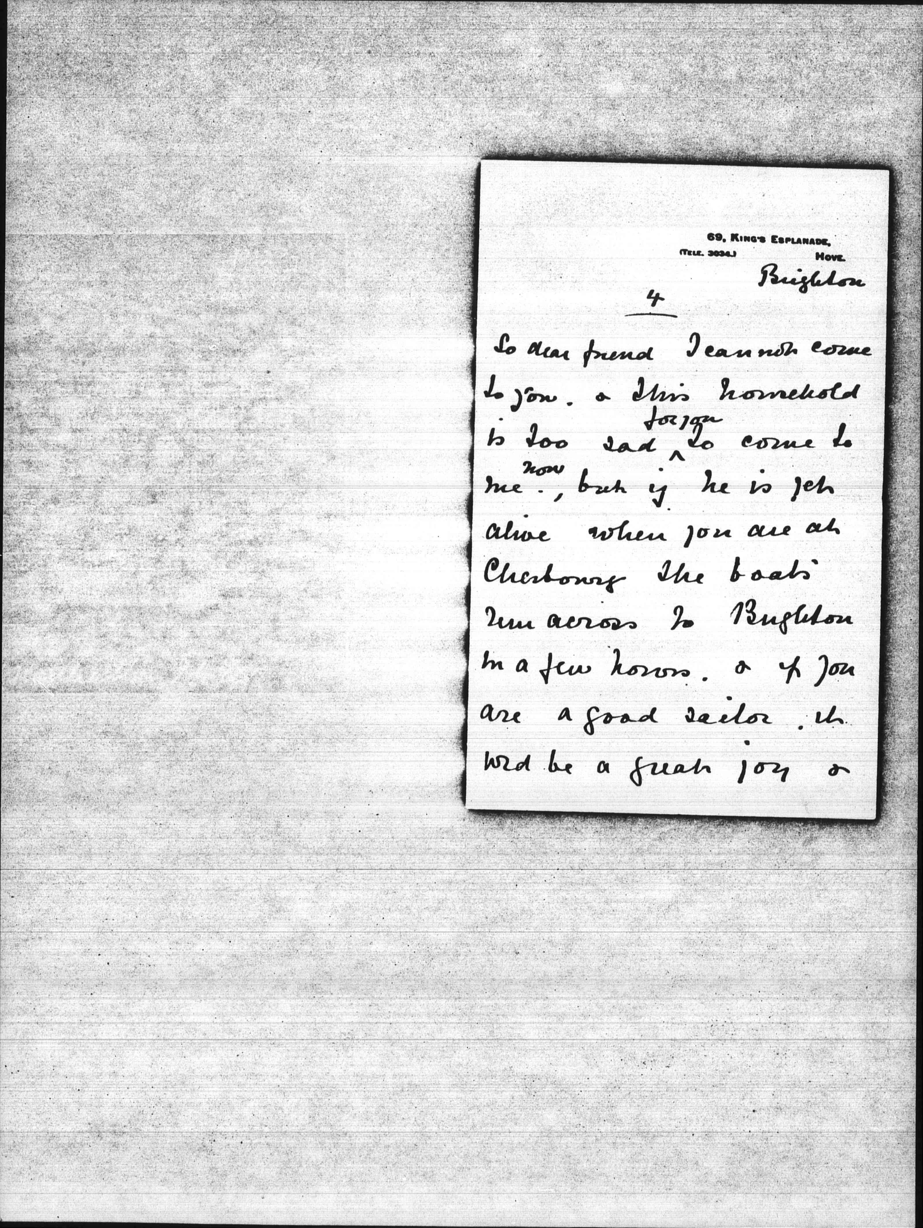 So dear friend I cannot come to you, & this household is too sad <for you> to come to me <now>, but if he is yet alive when you are at Cherbourg the boats run across to Brighton in a few hours, & if you are a good sailor it wld be a great joy & [page 5] privilege for me to see you again.