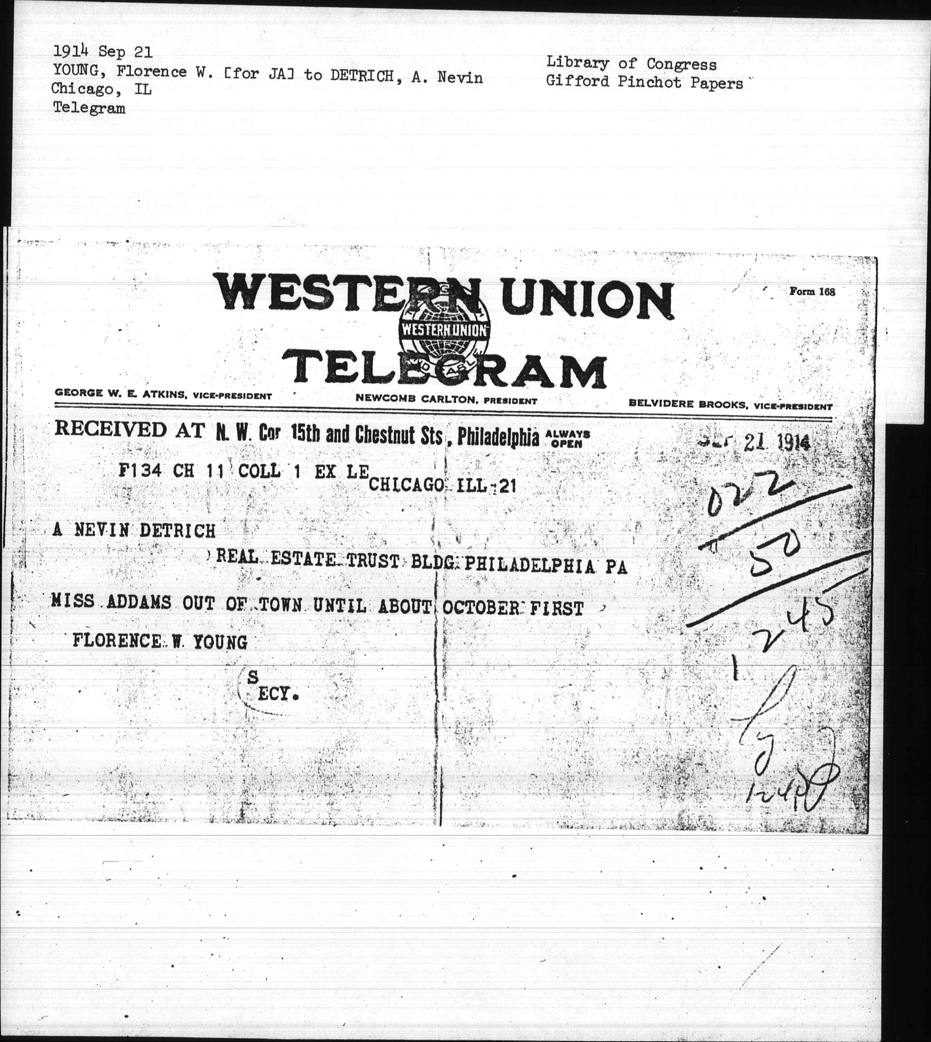 MISS ADDAMS OUT OF TOWN UNTIL ABOUT OCTOBER FIRST