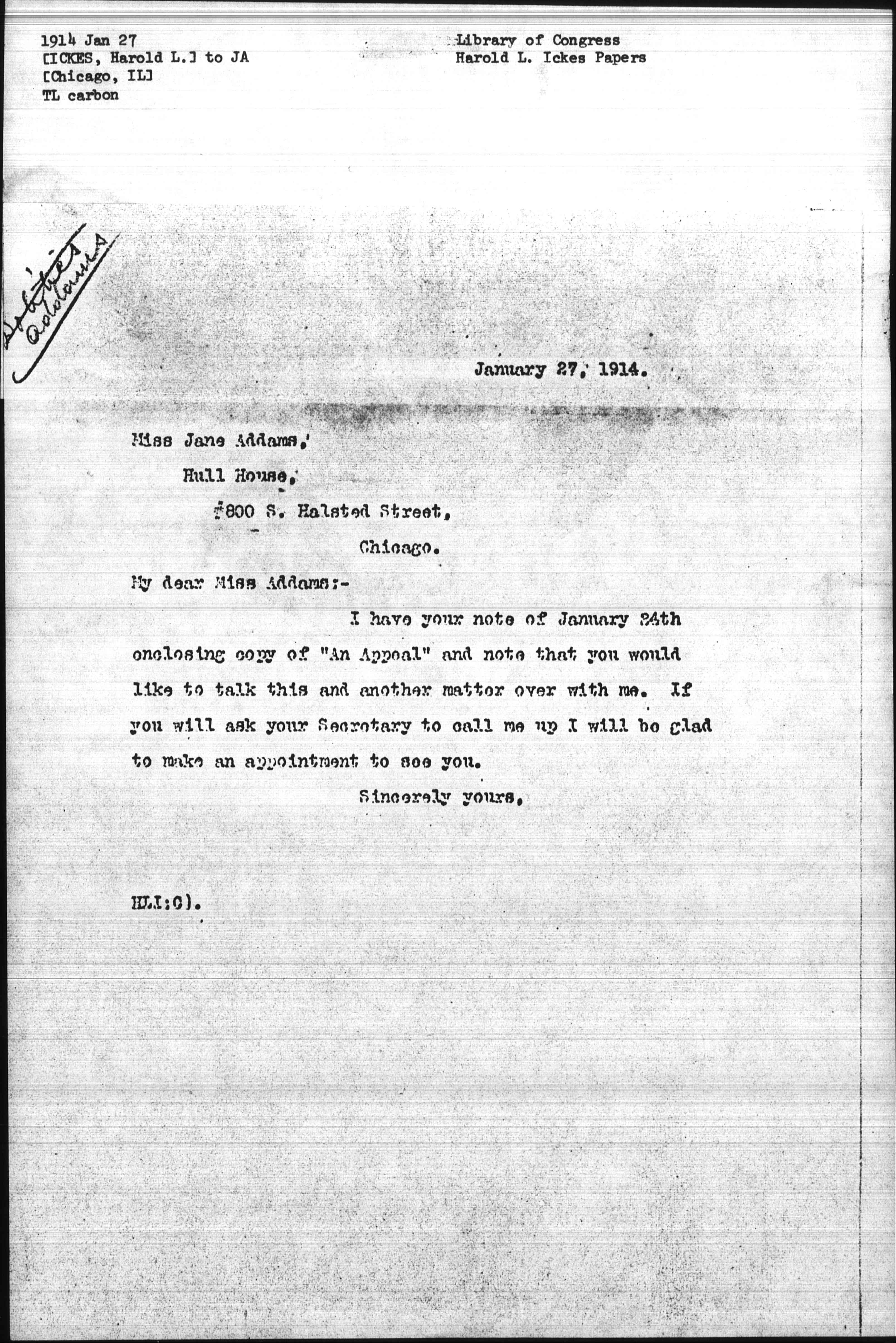 I have your note of January 24th enclosing copy of "An Appeal" and note that you would like to talk this and another matter over with me. If you will ask your Secretary to call me up I will be glad to make an appointment to see you.