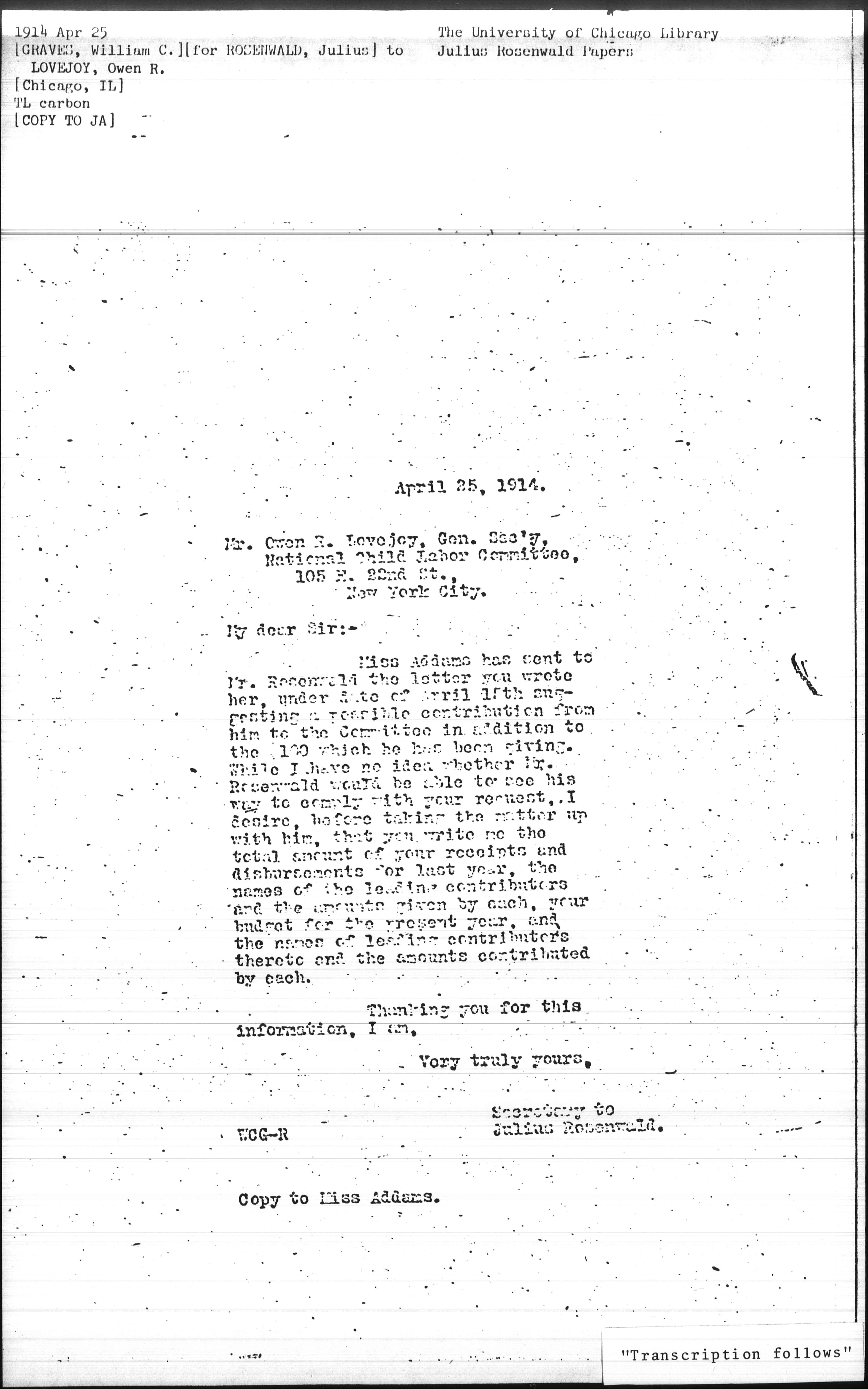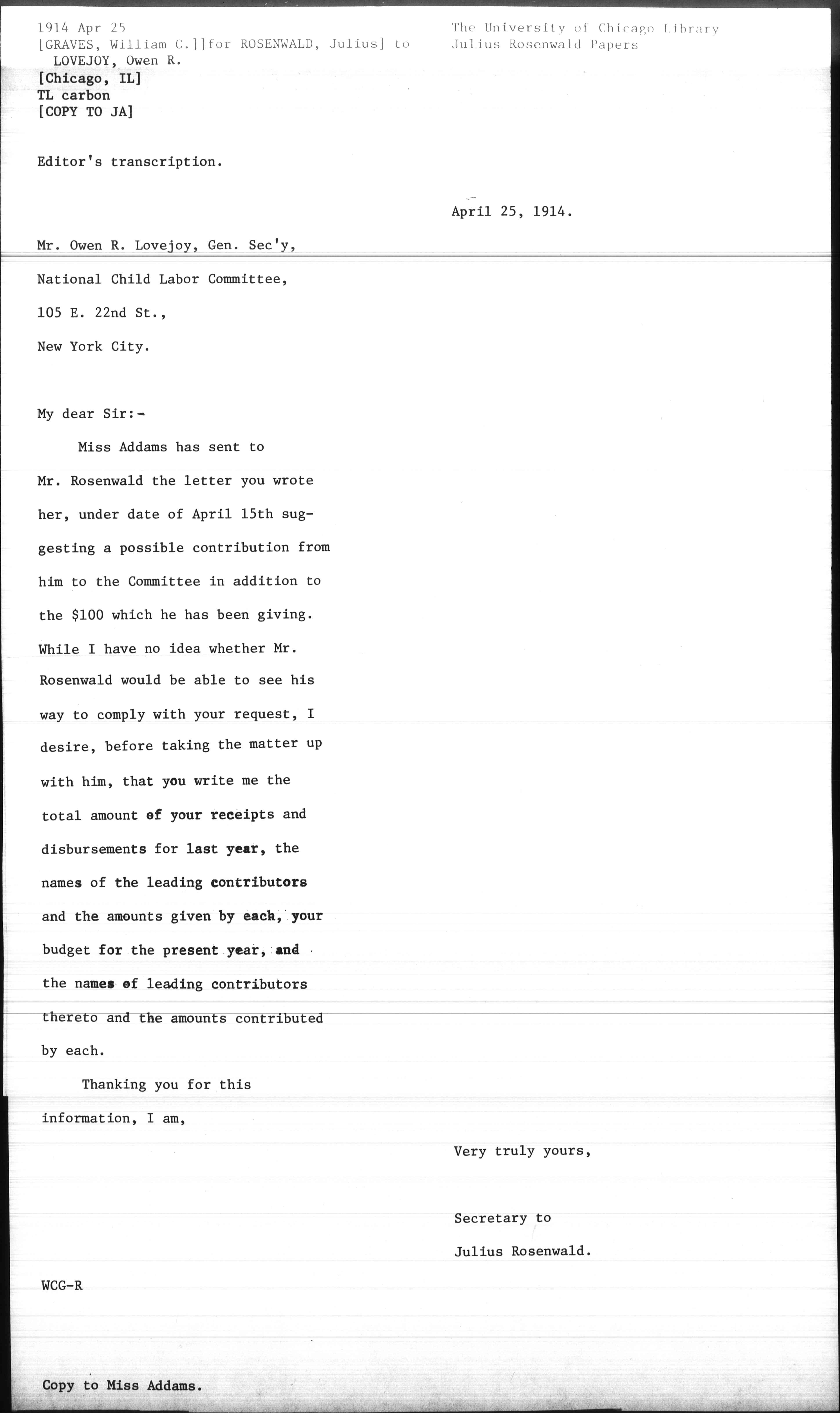 Miss Addams has sent to Mr. Rosenwald the letter you wrote her, under date of April 15th suggesting a possible contribution from him to the Committee in addition to the 100 which he has been giving. While I have no idea whether Mr. Rosenwald would be able to see his way to comply with your request, I desire, before taking the matter up with him, that you write me the total amount of your receipts and disbursements for last year, the names of the leading contributors and the amounts given by each, your budget for the present year, and the names of leading contributors thereto and the amounts contributed by each.