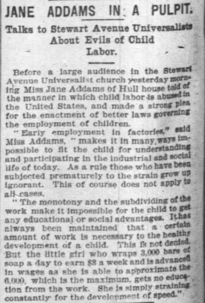 Before a large audience in the Stewart Avenue Universalist church yesterday morning Miss Jane Addams of Hull house told of the manner in which child labor is abused in the United States, and made a strong plea for the enactment of better laws governing the employment of children.