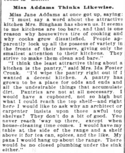 "I must say a word about the attractive kitchen Mrs. Bingham has shown us. It seems to me kitchens are too bare, and that is one reason why housewives tire of cooking and why cooks grow dissatisfied. People apparently lock up all the possess of variety in the fronts of their houses, giving only the smallest attention to their kitchens. They strive to make them clean and bare."