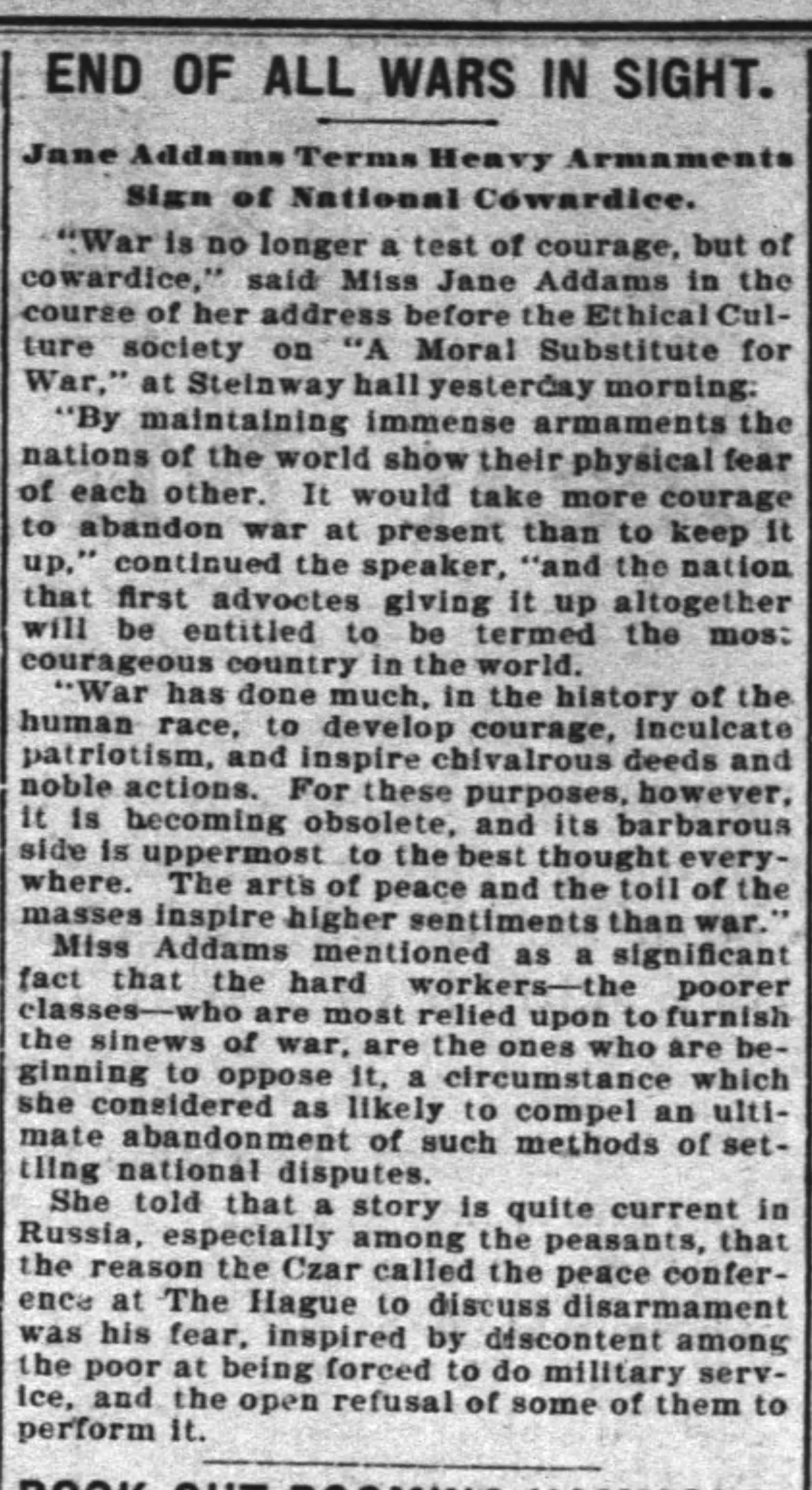 Miss Addams mentioned as a significant fact that the hard workers -- the poorer classes -- who are most relied upon to furnish the sinews of war, are the ones who are beginning to oppose it, a circumstance which she considered as likely to compel an ultimate abandonment of such methods of settling national disputes.
