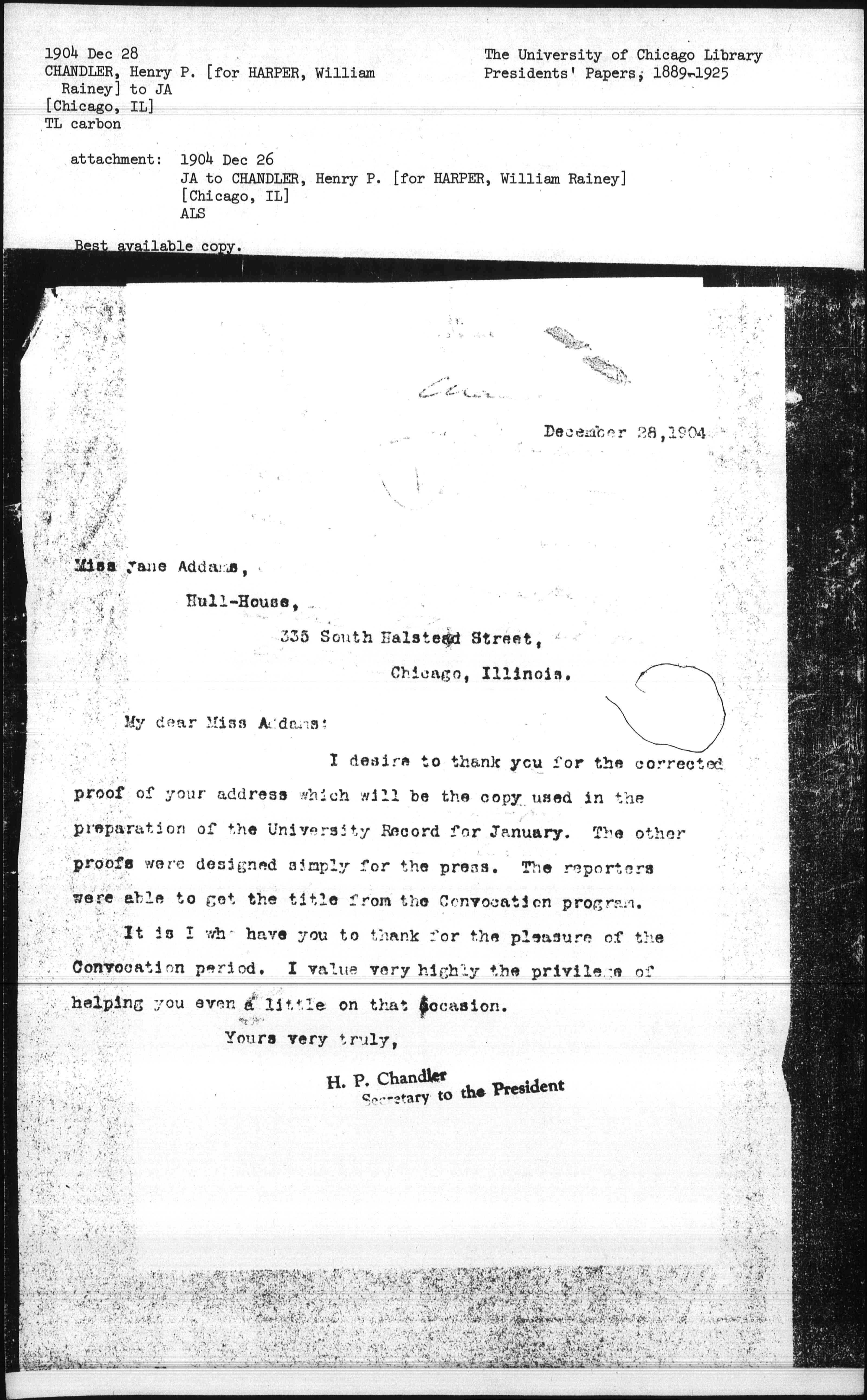 I desire to thank you for the corrected proof of your address which will be the copy used in the preparation of the University Record for January. The other proofs were designed simply for the press. The reporters were able to get the title from the Convocation progress.
