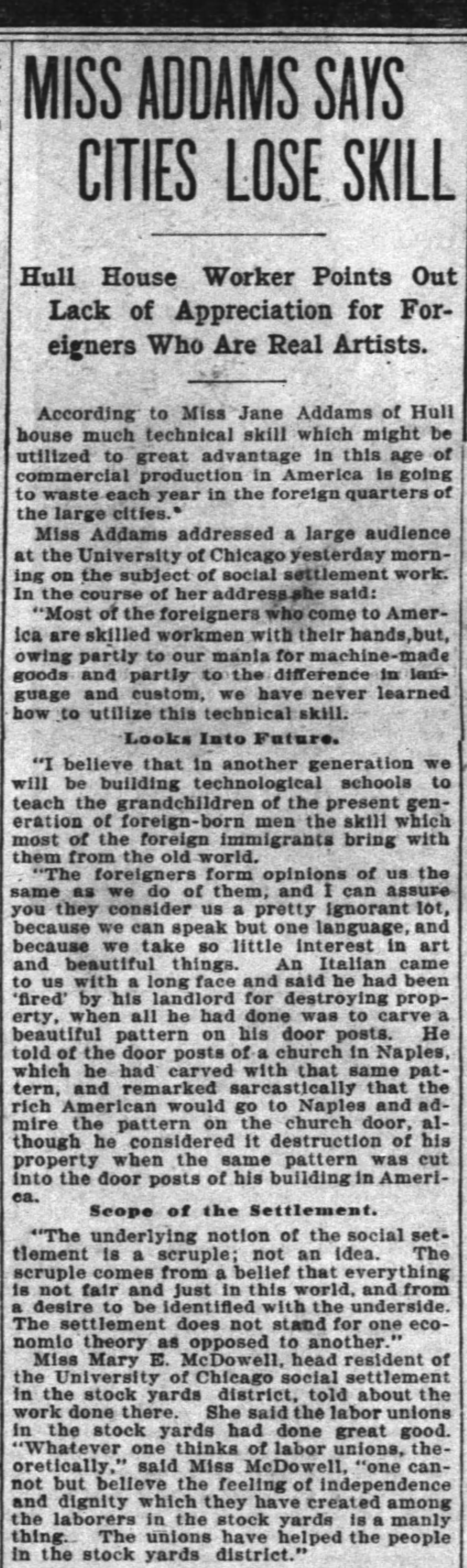 According to Miss Jane Addams of Hull house much technical skill which might be utilized to great advantage in this age of commercial production in America is going to waste each year in the foreign quarters of the large cities.