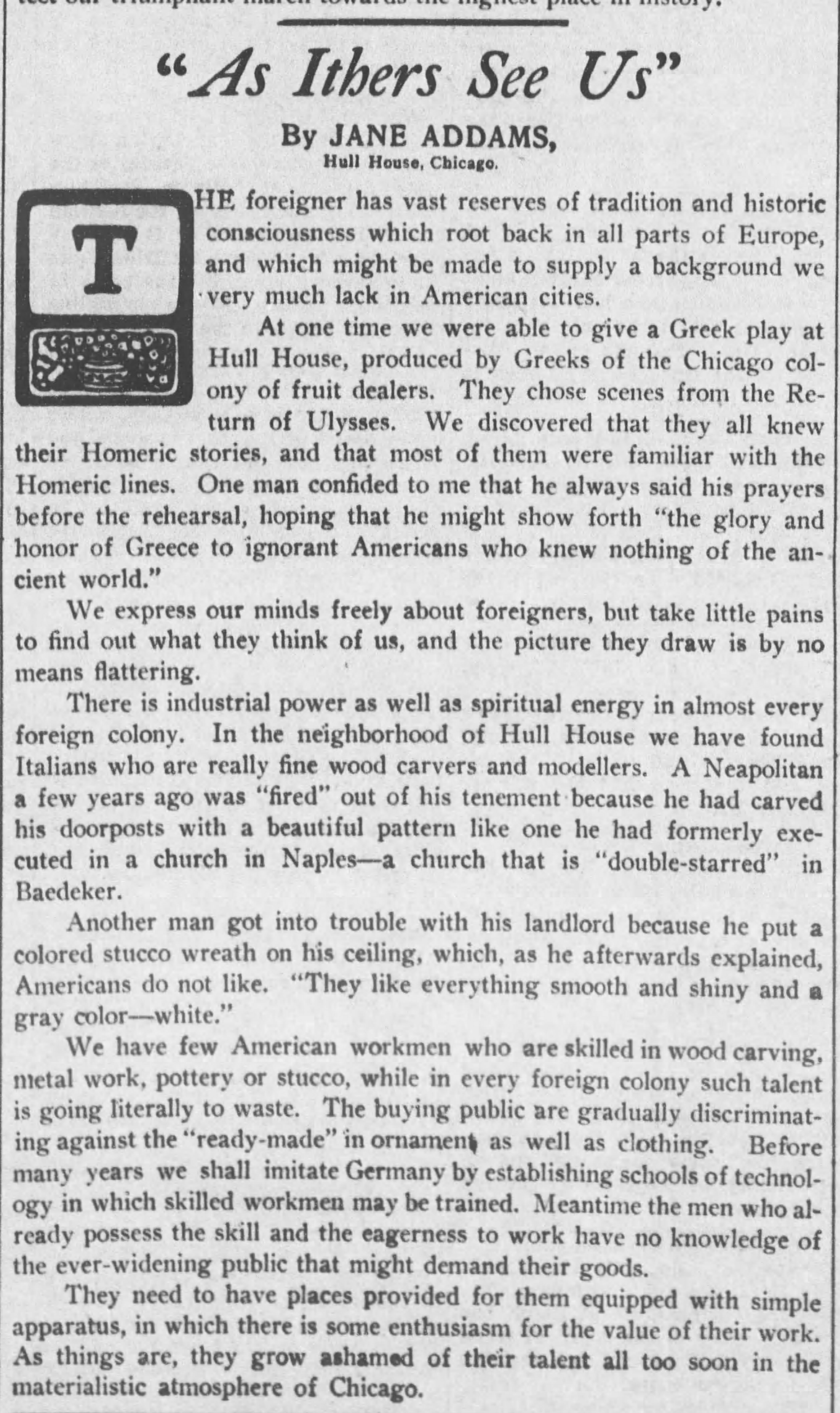 There is industrial power as well as spiritual energy in almost every foreign colony. In the neighborhood of Hull House we have found Italians who are really fine wood carvers and [modelers]. A Neapolitan a few years ago was "fired" out of his tenement because he had carved his doorposts with a beautiful pattern like the one he had formerly executed in a church in Naples -- a church that is "double-starred" in Baedeker.