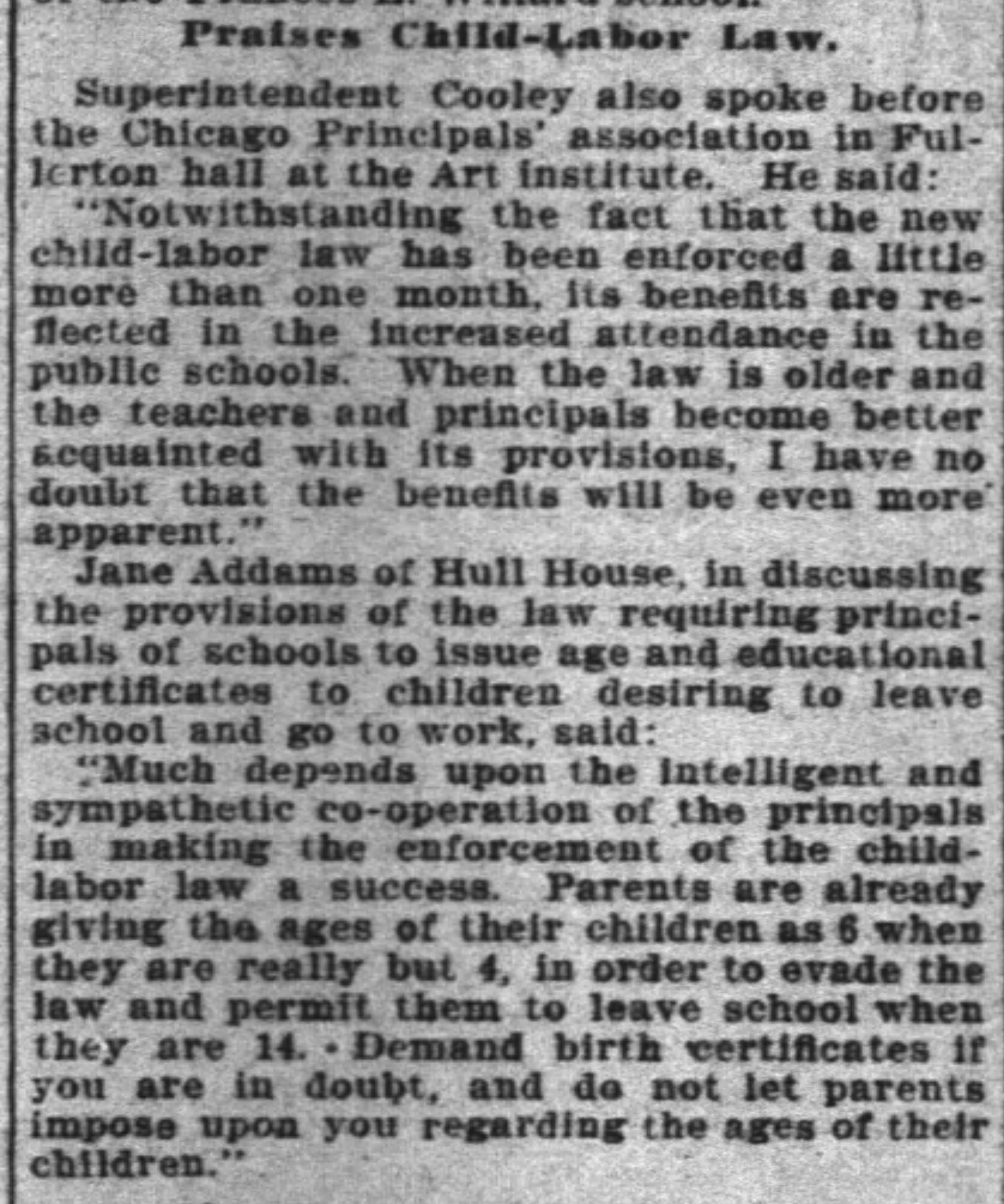 Jane Addams of Hull House, in discussing the provisions of the law requiring principals of schools to issue age and educational certificates to children desiring to leave school and go to work, said: