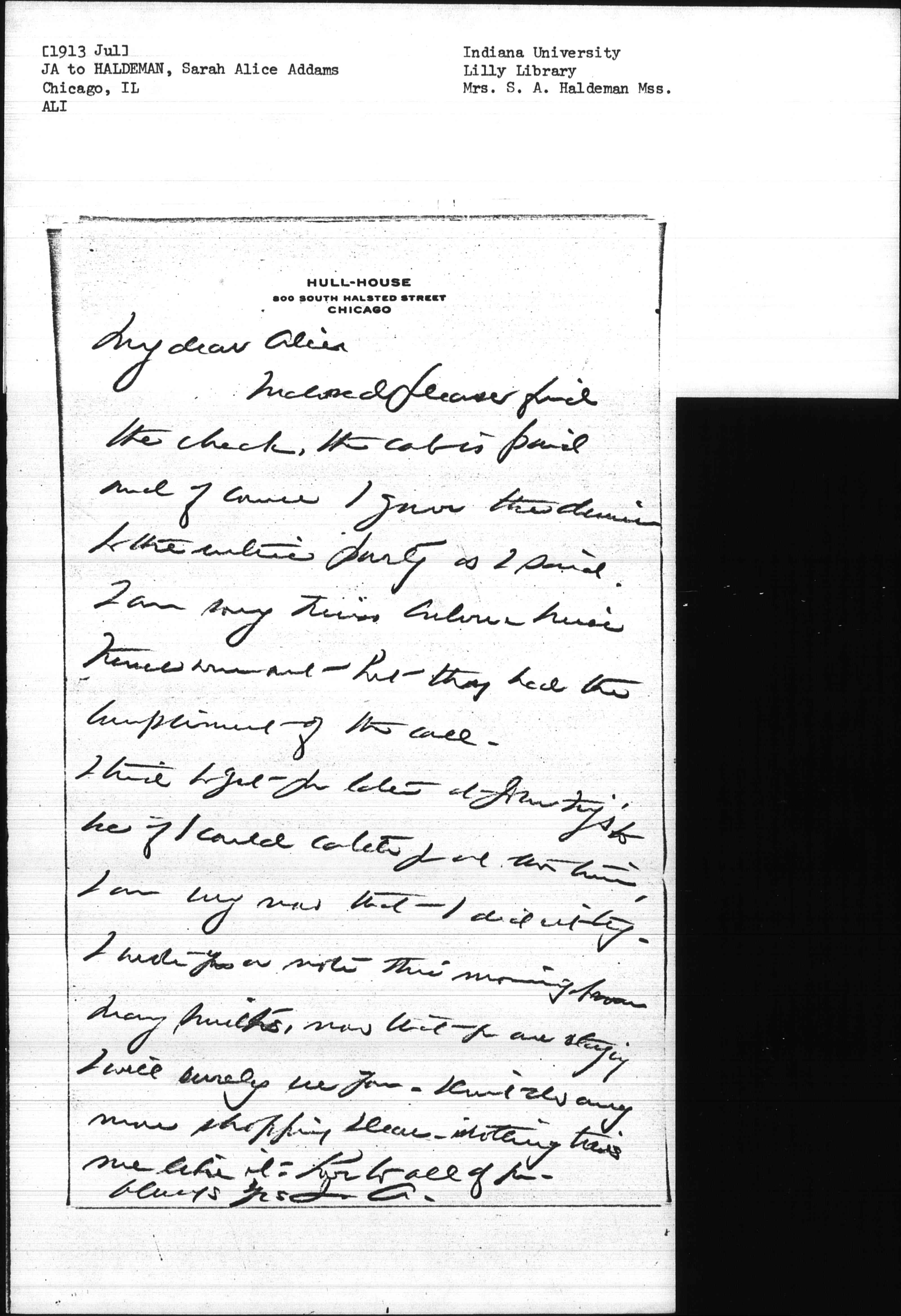 [Enclosed] please find the check, the cab is paid and of course I gave the dinner to the entire party as I said. I am sorry Miss Culver & Miss French were out but they had they had the compliment of the call.