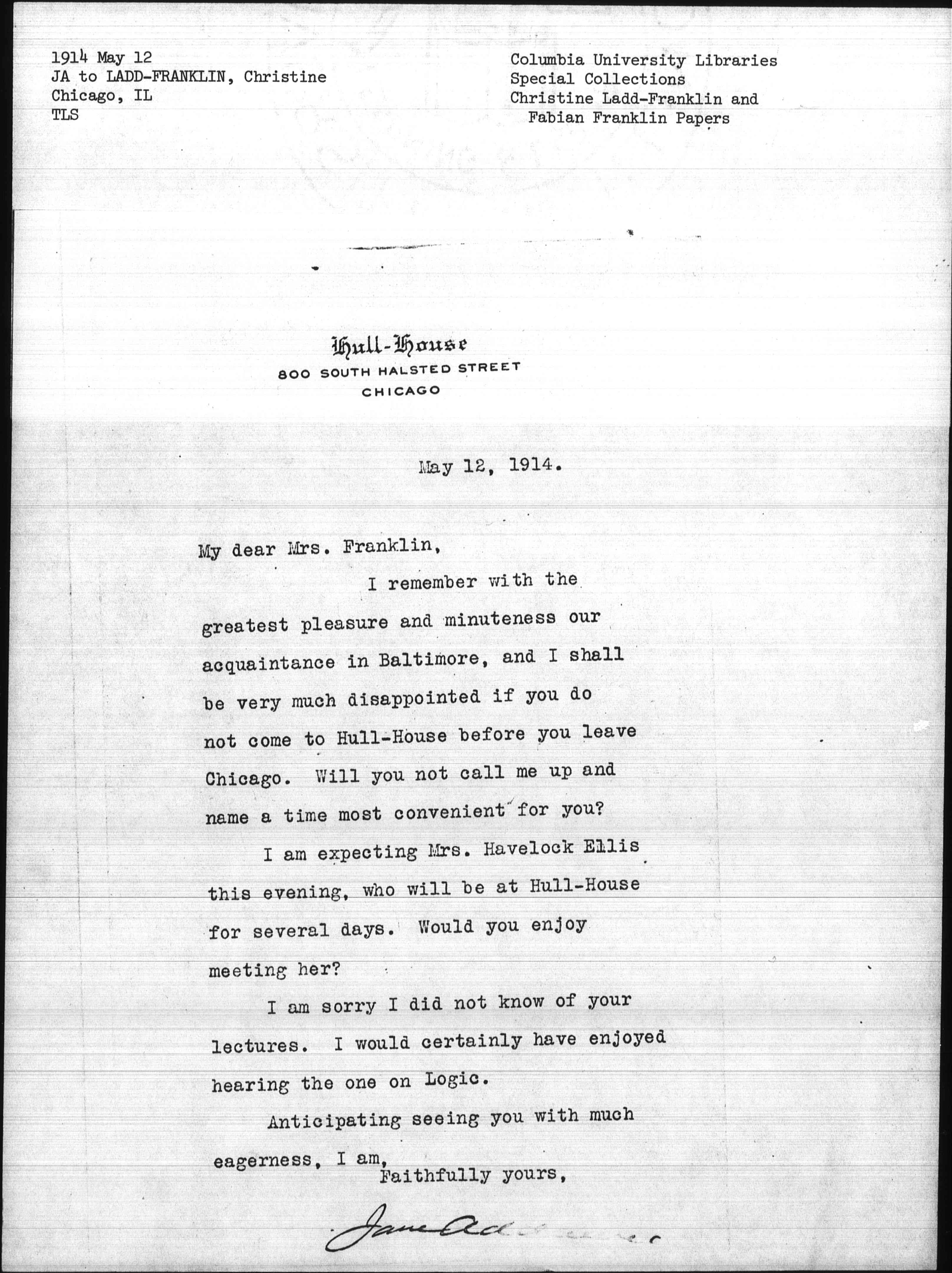 I am expecting Mrs. Havelock Ellis this evening, who will be at Hull-House for several days. Would you enjoy meeting her?