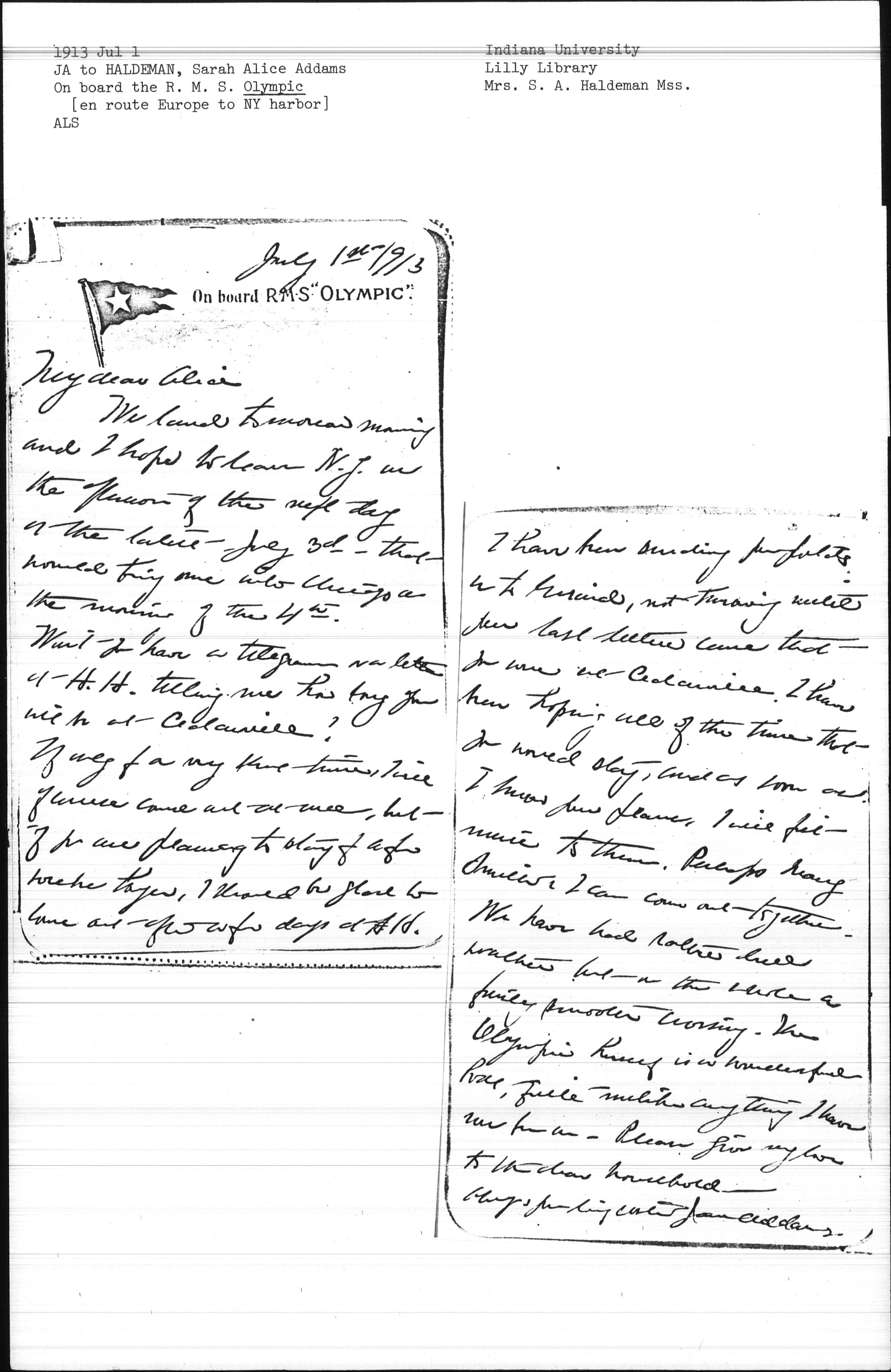 If only for a very short time, I will of course come out at once, but if you are planning to stay for a few weeks longer, I should be glad to come out after a few days at H. H. [page 2] I have been sending pamphlets on to Girard, not knowing until your last letters came that you were at Cedarville. I have been hoping all of the time that you would stay, and as soon as I know your plans, I will fit mine to them. Perhaps Mary Smith & I can come out together. We have had rather dull weather but on the whole a fairly smooth crossing. The Olympic herself is a wonderful boat, quite unlike anything I have ever been on. Please give my love to the dear household.
