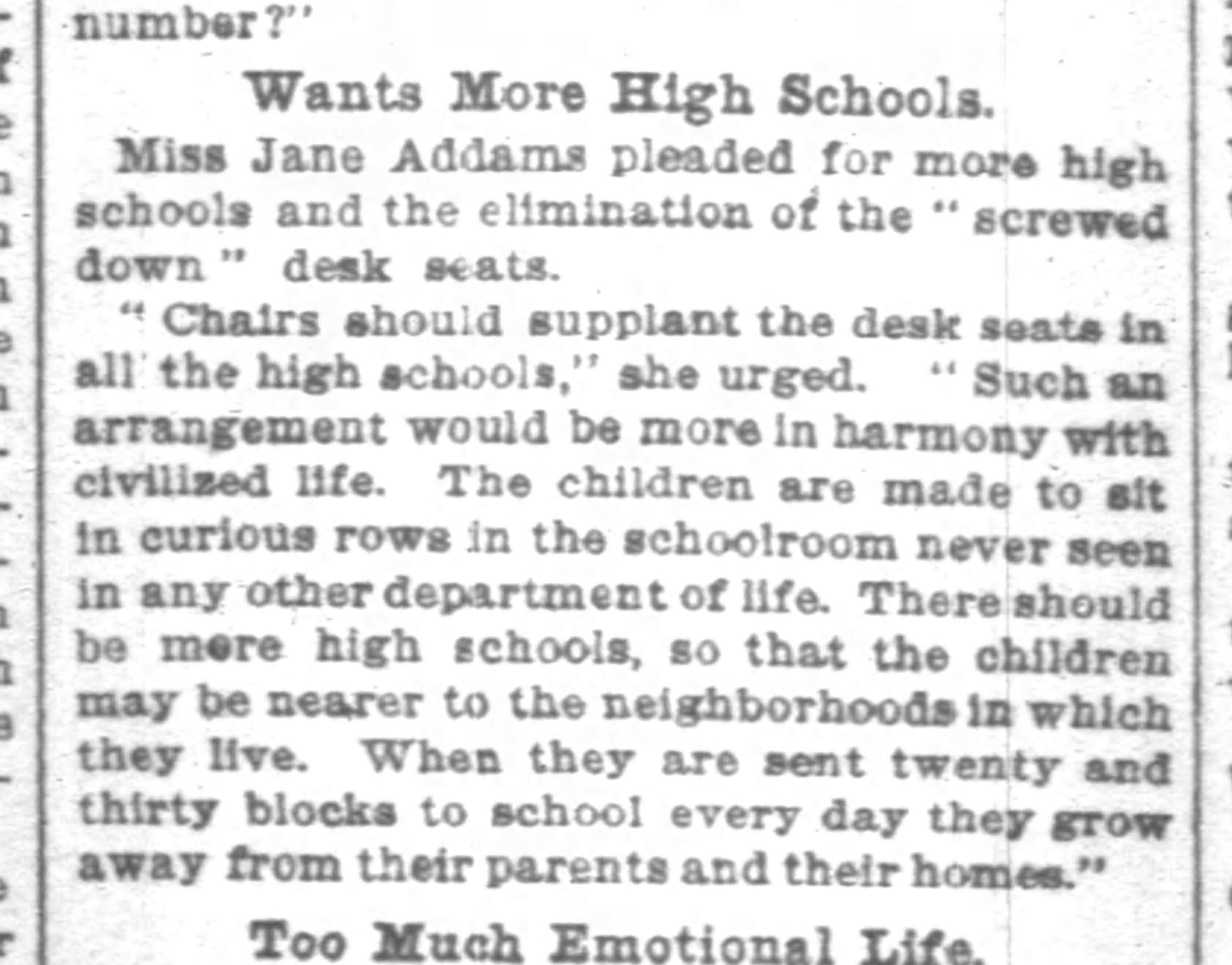 Miss Jane Addams pleaded for more high schools and the elimination of the "screwed down" desk seats.