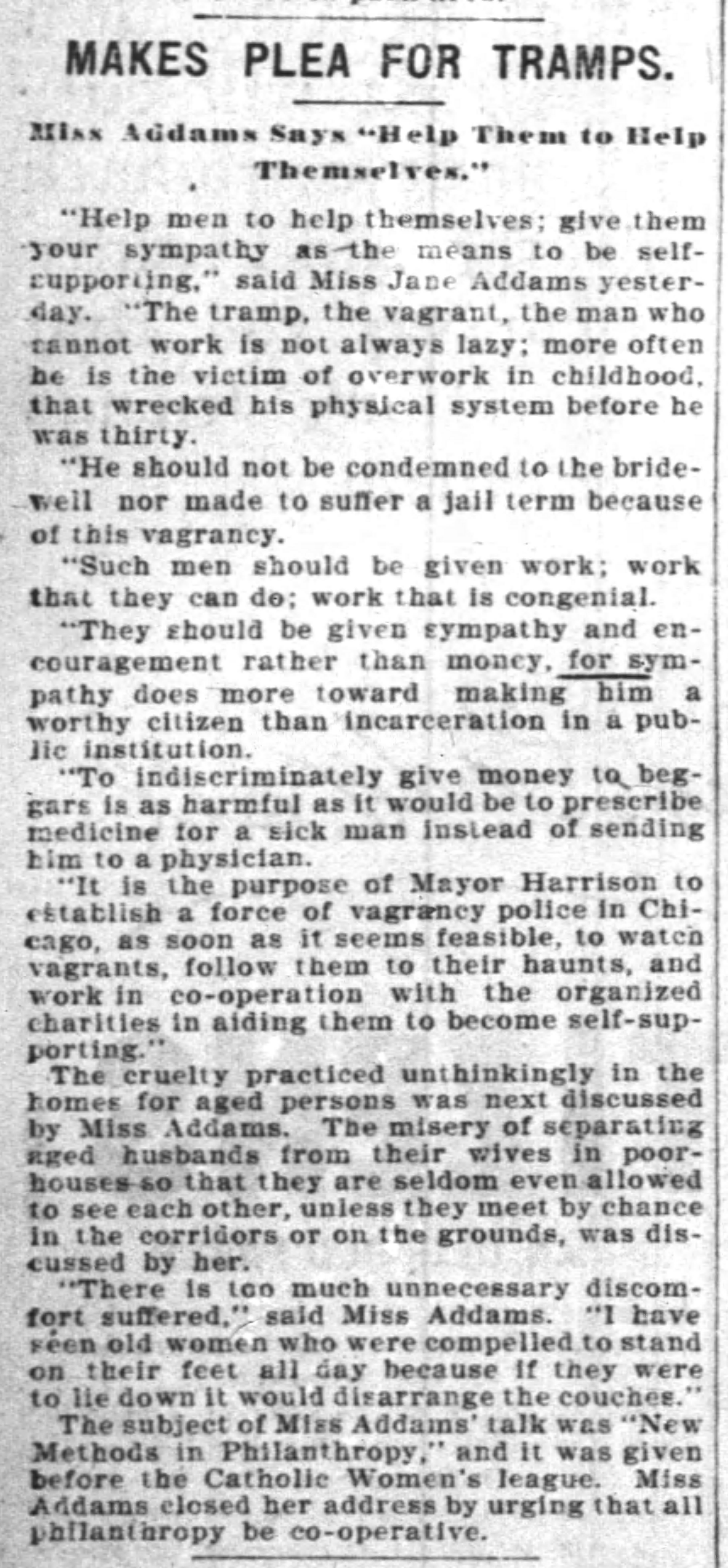 "Help men to help themselves; give them your sympathy as the means to be self-supporting," said Jane Addams yesterday. "The tramp, the vagrant, the man who cannot work is not always lazy; more often he is the victim of overwork in childhood, that wrecked his physical system before he was thirty.