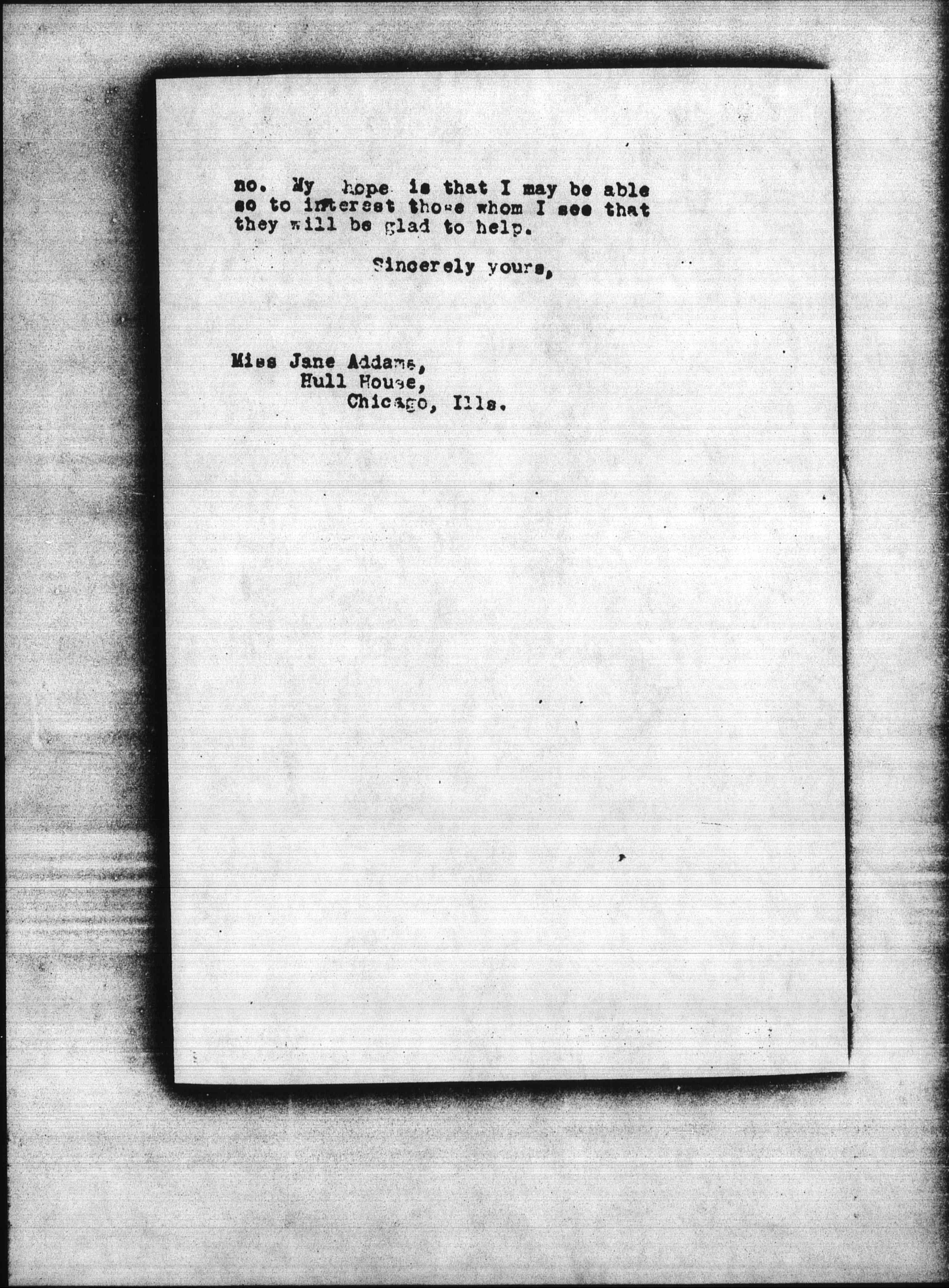 I shall be very grateful for any suggestions which you may give me by which I may get a chance to present our work to some of the people in Chicago who, if they felt so disposed, might help us financially. I should like to speak before any interested club or group of people or even in church gatherings, and I am writing to Rev. Ozora Davis to see if he can help me in this matter. I do not wish to add one straw to the burdens you carry for the public welfare, and if there is nothing that you can do to get me an introduction to individuals for the purpose I have named, I hope you will say so quite frankly. I never make it difficult for any person whom I approach for aid in our work to say [page 2] no. My hope is that I may be able so to interest those whom I see that they will be glad to help.