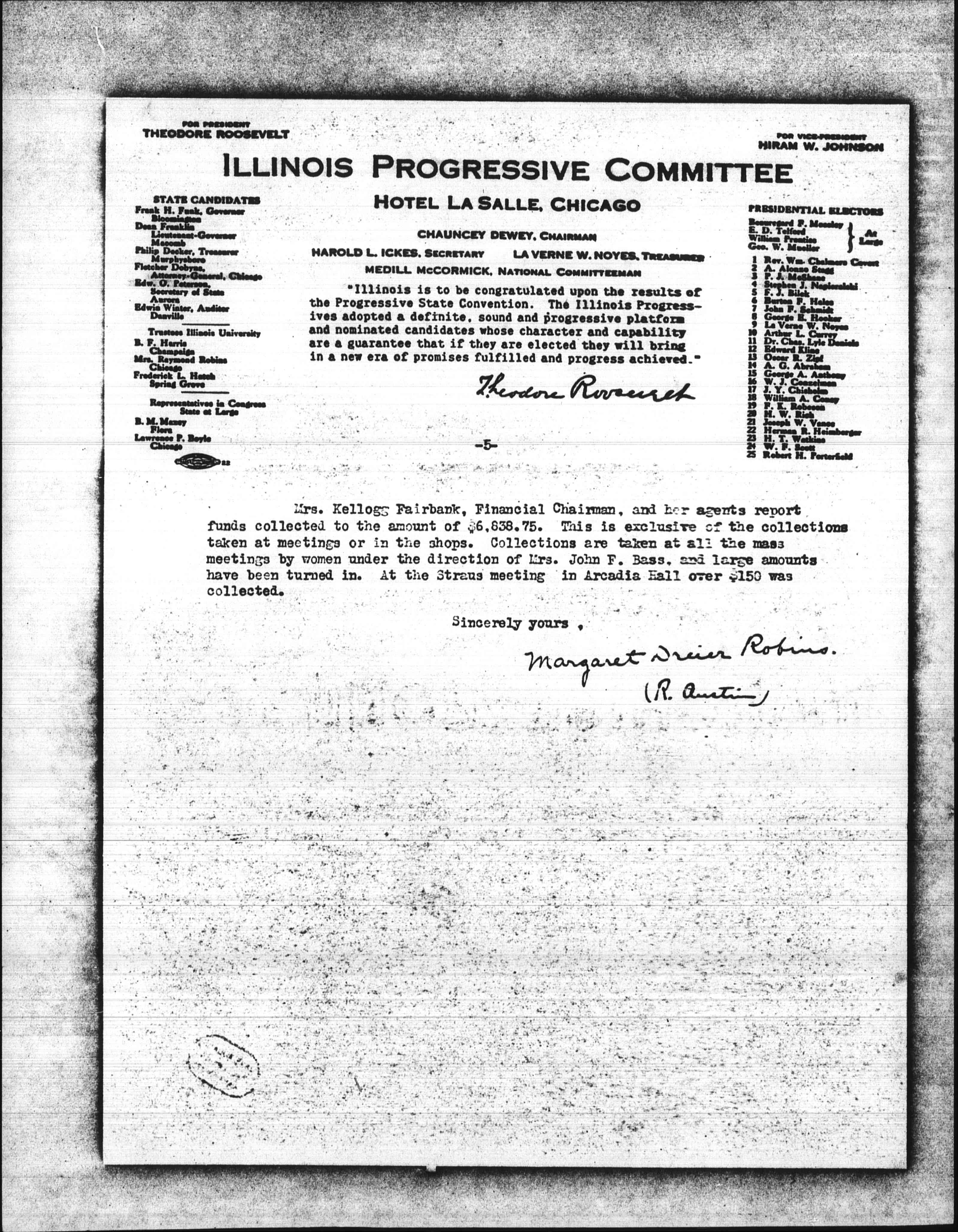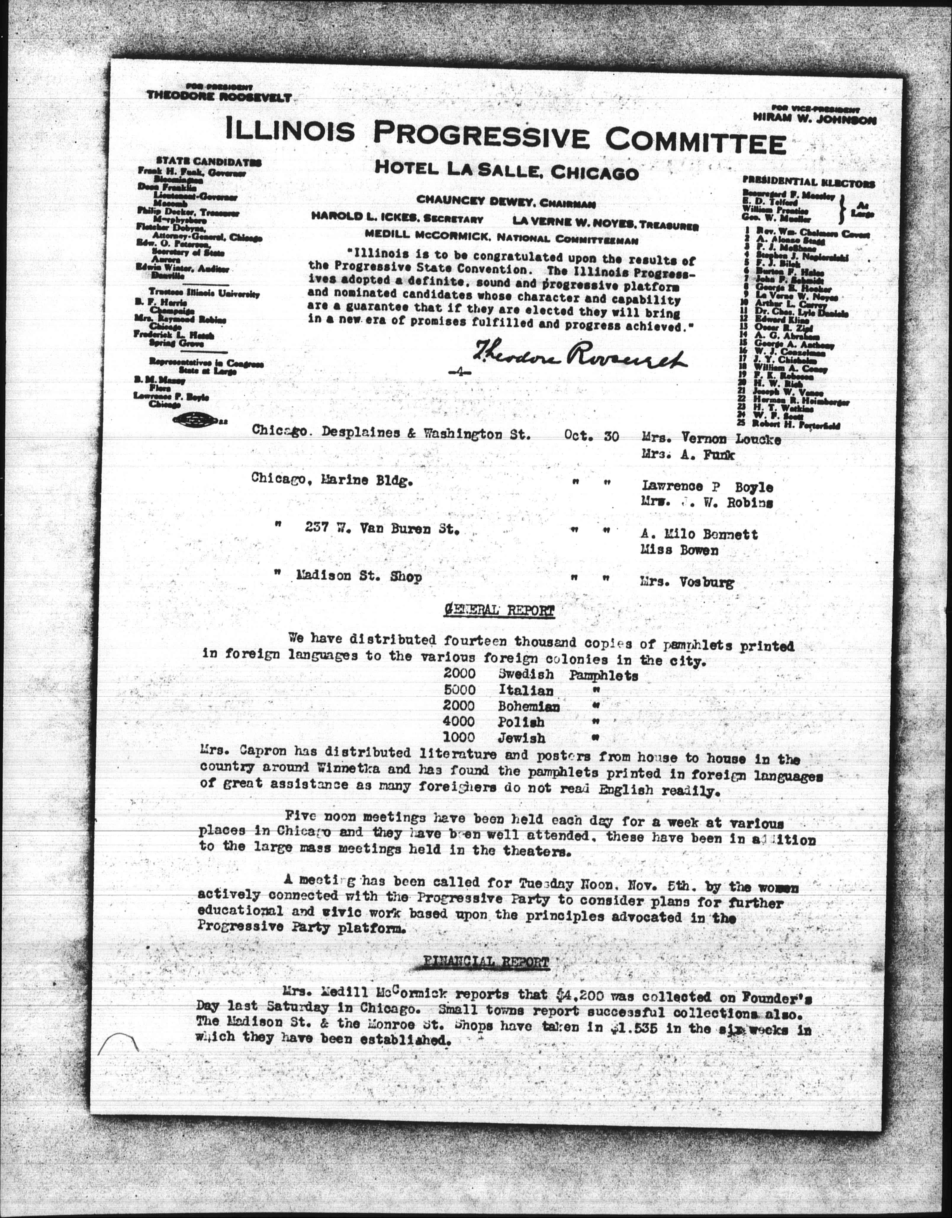 Mrs. Kellogg Fairbank, Financial Chairman, and her agents report funds collected to the amount of $6,838.75. This is exclusive of the collections taken at meetings or in the shops. Collections are taken at all the mass meetings by women under the direction of Mrs. John F. Bass, and large amounts have been turned in. At the Straus meeting in Arcadia Hall over $150 was collected.
