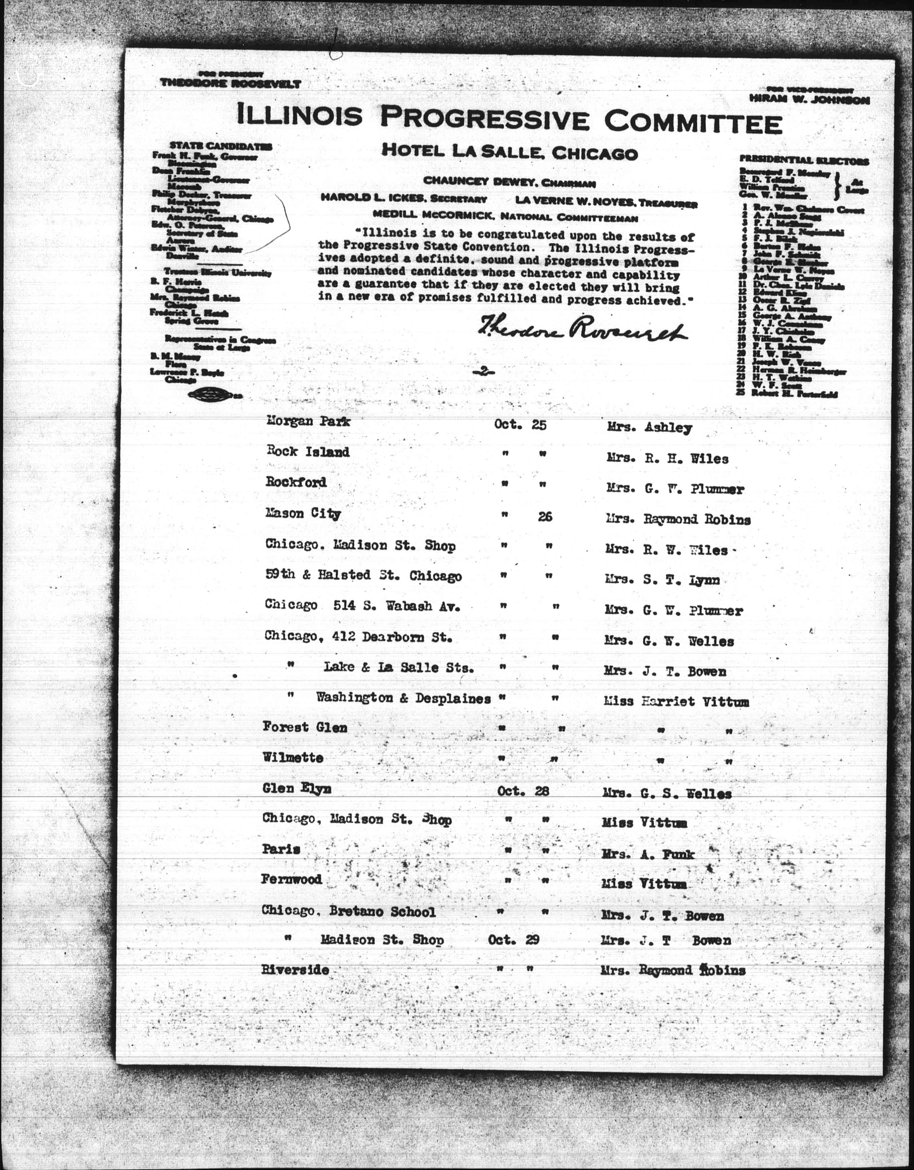 A meeting has been called for Tuesday Noon, Nov. 5th, by the women actively connected with the Progressive Party to consider plans for further educational and civic work based upon the principles advocated in the Progressive Party platform.