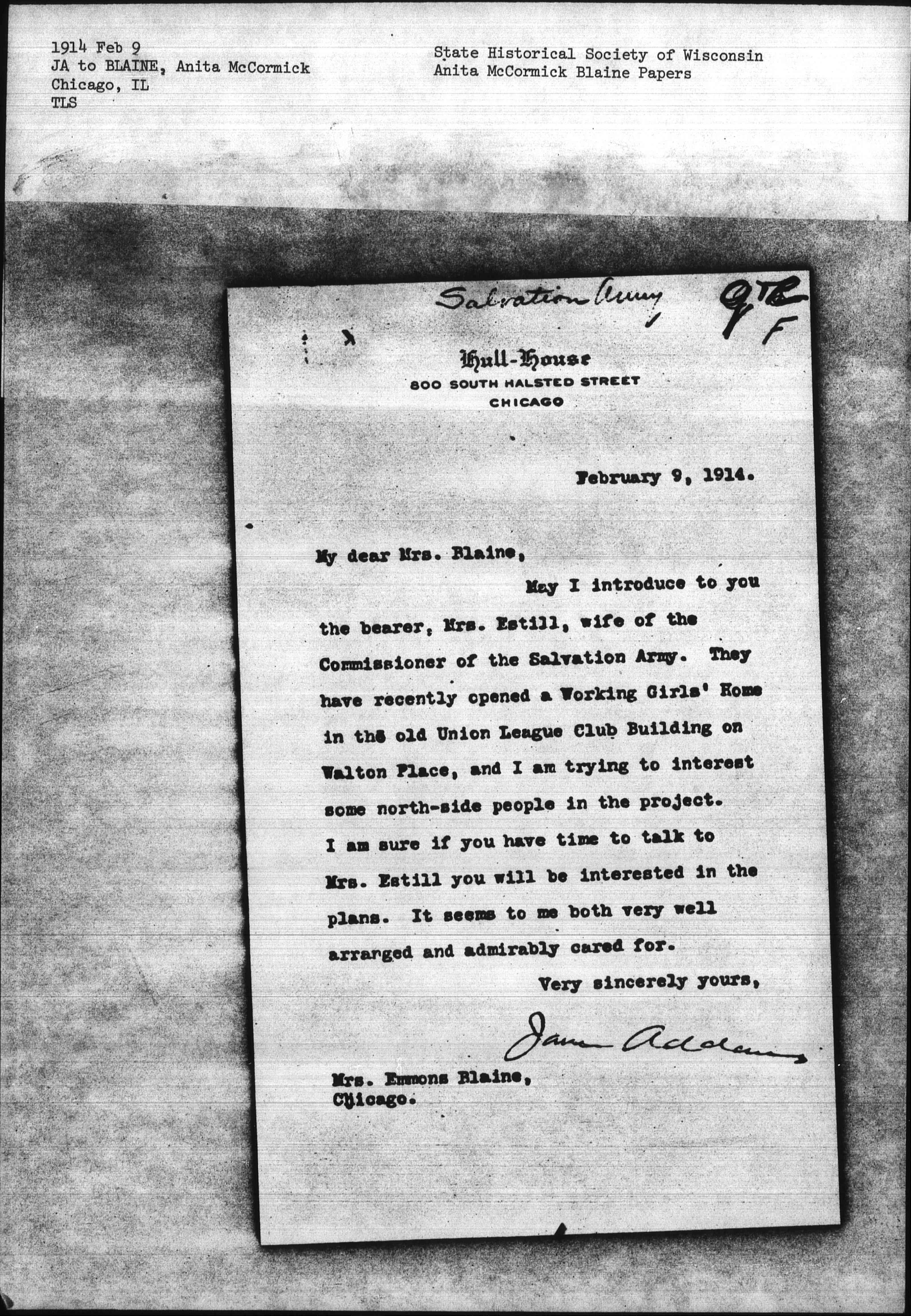 May I introduce to you the bearer, Mrs. Estill, wife of the Commissioner of the Salvation Army. They have recently opened a Working Girls' Home in the old Union League Club Building on Walton Place, and I am trying to interest some north-side people in the project. I am sure if you have time to talk to Mrs. Estill you will be interested in the plans. It seems to me both very well arranged and admirably cared for.
