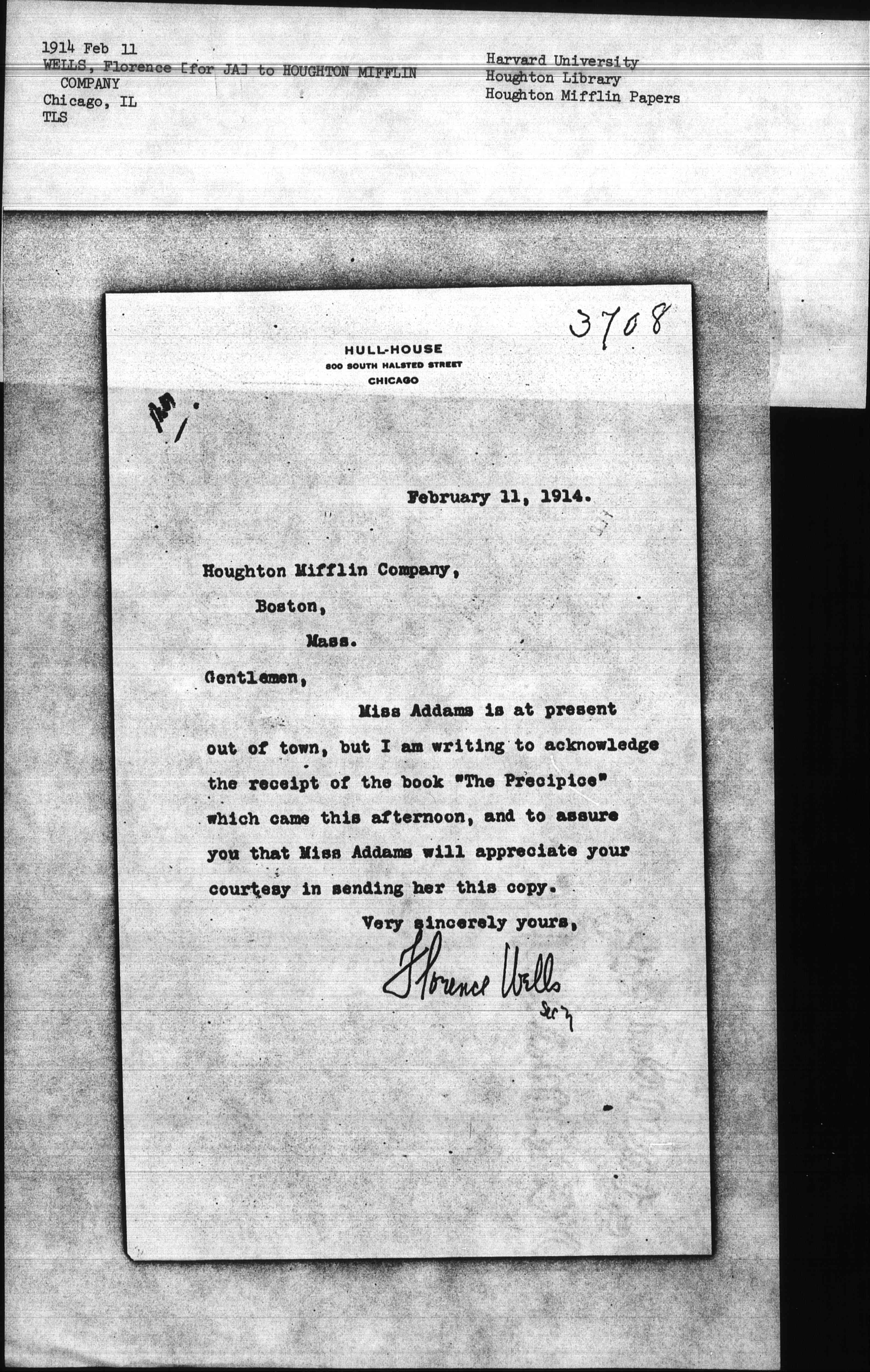 Miss Addams is at present out of town, but I am writing to acknowledge the receipt of the book "The Precipice" which came this afternoon, and to assure you that Miss Addams will appreciate your courtesy in sending her this copy.