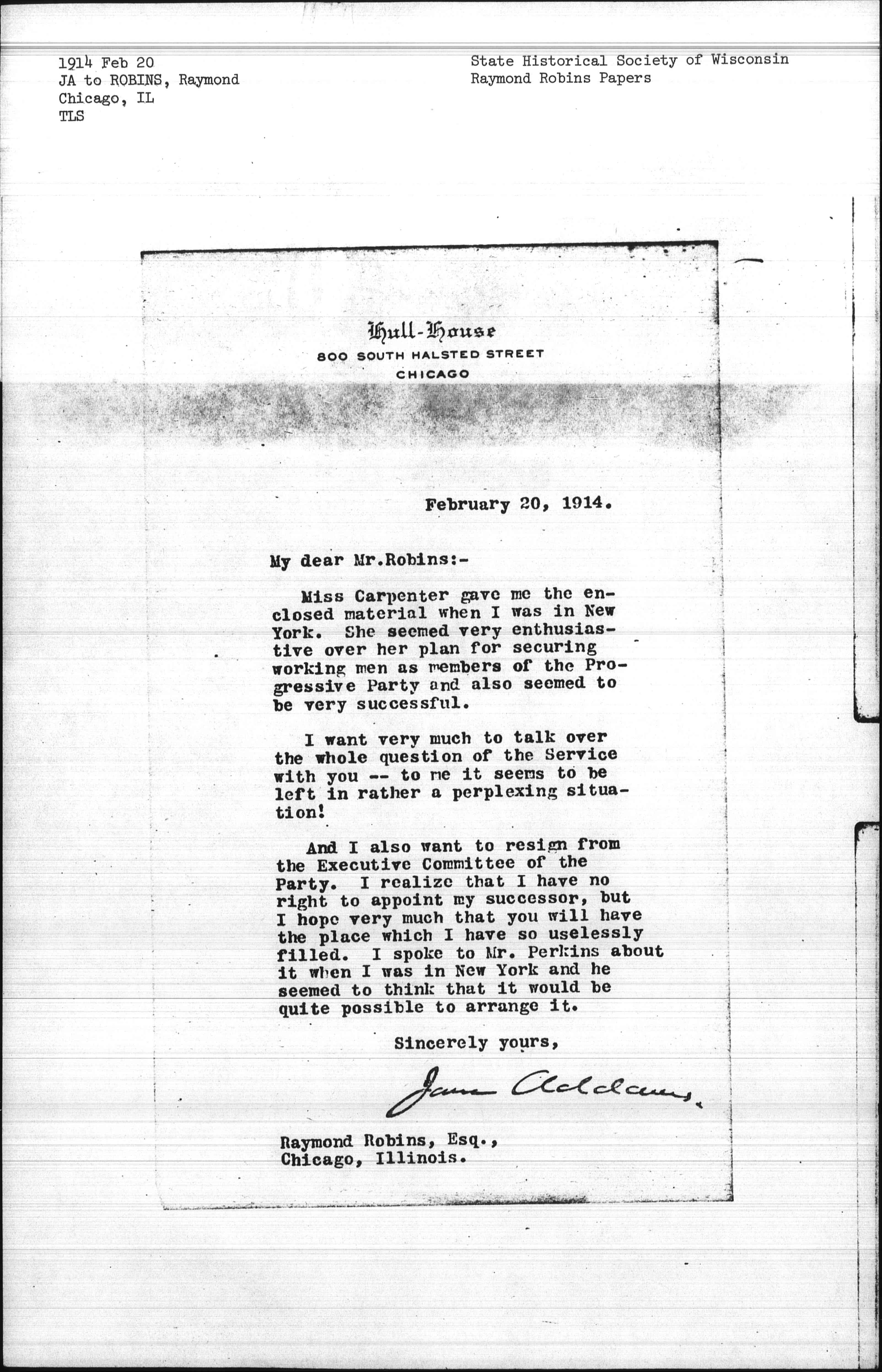 And I also want to resign from the Executive Committee of the Party. I realize that I have no right to appoint my successor, but I hope very much that you will have the place which I have so uselessly filled. I spoke to Mr. Perkins about it when I was in New York and he seemed to think that it would be quite possible to arrange it.
