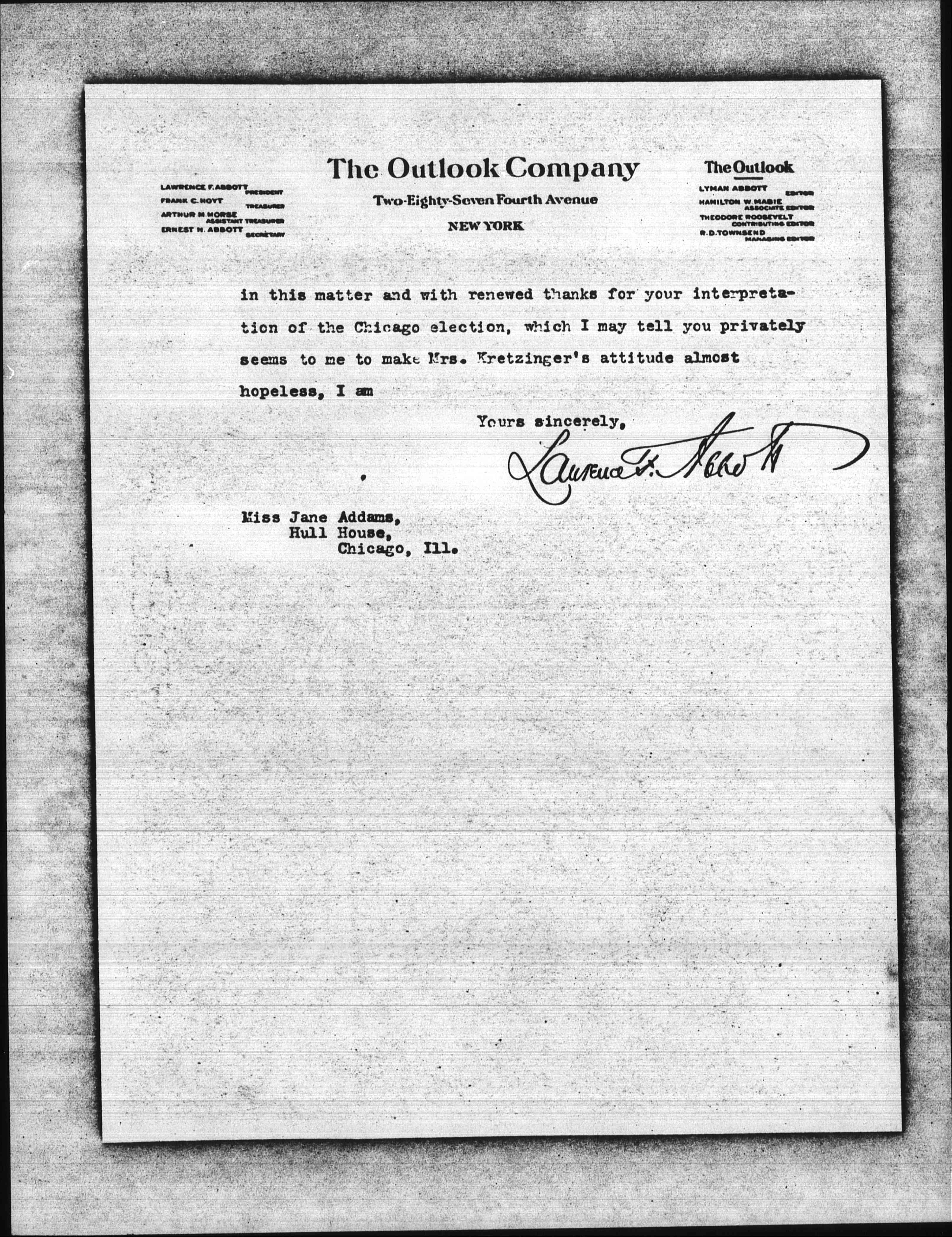 Let me thank you most warmly for your prompt and illuminating response to my telegram sent in the name of The Outlook for information regarding the recent primary election in Chicago. We are printing it together with one from Mrs. Kretzinger, the anti-suffrage advocate, in next week's Outlook.