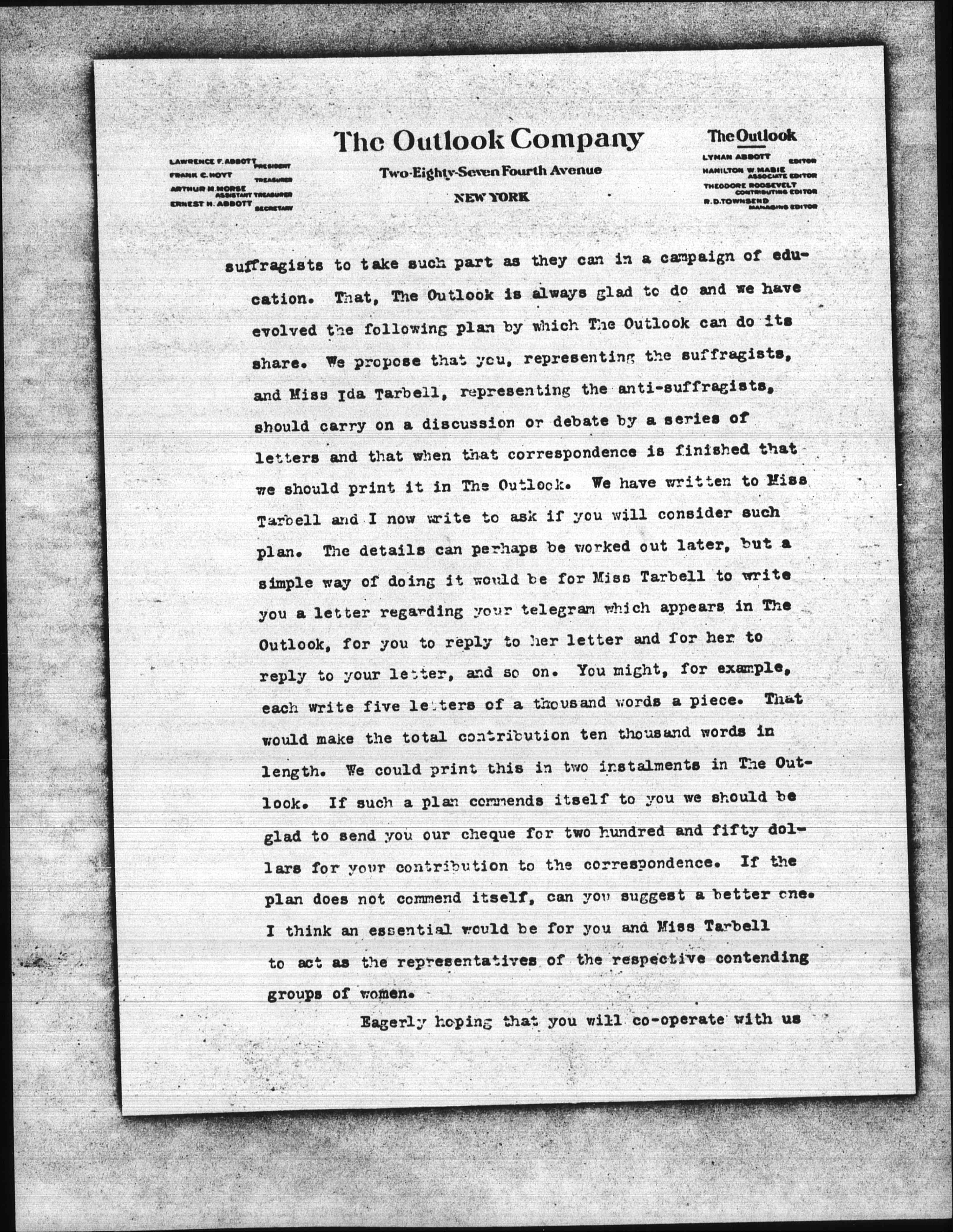 In a democracy a Legislature ought not to impose by law on the majority the wishes of the minority. No State should adopt woman suffrage by legislative enactment until the women have had an opportunity to express their desire by some form of ballot. While my father is philosophically an anti-suffragist and I am philosophically a pro-suffragist we can both work together on the platform thus stated. If that platform is, at least as far as it goes, a practical and logical one, it follows that it is the duty of all [page 2] suffragists to take such part as they can in a campaign of education. That, The Outlook is always glad to do and we have evolved the following plan by which The Outlook can do its share. We propose that you, representing the suffragists, and Miss Ida Tarbell, representing the anti-suffragists, should carry on a discussion or debate by a series of letters and that when that correspondence is finished that we should print it in The Outlook. We have written to Miss Tarbell and I now write to ask if you will consider such plan. The details can perhaps be worked out later, but a simple way of doing it would be for Miss Tarbell to write you a letter regarding your telegram which appears in The Outlook, for you to reply to her letter and for her to reply to your letter, and so on. You might, for example, each write five letters of a thousand words a piece. That would make the total contribution ten thousand words in length. We could print this in two instalments in The Outlook. If such a plan commends itself to you we should be glad to send you our [check] for two hundred and fifty dollars for your contribution to the correspondence. If the plan does not command itself, can you suggest a better one. I think an essential would be for you and Miss Tarbell to act as the representatives of the respective contending groups of women.