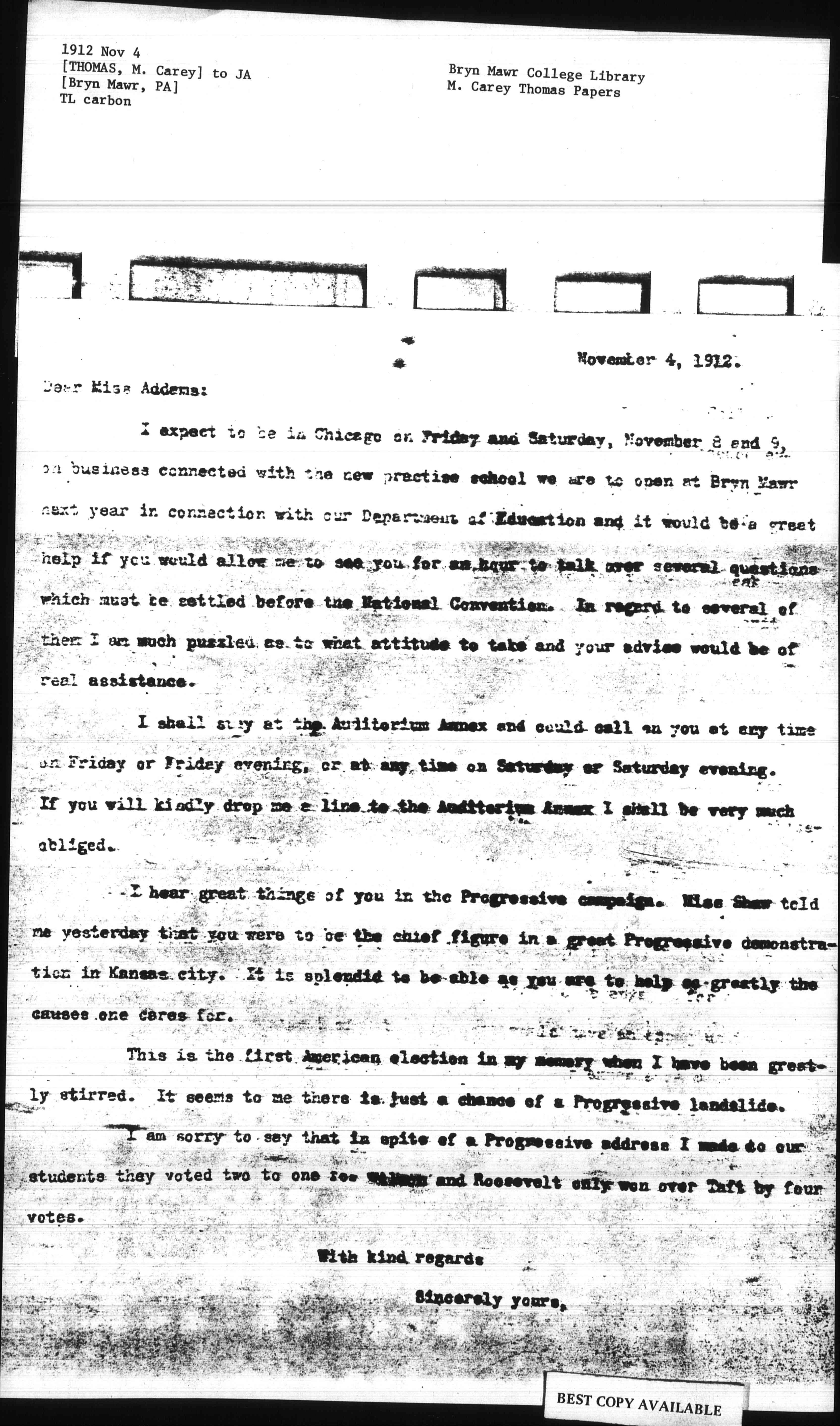 I expect to be in Chicago on Friday and Saturday, November 8 and 9, on business connected with the new practice school we are to open at Bryn Mawr next year in connection with our Department of Education and it would a great help if you would allow me to see you for an hour to talk over several questions which must be settled before the National Convention. In regard to several of them I am much puzzled as to what attitude to take and your advice would be of real assistance.