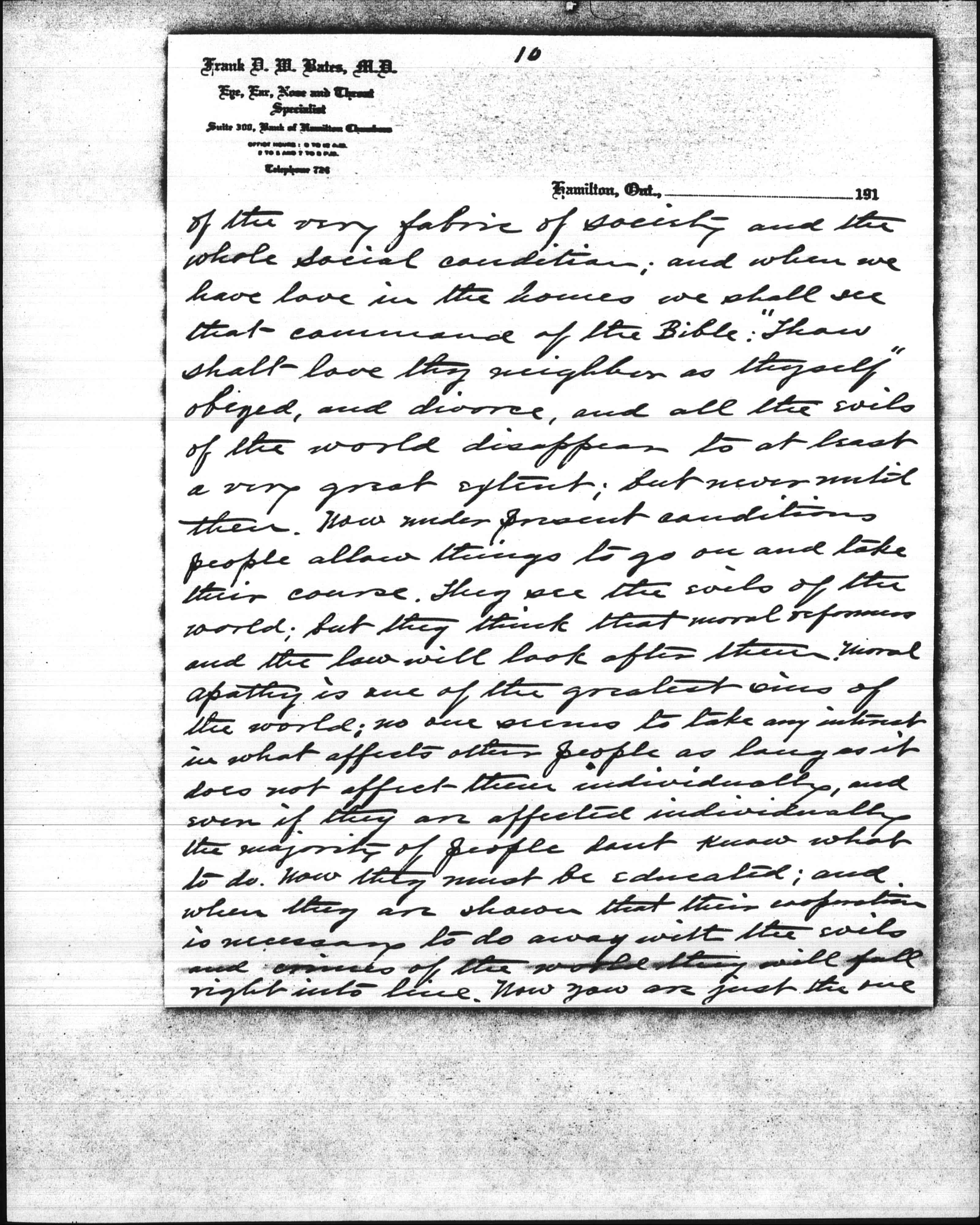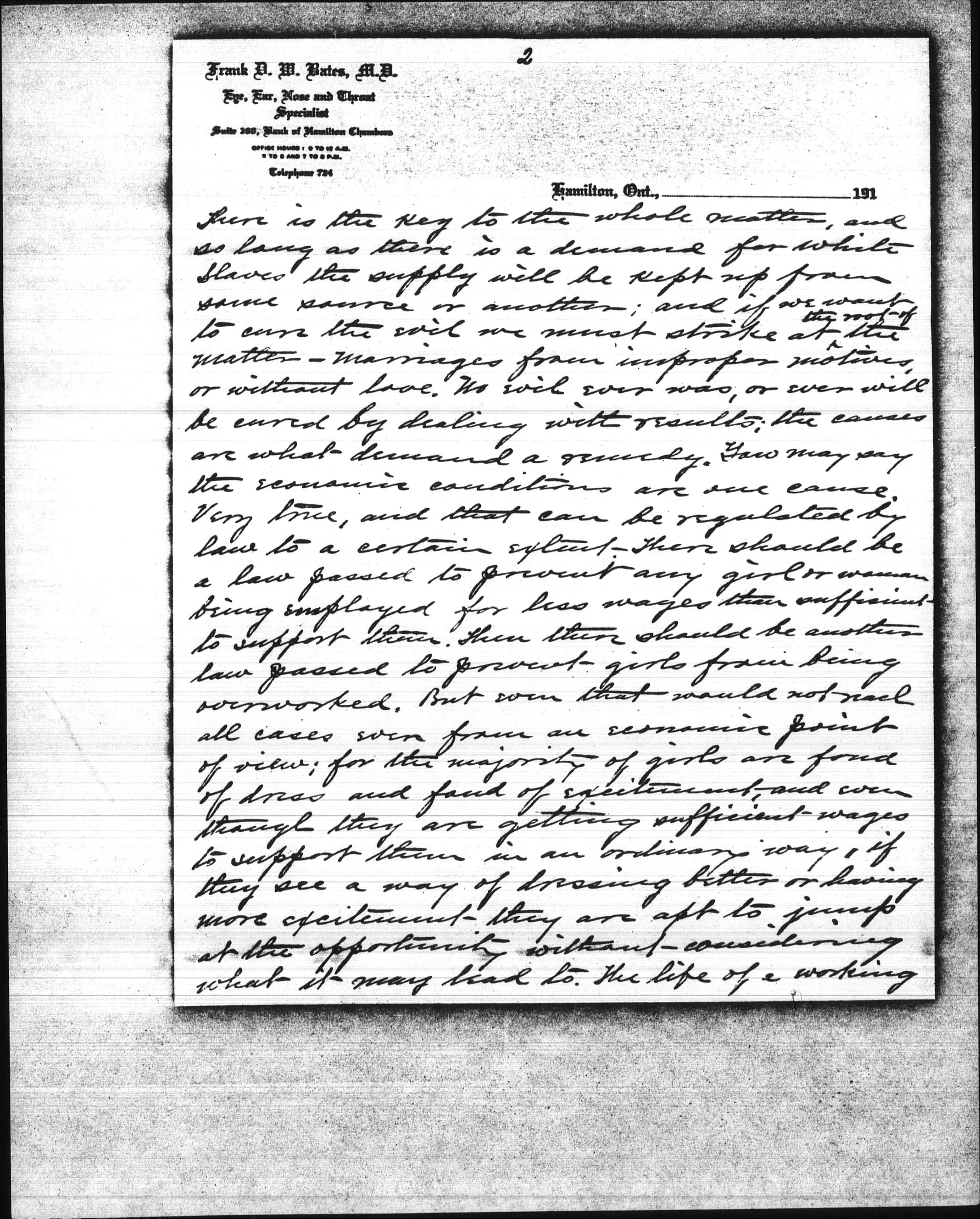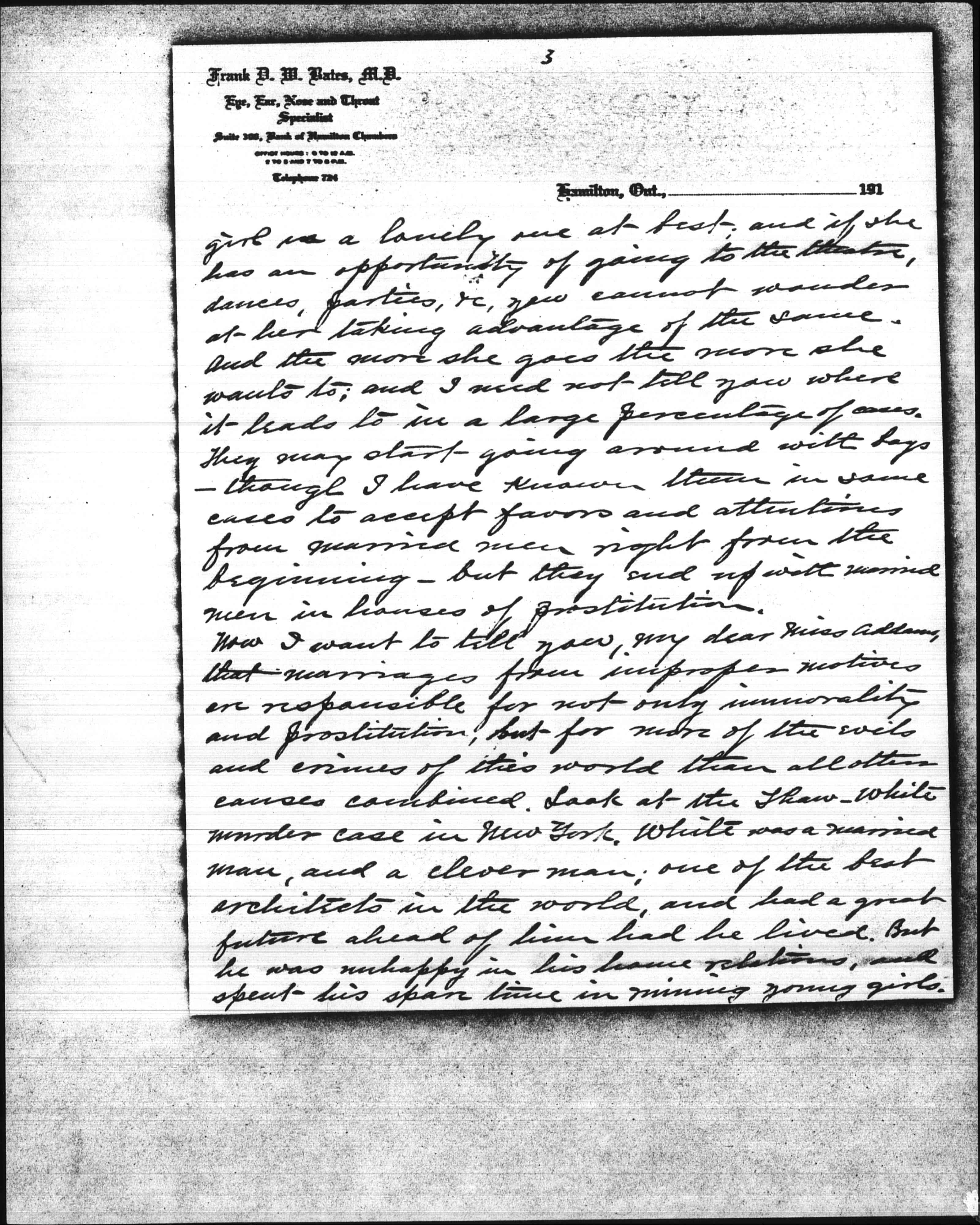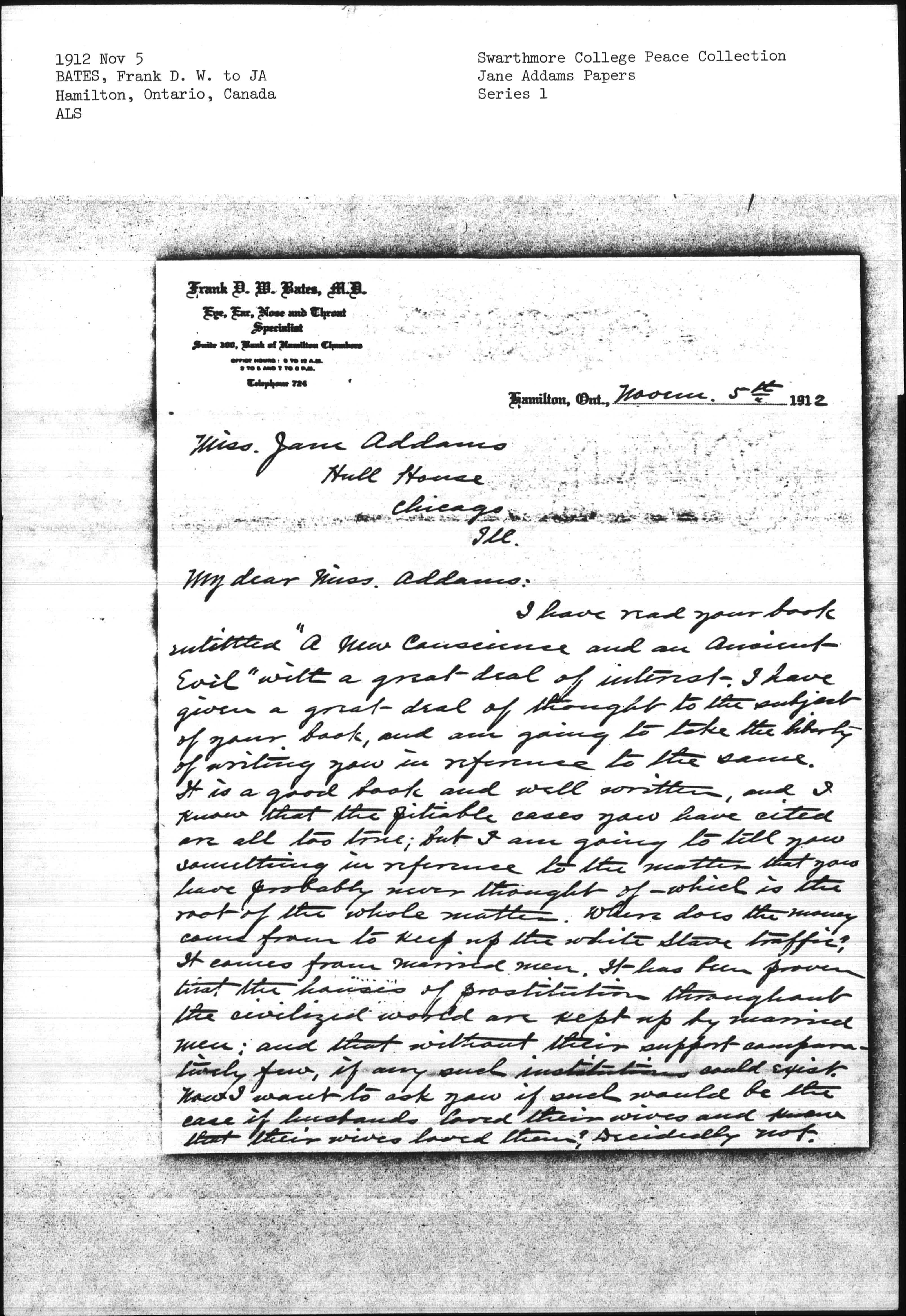 I have read your book entitled "A New Conscience and an Ancient Evil" with a great deal of interest. I have given a great deal of thought to the subject of your book, and am going to take the liberty of writing you in reference to the same. It is a good book and well written, and I know that the pitiable cases you have cited are all too true; but I am going to tell you something in reference to the matter that you have probably never thought of which is the root of the whole matter. Where does the money come from to keep up the white slave traffic? It comes from married men. It has been proven that the houses of prostitution throughout the civilized world are kept up by married men; and that without their support comparatively few, if any such institutions could exist. Now I want to ask you if such would be the case if husbands loved their wives and knew that their wives loved them? Decidedly not. [page 2] There is the key to the whole matter, and so long as there is a demand for white slaves the supply will be kept up from some source or another; and if we want to cure] the evil we must strike at <the root of> the matter -- marriages from improper motives, or without love. No evil ever was, or ever will be cured by dealing with results; the causes are what demand a remedy. You may say the economic conditions are one cause. Very true, and that can be regulated by law to a certain extent. There should be a law passed to prevent any girl or woman being employed for less wages than sufficient to support them. Then there should be another law passed to prevent girls from being overworked. But even that would not reach all cases even from an economic point of view; for the majority of girls are fond of dress and fond of excitement, and even though they are getting sufficient wages to support them in an ordinary way, if they see a way of dressing better or having more excitement they are apt to jump at the opportunity without considering what it may lead to. The life of a working [page 3] girl is a lonely one at best, and if she has an opportunity of going to the [theater], dances, parties, &c, you cannot wonder at her taking advantage of the same. And the more she goes the more she wants to; and I need not tell you where it leads to in a large percentage of cases. They may start going around with boys -- though I have known them in some cases to accept favors and attentions from married men right from the beginning -- but they end up with married men in houses of prostitution.