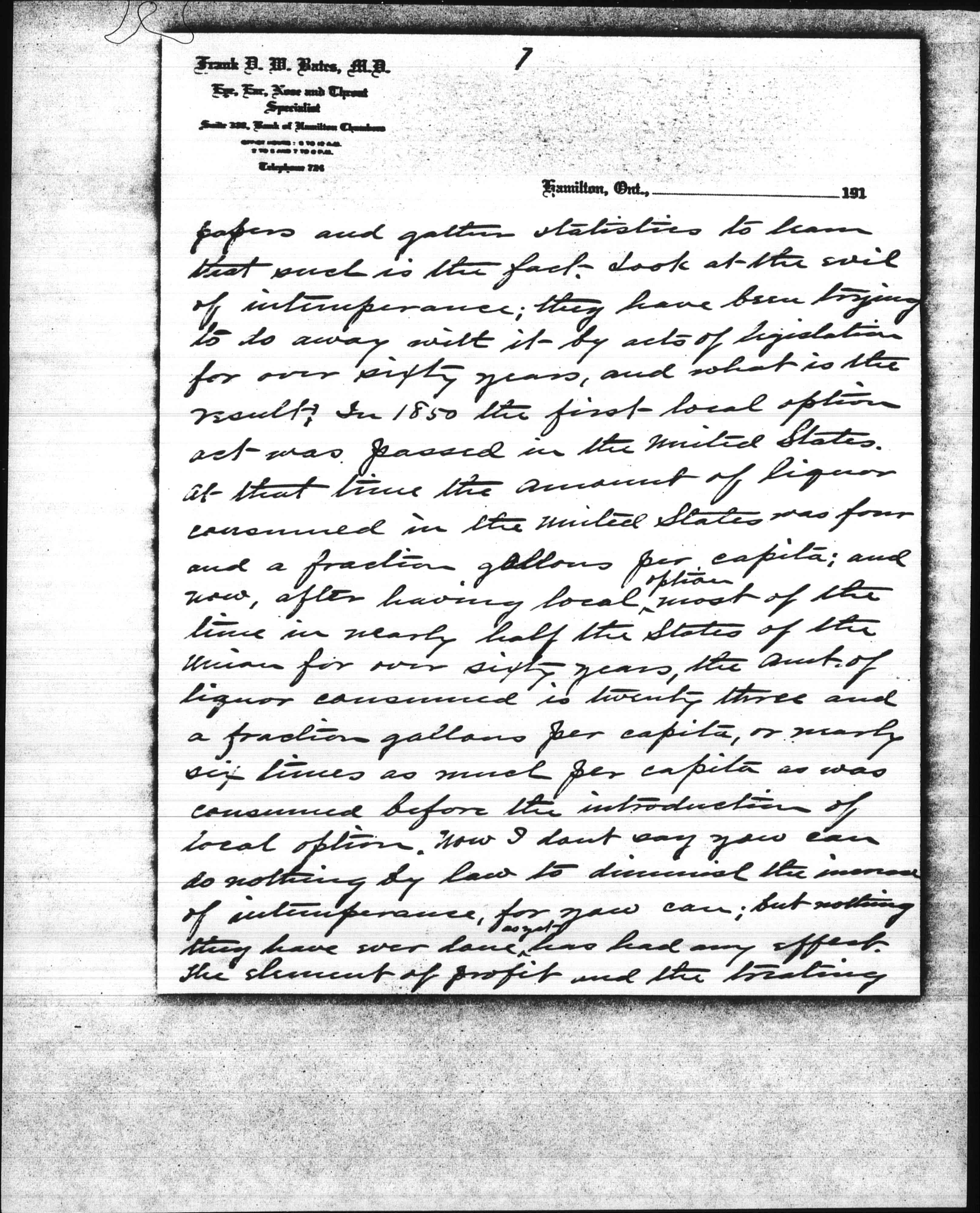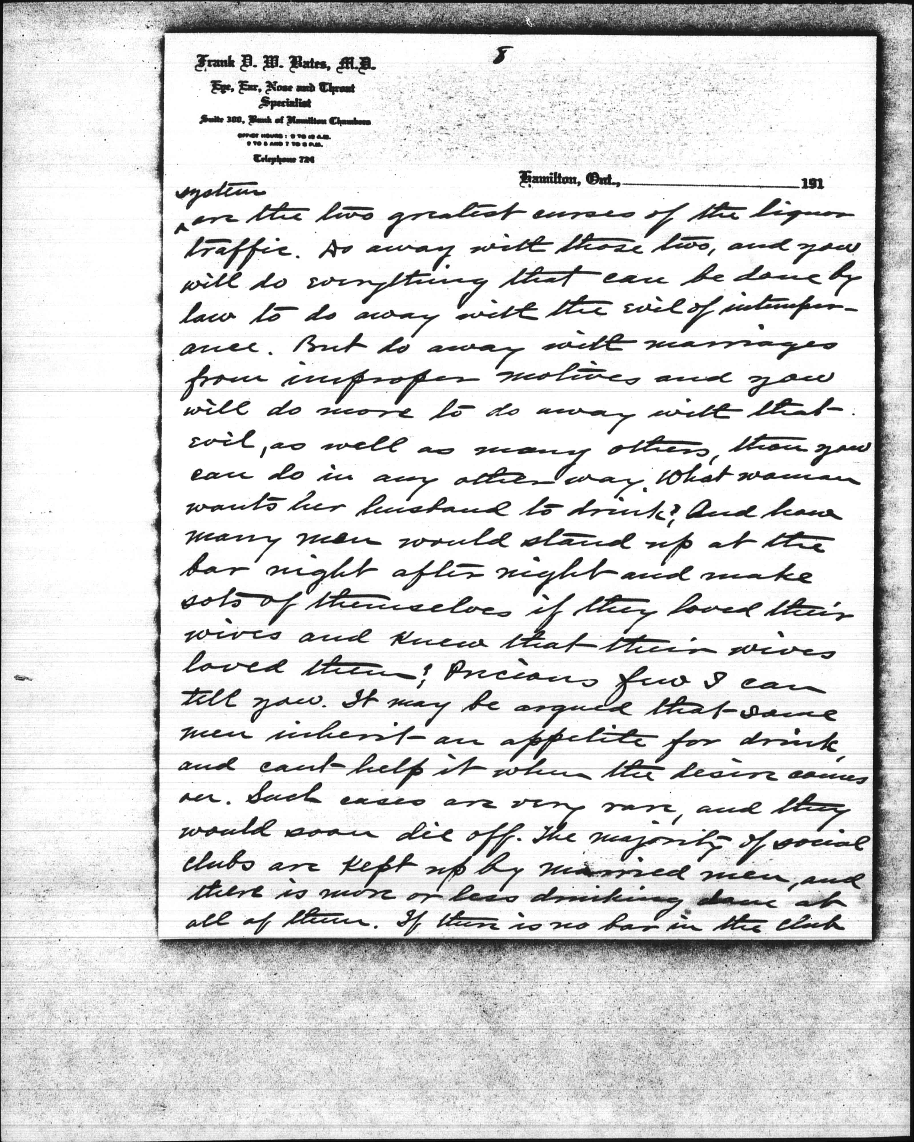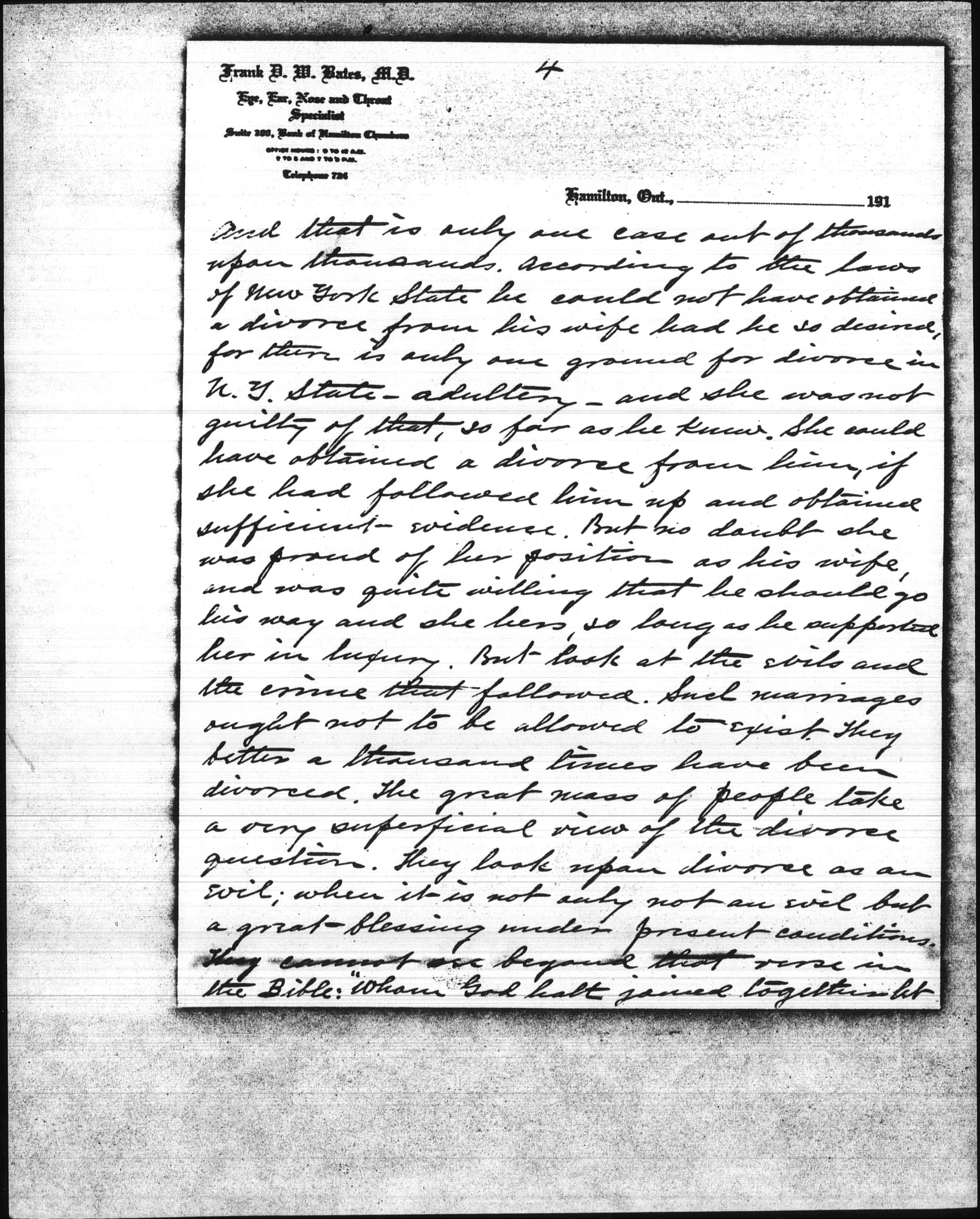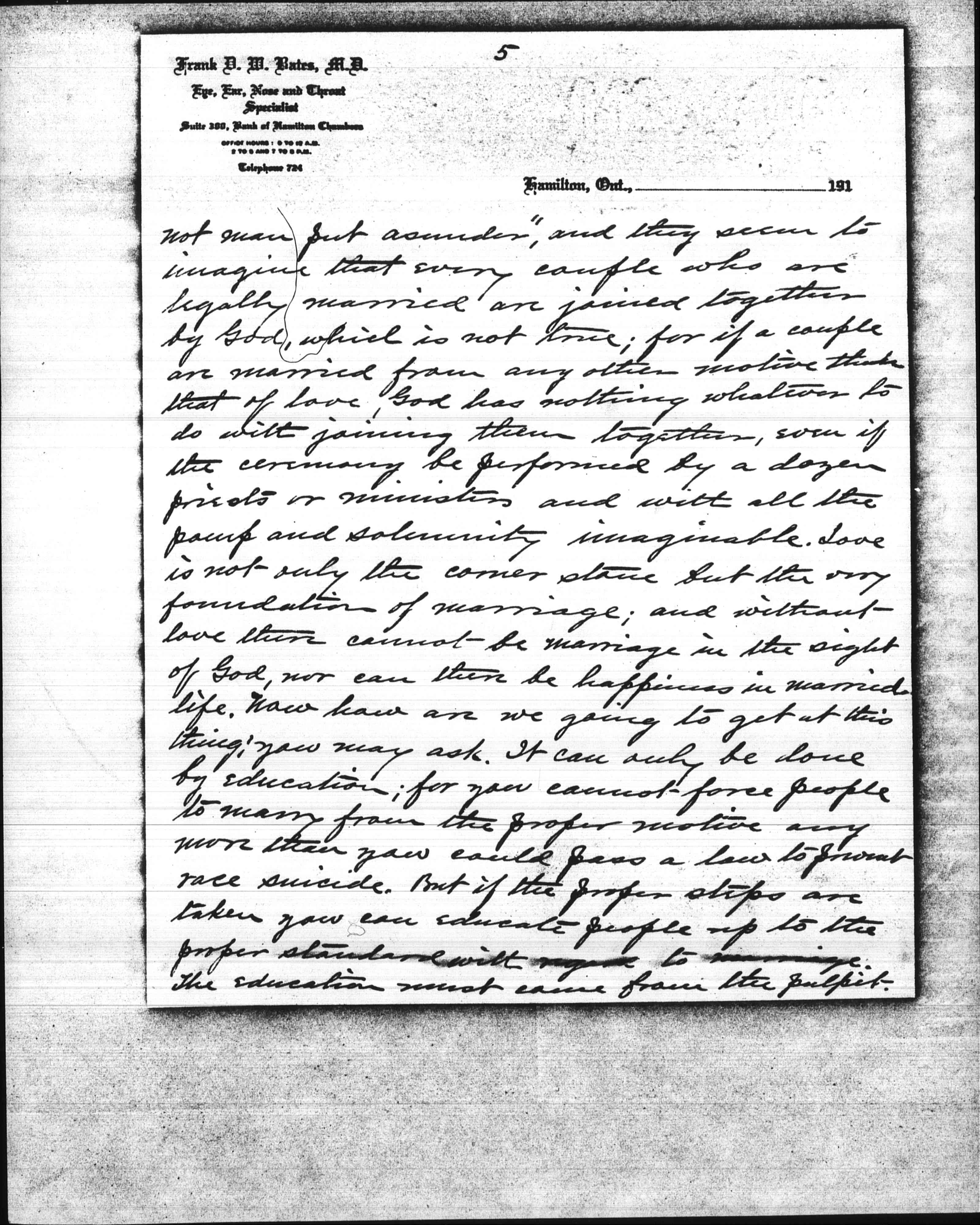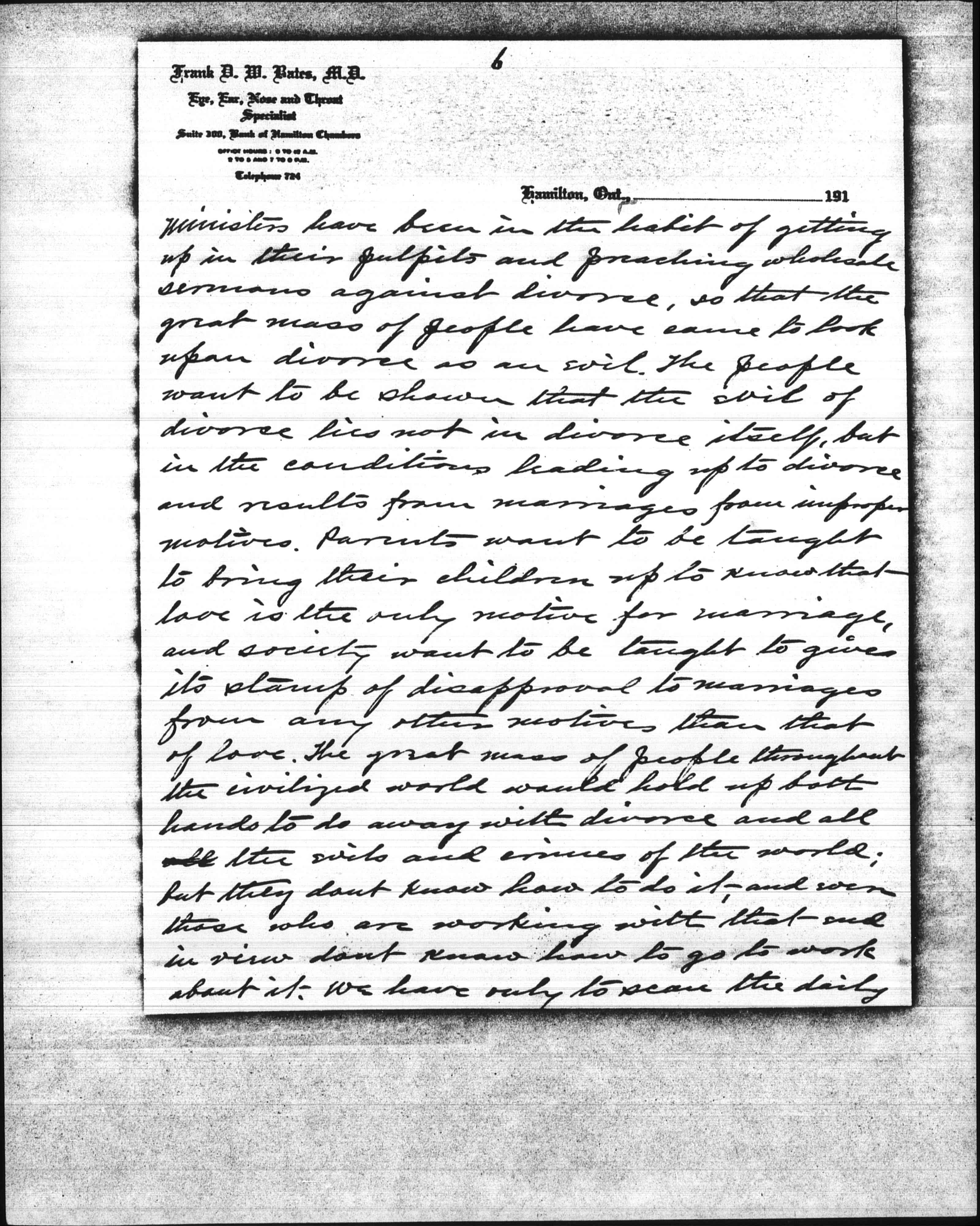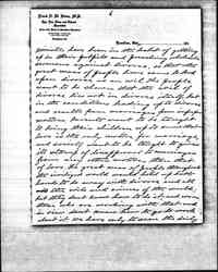 Now I want to tell you, my dear Miss Addams, that marriages from improper motives are responsible for not only immorality and prostitution, but for more of the evils and crimes of this world than all other causes combined. Look at the Shaw-White murder case in New York. White was a married man, and a clever man; one of the best architects in the world, and had a great future ahead of him had he lived. But he was unhappy in his home relations, and spent his spare time in mining young girls. [page 4] And that is only one case out of thousands upon thousands. According to the laws of New York State he could not have obtained a divorce from his wife had he so desired, for there is only one ground for divorce in N.Y. State -- adultery -- and she was not guilty of that, so far as he knew. She could have obtained a divorce from him, if she had followed him up and obtained sufficient evidence. But no doubt she was proud of her position as his wife, and was quite willing that he should go his way and she hers, so long as he supported her in luxury. But look at the evils and the crime that followed. Such marriages ought not to be allowed to exist. They better a thousand times have been divorced. The great mass of people take a very superficial view of the divorce question. They look upon divorce as an evil; when it is not only not an evil but a great blessing under present conditions. They cannot see beyond that verse in the Bible: "Whom God halt joined together let [page 5] not man put asunder," and and they seem to imagine that every couple who are legally married are joined together by God, which is not true; for if a couple are married from any other motive than that of love, God has nothing whatever to do with joining them together, even if the ceremony be performed by a dozen priests or ministers and with all the pomp and solemnity imaginable. Love is not only the corner stone but the very foundation of marriage; and without love there cannot be marriage in the sight of God, nor can there be happiness in married life. Now how are we hoping to get at this thing; You may ask. It can only be done by education; for you cannot force people to marry from the proper motive any more than you could pass a law to prevent race suicide. But if the proper steps are taken you can educate people up to the proper standard with regard to marriage. The education must come from the pulpit. [page 6] Ministers have been in the habit of getting up in their pulpits and preaching wholesale sermons against divorce, so that the great mass of people have come to look upon divorce as an evil. The people want to be shown that the evil of divorce lies not in divorce itself, but in the conditions leading up to divorce and results from marriages from improper motives. Parents want to be taught to bring their children up to know that love is the only motive for marriage, and society want to be taught to give its stamp of disapproval to marriages from any other motives than that of love. The great mass of people throughout the civilized world would hold up both hands to do away with divorce and all the evils and crimes of the world; but they don't know how to do it, and even those who are working with that end in view don't know how to go to work about it. We have only to scan this daily [page 7] papers and gather statistics to learn that such is the fact. Look at the evil of intemperance; they have been trying to do away with it by acts of legislation for over sixty years, and what is the result? In 1850 the first local option act was passed in the United States. At that time the amount of liquor consumed in the United States was four and a fraction gallons per capita; and now, after having local <option> most of the time in nearly half the States of the Union for over sixty years, the amt. of liquor consumed is twenty three and a fraction gallons per capita, or nearly six times as much per capita as was consumed before the introduction of local option. Now I don't say you can do nothing by law to diminish the increase of intemperance, for you can; but nothing they have ever done <as yet> has had any effect. The element of profit and the treating [page 8] <system> are the two greatest curses of the liquor traffic. Do away with those two, and you will do everything that can be done by law to do away with the evil of intemperance. But do away with marriages from improper motives and you will do more to do away with that evil, as well as many others, than you can do in any other way. What woman wants her husband to drink? And how many men would stand up at the bar night after night and make sots of themselves if they loved their wives and knew that their wives loved them? Precious few I can tell you. It may be argued that some men inherit an appetite for drink, and can't help it when the desire comes on. Such cases are very rare, and they would soon die off. The majority of social clubs are kept up by married men, and there is more or less drinking done at all of them. If there is no bar in the club [page 9] they go out two or three at a time to the nearest bar. But show me a man who is in the habit of spending his evenings at a social club, and I will show you a man who is unhappy in his home relations. I know what I am talking about, for I have been a member of a good many social clubs, and have been a close observer. Look at divorce. 100000 divorces granted in the United States last year, and in spite of the increasing stringency of the laws against divorce, divorce has increased three and one half times as fast as the population since 1871. And no measures could be taken by law to diminish divorce that would not increase the evils resulting from marriages from improper motives. King George V. is quoted as saying: "The foundations of our national greatness lie in our homes." I agree with that if there is love in the homes; but not otherwise. Love is not only the foundation of marriage, but the foundation [page 10] of the ve