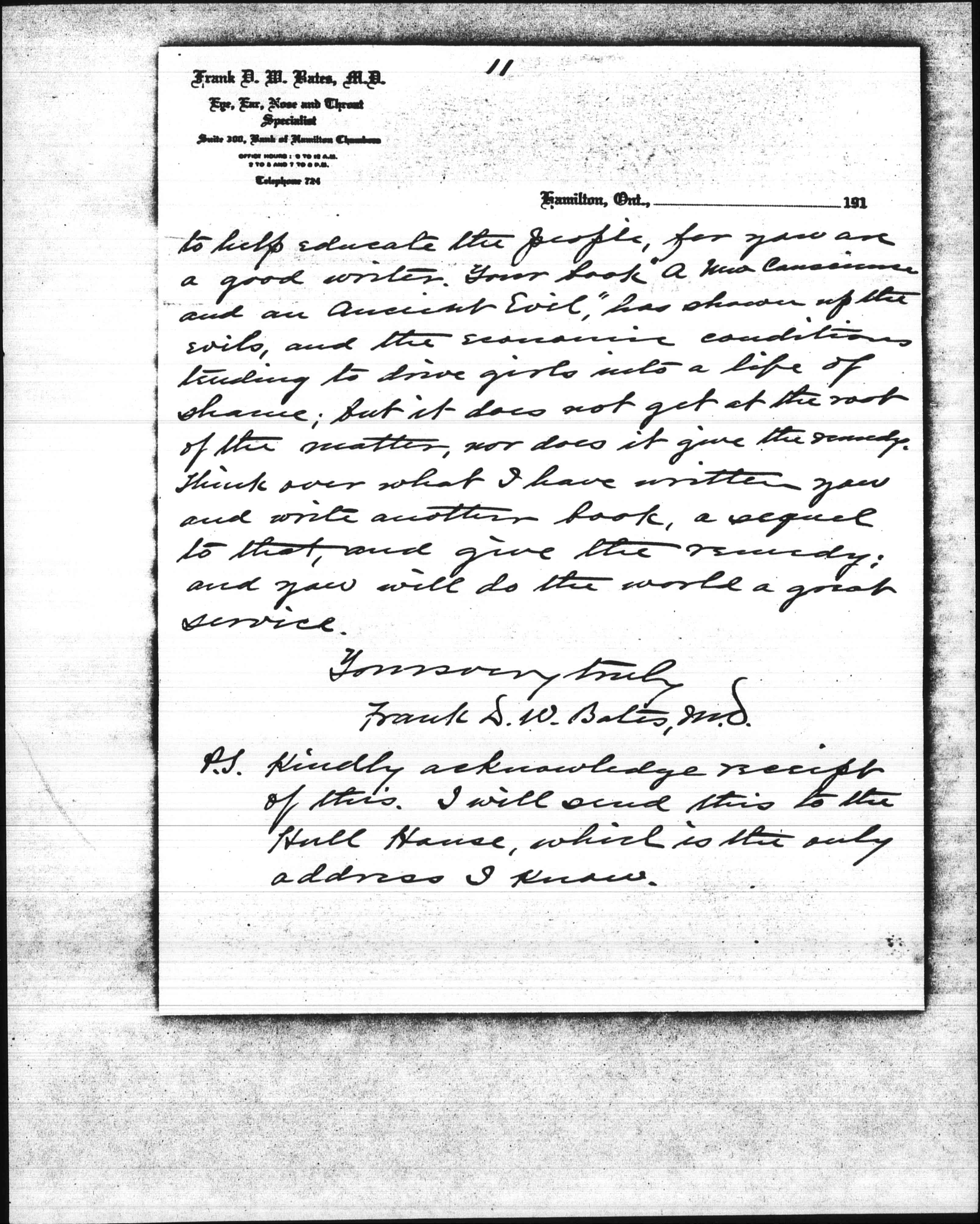 P.S. Kindly acknowledge receipt of this. I will send this to the Hull House, which is the only address I know.