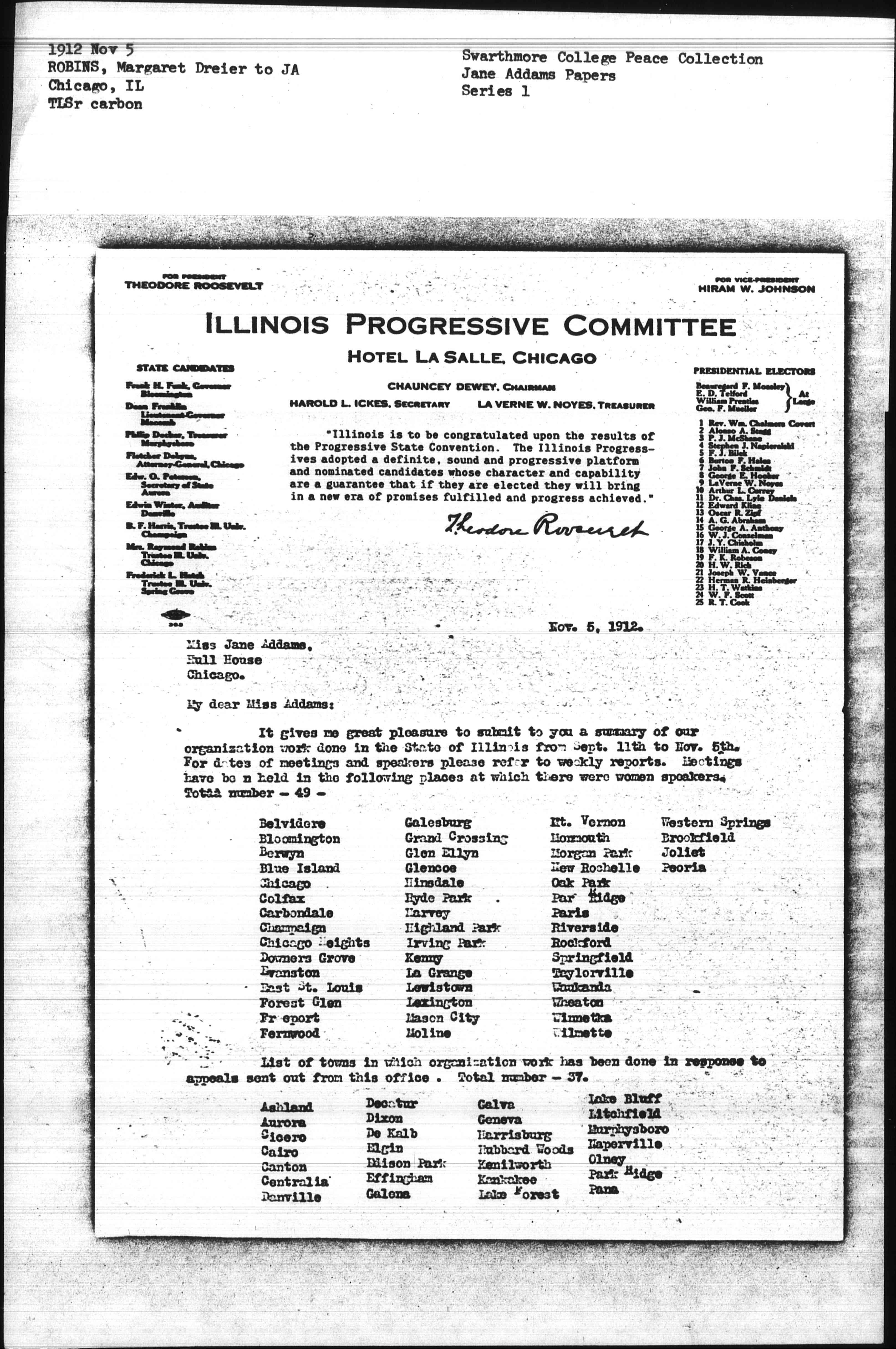 It gives me great pleasure to submit to you a summary of our organization work done in the State of Illinois from Sept. 11th to Nov. 5th. For dates of meetings and speakers please refer to weekly reports. Meetings have been held in the following places at which there were women speakers. Total number -- 49 --