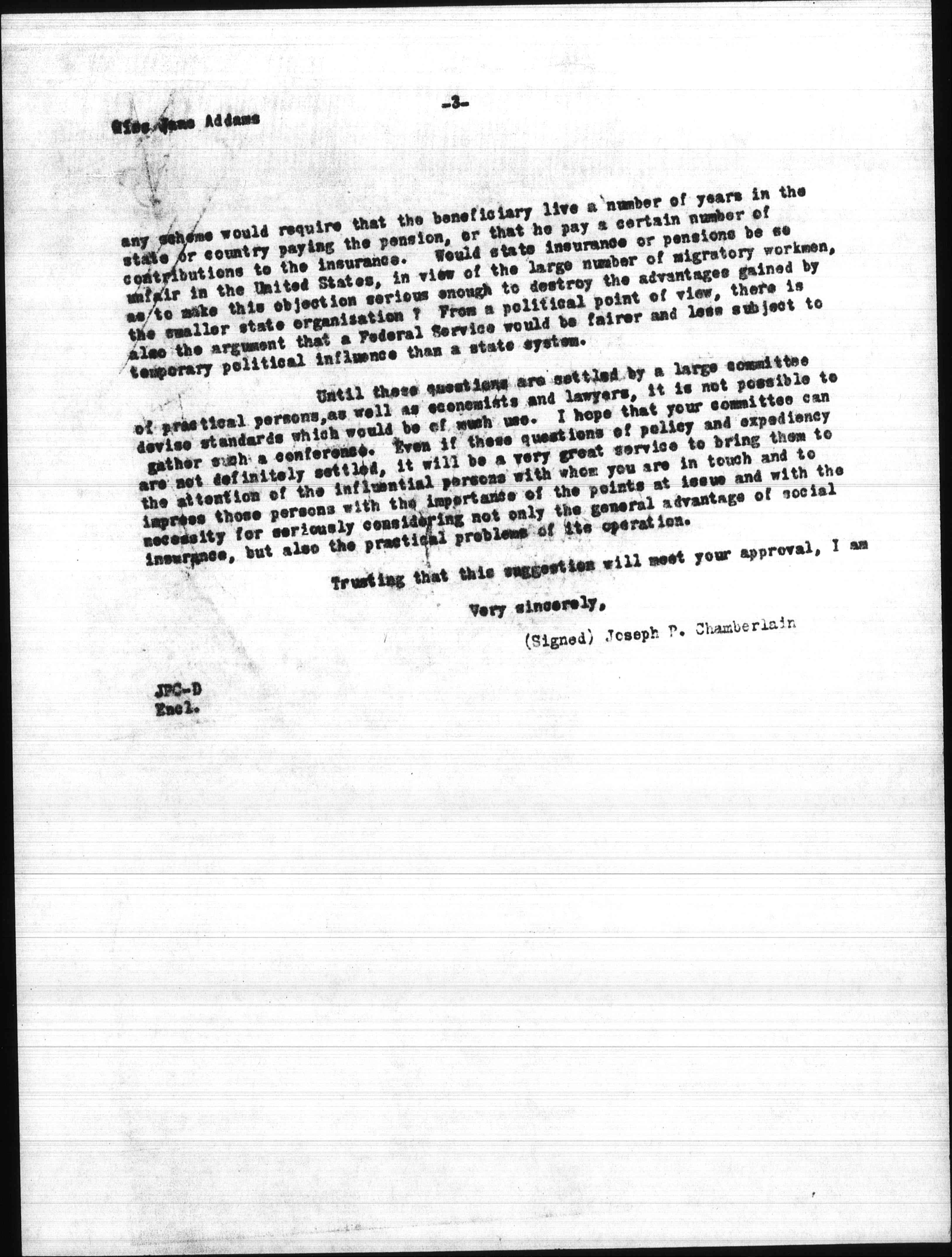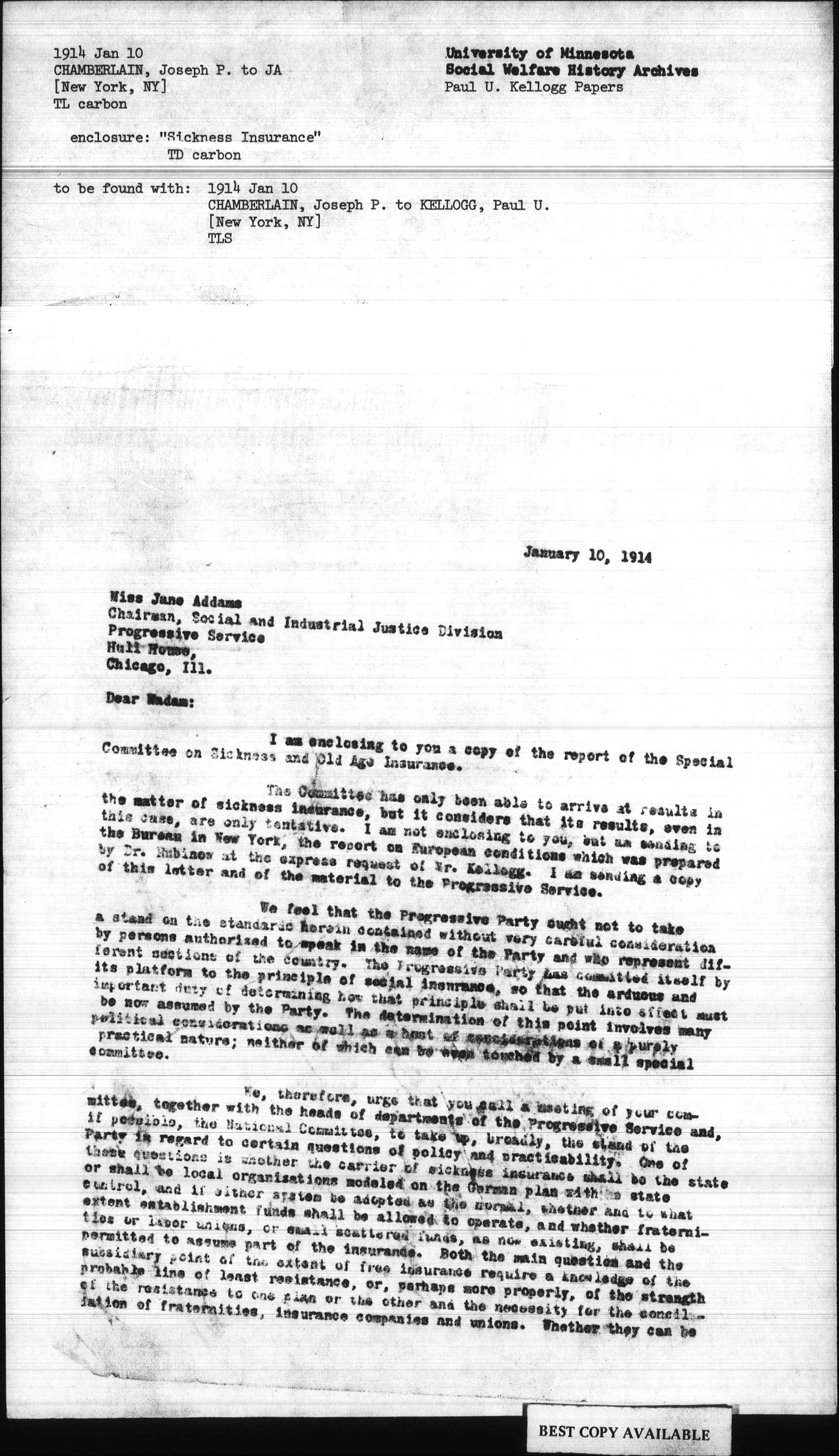 We, therefore, urge that you call a meeting of your committee, together with the heads of departments of the Progressive Service and, if possible, the National Committees, to take up, broadly, the stand of the Party in regard to certain questions of policy and practicability. One of these questions is whether the carrier of sickness insurance shall be the state or shall be local organizations modeled on the German plan with the state control, and if either system be adopted as the normal, whether and to what extent establishment funds shall be allowed to operate, and whether fraternities or labor unions, or small scattered funds, as now existing, shall be permitted to assume part of the insurance. Both the main question and the subsidiary point of the extent of free insurance require a knowledge of the probable line of least resistance, or, perhaps more properly, of the strength of the resistance to one plan or the other and the necessity for the conciliation of fraternities, insurance companies and unions. Whether they can be [page 2] conciliated depends [illegible] largely on the importance which they would appear to give to being allowed to take part in the insurance. At the recent Washington meeting of the American Association for Labor Legislation, all three of these elements appear to desire that they shall have a share in the insurance. Another question is the extent to which existing organizations are equipped to carry on the insurance. We can find no satisfactory evidence upon which to base an opinion, and we feel that the advice of the leaders in the Party should be sought. I will be very glad to attend a meeting of any such [illegible] committee and give it the benefit of whatever information I may possess, and I think that other members of the Advisory Committee may be induced to be present.