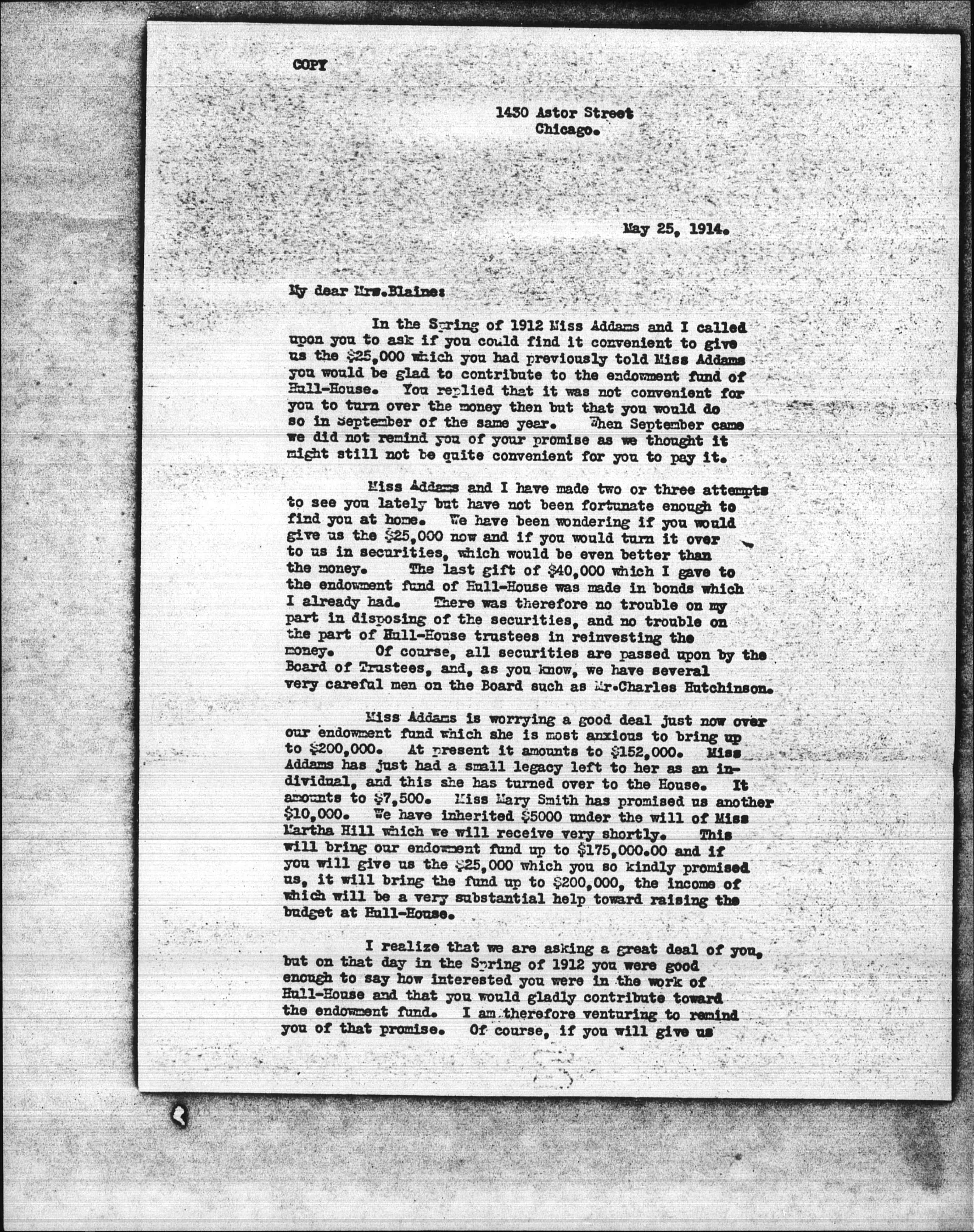 Miss Addams and I have made two or three attempts to see you lately but have not been fortunate enough to find you at home. We have been wondering if you would give us the $25,000 now and if you would turn it over to us in securities, which would be even better than the money. The last gift of $40,000 which I gave to the endowment fund of Hull-House was made in bonds which I already had. There was therefore no trouble on the part of Hull-House trustees in reinvesting the money. Of course, all securities are passed upon by the Board of Trustees, and, as you know, we have several very careful men on the Board such as Mr. Charles Hutchinson.