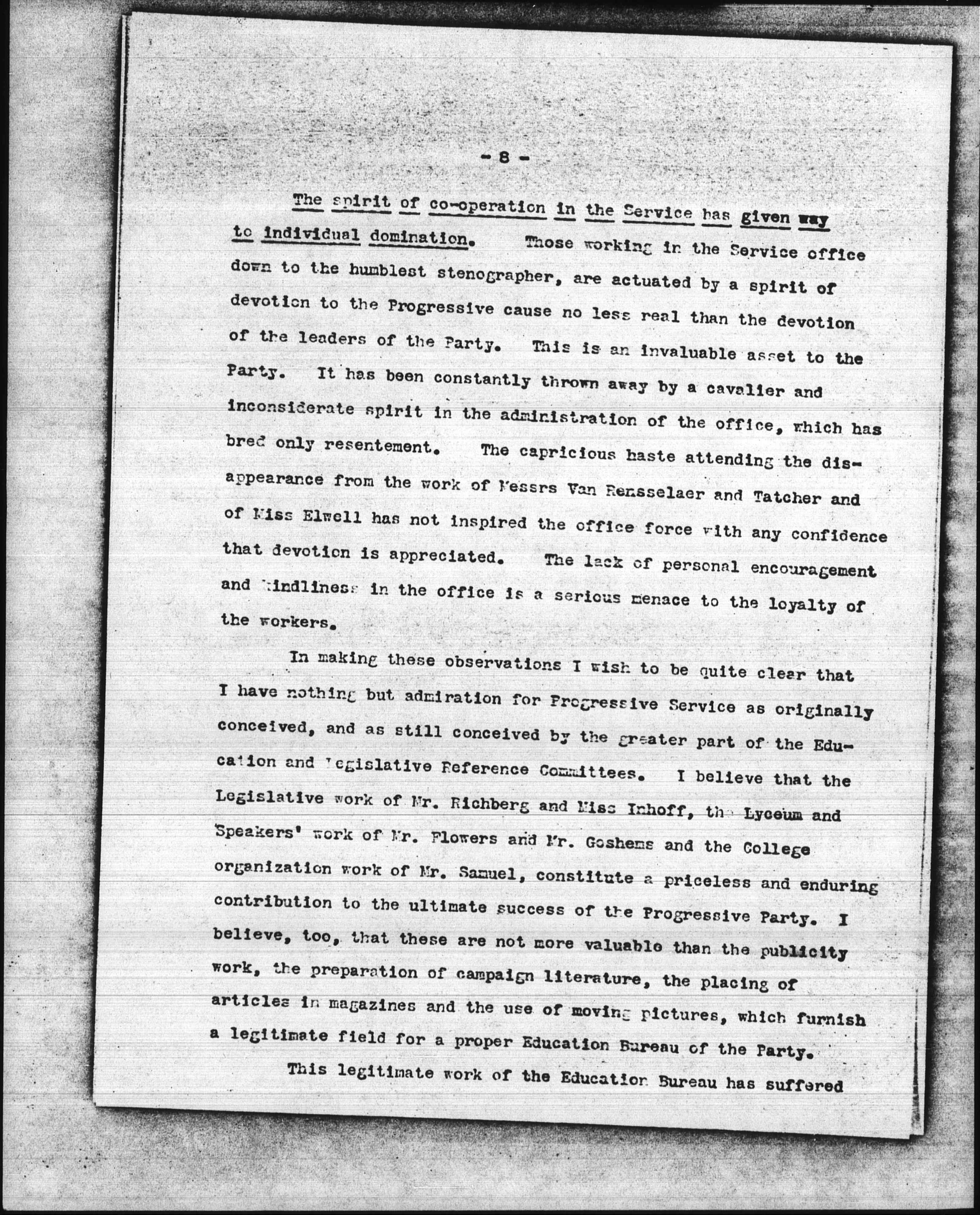 The spirit of [cooperation] in the Service has given way to individual domination. Those working in the Service office down to the humblest stenographer, are actuated by a spirit of devotion to the Progressive cause no less real than the devotion of the leaders of the Party. This is an invaluable asset to the Party. It has been constantly thrown away by a cavalier and inconsiderate spirit in the administration of the office, which has bred only [resentment]. The capricious haste attending the disappearance from the work of Messrs Van Rensselaer and Tatcher and of Miss Elwell has not inspired the office force with any confidence that devotion is appreciated. The lack of personal encouragement and kindliness in the office is a serious menace to the loyalty of the workers.