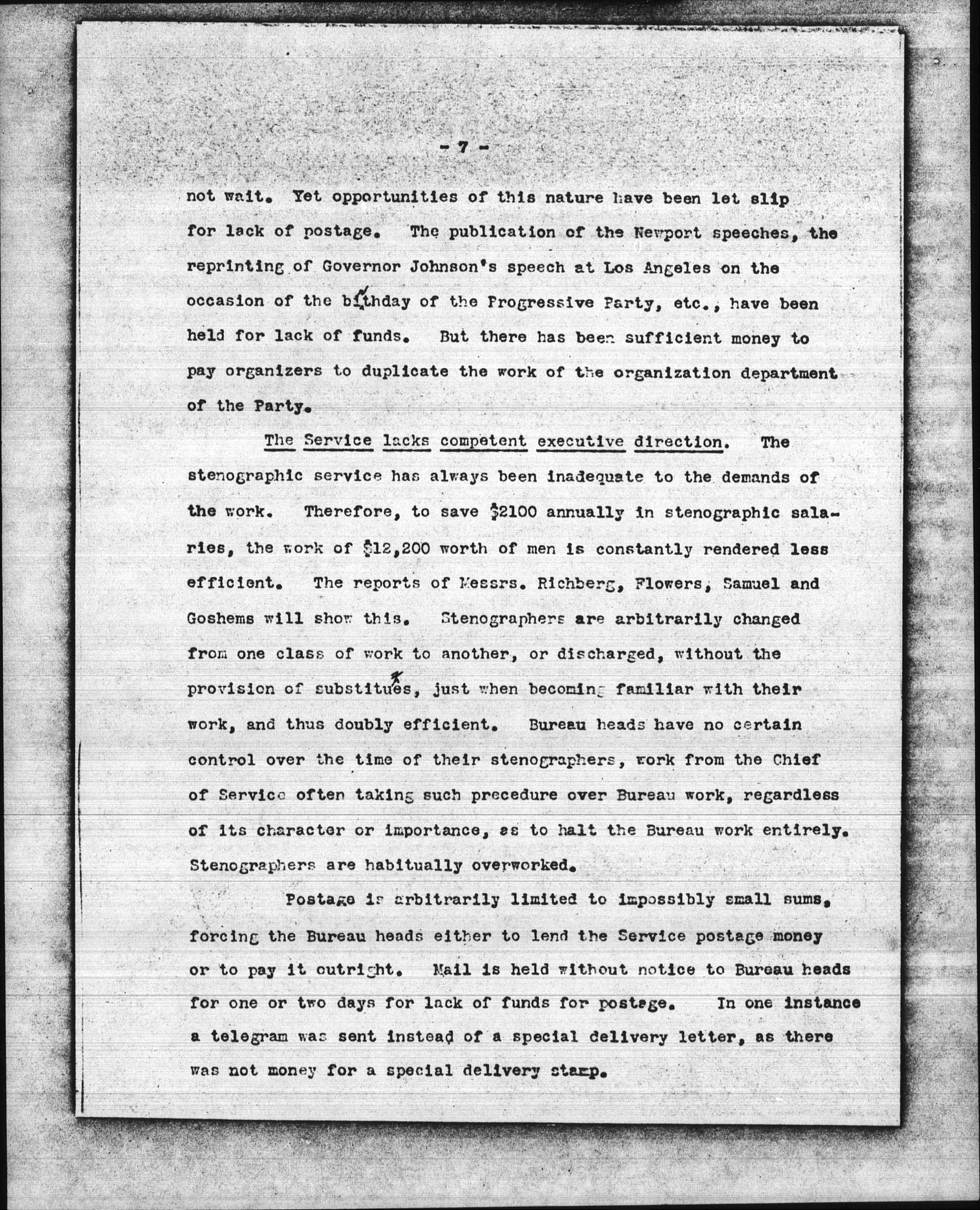 Immediate work is arbitrarily held up by lack of funds. Intelligent publicity is more essential to the Party than anything else which the Service offers. An opportunity for publicity will [page 7] not wait. Yet opportunities of this nature have been let slip for lack of postage. The publication of the Newport speeches, the reprinting of Governor Johnson's speech at Los Angeles on the occasion of the birthday of the Progressive Party, etc., have been held for lack of funds. But there has been sufficient money to pay organizers to duplicate the work of the organization department of the Party.