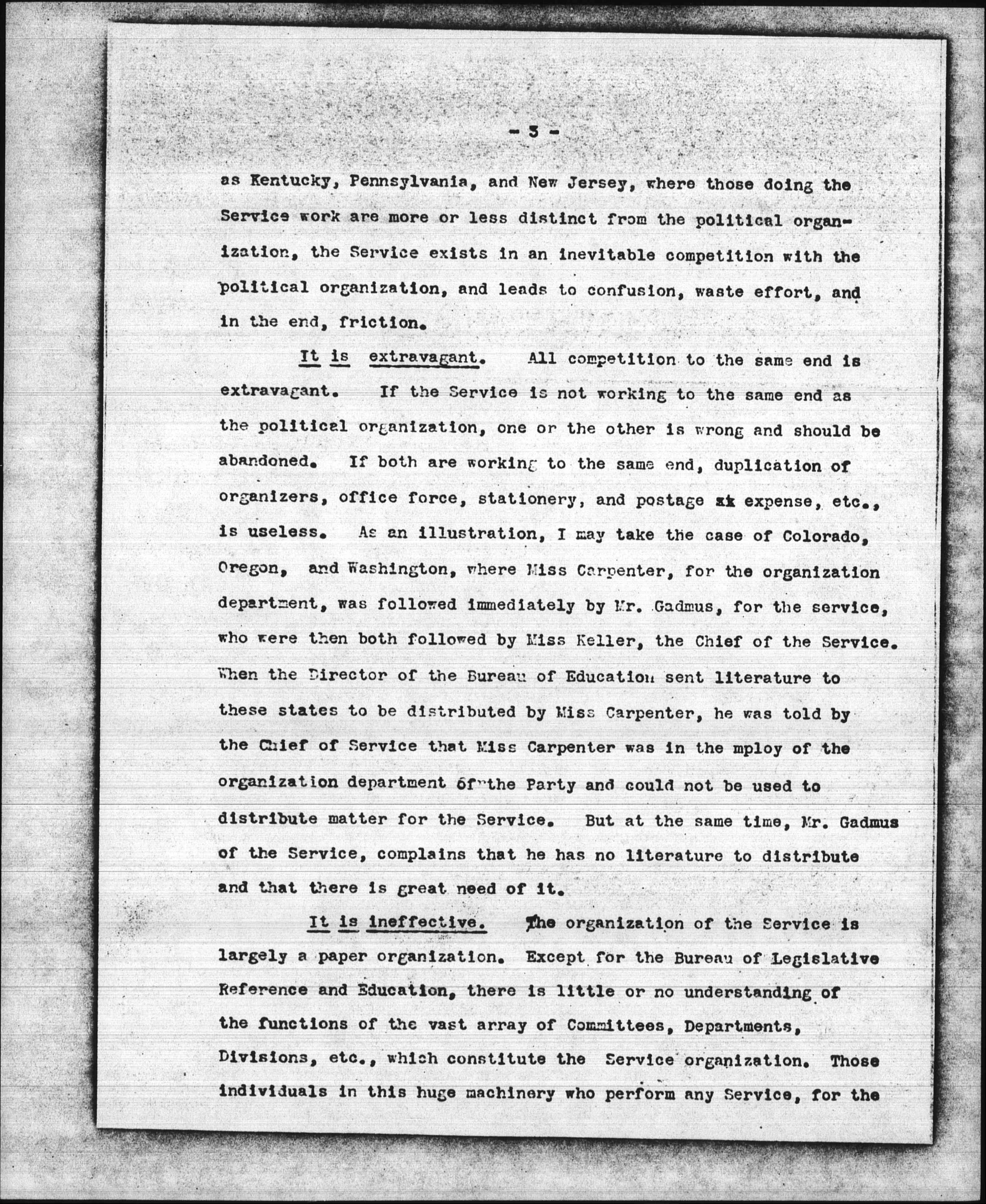 It is extravagant. All competition to the same end is extravagant. If the Service is not working to the same end as the political organization, one or the other is wrong and should be abandoned. If both are working to the same end, duplication of organizers, office force, stationery, and postage expense, etc., is useless. As an illustration, I may take the case of Colorado, Oregon, and Washington, where Miss Carpenter, for the organization department, was followed immediately by Mr. Gadmus, for the service, who were then both followed by Miss [Kellor], the Chief of the Service. When the Director of the Bureau of Education sent literature to these states to be distributed by Miss Carpenter, he was told by the Chief of Service that Miss Carpenter was in the employ of the organization department of the Party and could not be used to distribute matter for the Service. But at the same time, Mr. Gadmus of the Service, complains that he has no literature to distribute and that there is great need of it.