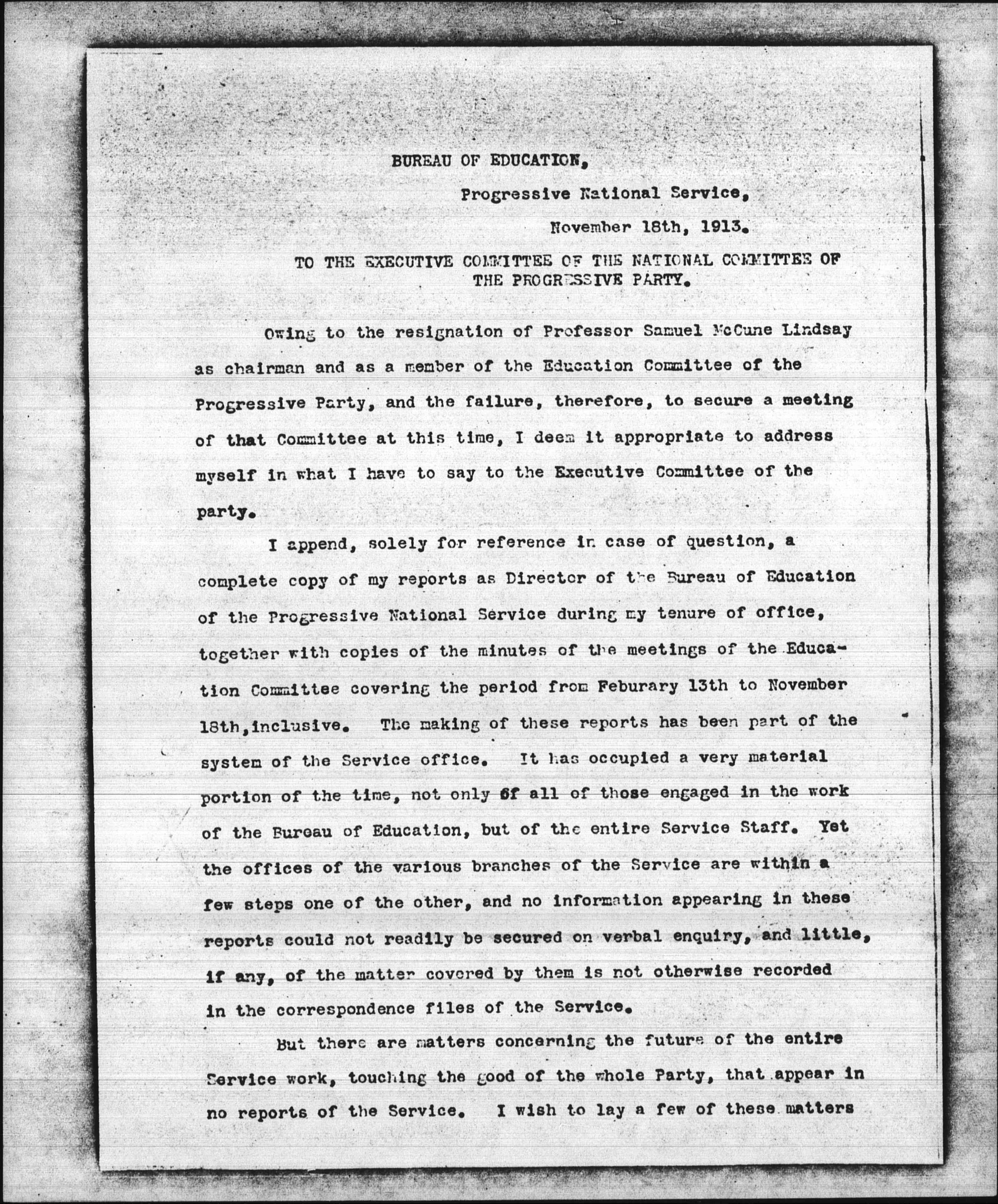 I append, solely for reference in case of question, a complete copy of my reports as Director of the Bureau of Education of the Progressive National Service during my tenure of office, together with copies of the minutes of the meetings of the Education Committee covering the period from February 13th to November 18th, inclusive. The making of these reports has been part of the system of the Service office. It has occupied a very material portion of the time, not only of all of those engaged in the work of the Bureau of Education, but of the entire Service Staff. Yet the offices of the various branches of the Service are within a few steps one of the other, and no information appearing in these reports could not readily be secured on verbal [inquiry], and little, if any, of the matter covered by them is not otherwise recorded in the correspondence files of the Service.