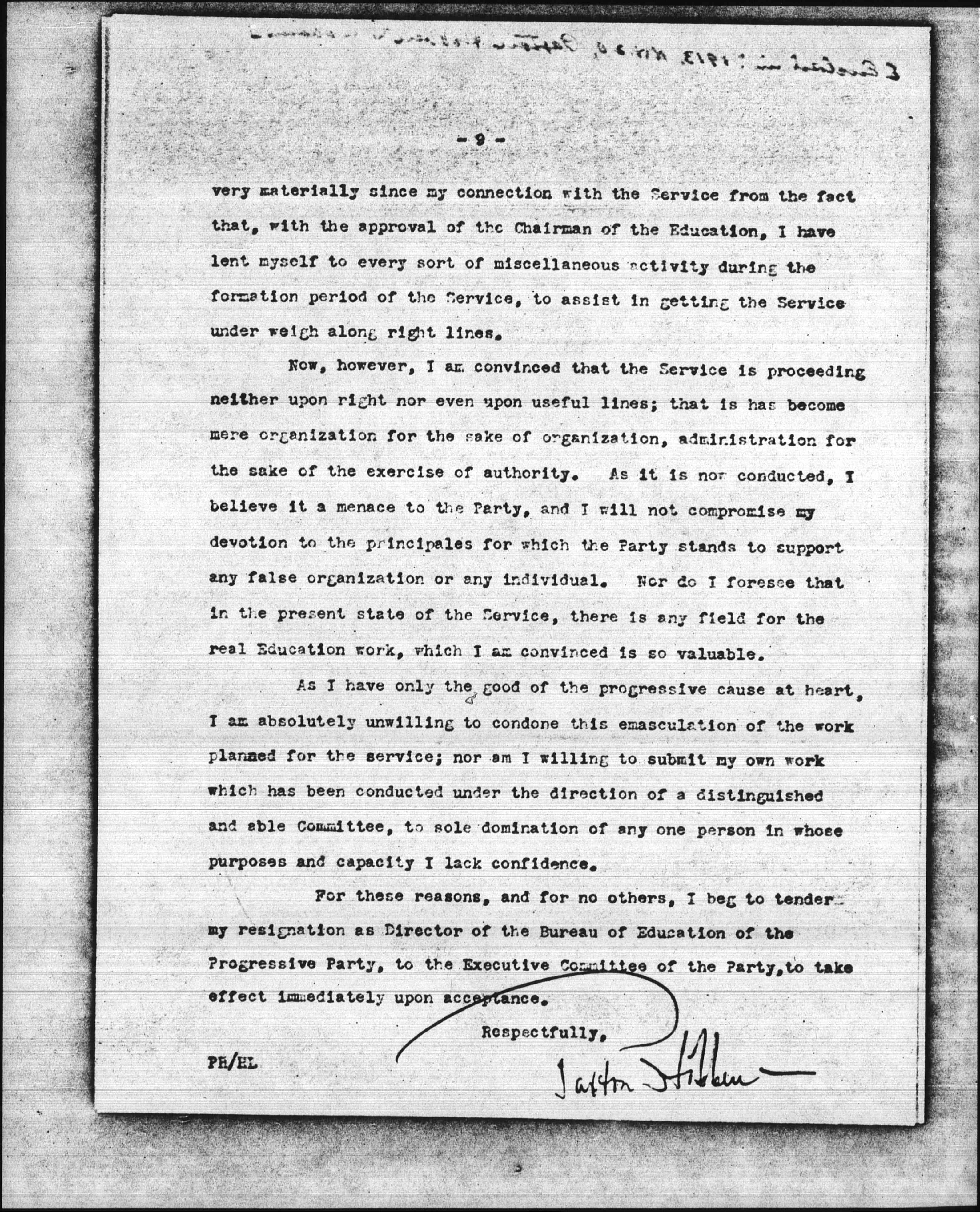 Now, however, I am convinced that the Service is proceeding neither upon right nor even upon useful lines; that is has become mere organization for the sake of organization, administration for the sake of the exercise of authority. As it is now conducted, I believe it a menace to the Party, and I will not compromise my devotion to the [principles] for which the Party stands to support any false organization or any individual. Nor do I foresee that in the present state of the Service, there is any field for the real Education work, which I am convinced is so valuable.