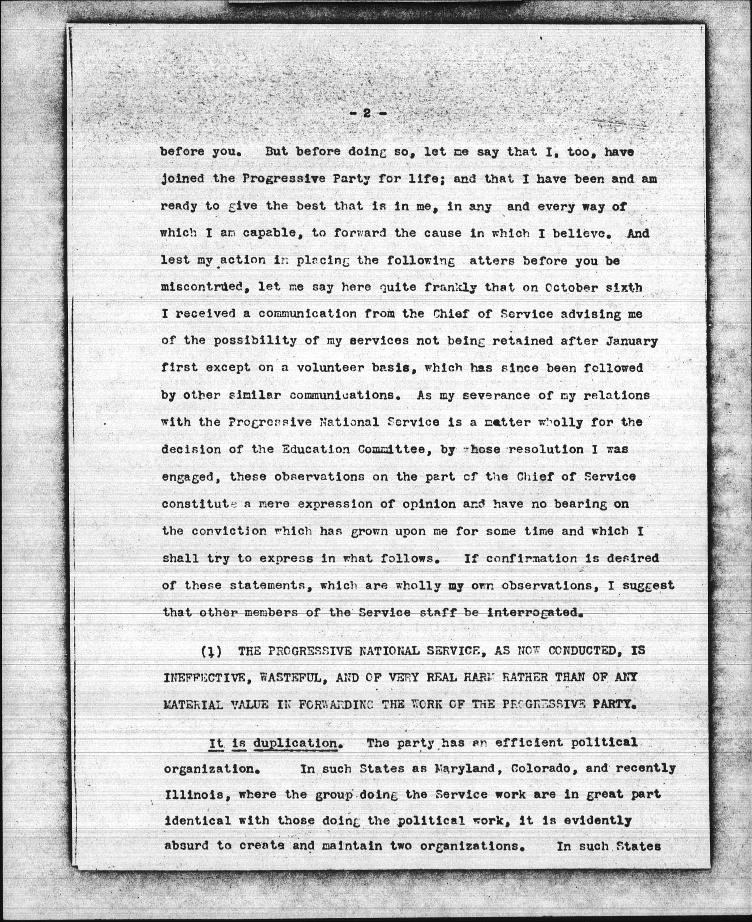 But there are matters concerning the future of the entire Service work, touching the good of the whole Party, that appear in no reports of the Service. I wish to lay a few of these matters [page 2] before you. But before doing so, let me say that I, too, have joined the Progressive Party for life; and that I have been and am ready to give the best that is in me, in any and every way of which I am capable, to forward the cause in which I believe. And lest my action in placing the following matters before you be misconstrued, let me say here quite frankly that on October sixth I received a communication from the Chief of Service advising me of the possibility of my services not being retained after January first except on a volunteer basis, which has since been followed by other similar communications. As my severance of my relations with the Progressive National Service is a matter wholly for the decision of the Education Committee, by whose resolution I was engaged, these observations on the part of the Chief of Service constitute a mere expression of opinion and have no bearing on the conviction which has grown upon me for some time and which I shall try to express in what follows. If confirmation is desired of these statements, which are wholly my own observations, I suggest that other members of the Service staff by interrogated.
