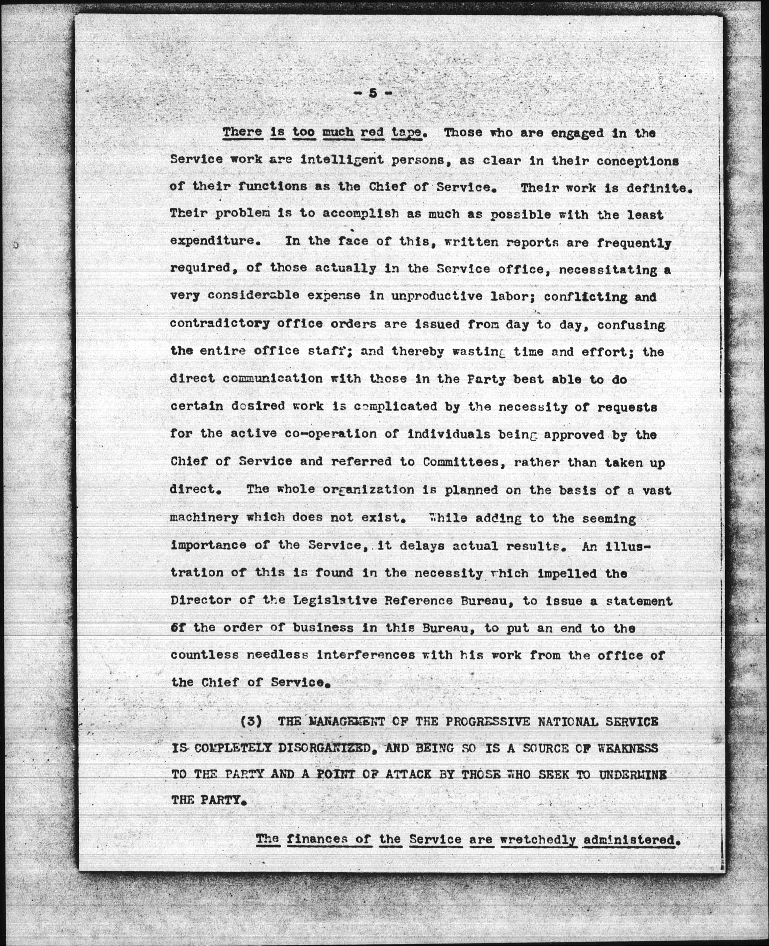 There is too much red tape. Those who are engaged in the Service work are intelligent persons, as clear in their conceptions of their functions as the Chief of Service. Their work is definite. Their problem is to accomplish as much as possible with the least expenditure. In the face of this, written reports are frequently required, of those actually in the Service office, necessitating a very considerable expense in unproductive labor; conflicting and contradictory office orders are issued from day to day, confusing the entire office staff; and thereby wasting time and effort; the direct communication with those in the Party best able to do certain desired work is complicated by the necessity of requests for the active [cooperation] of individuals being approved by the Chief of Service and referred to Committees, rather than taken up direct. The whole organization is planned on the basis of a vast machinery which does not exist. While adding to the seeming importance of the Service, it delays actual results. An illustration of this is found in the necessity which impelled the Director of the Legislative Reference Bureau, to issue a statement of the order of business in this Bureau, to put an end to the countless needless interferences with his work from the office of the Chief of Service.