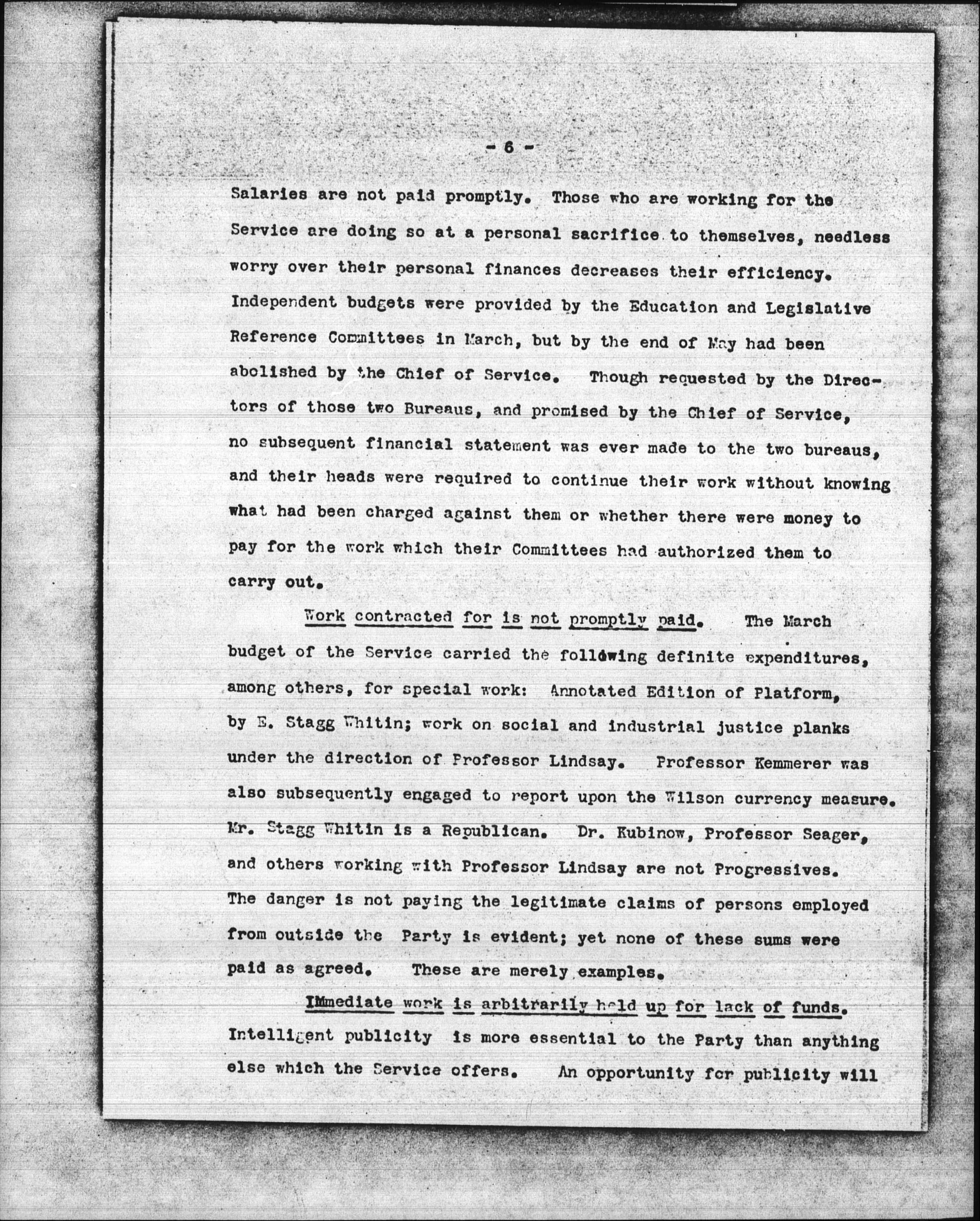 Work contracted for is not promptly paid. The March budget of the Service carried the following definite expenditures, among others, for special work: Annotated Edition of Platform, by E. Stagg Whitin; work on social and industrial justice planks under the direction of Professor Lindsay. Professor Kemmerer was also subsequently engaged to report upon the Wilson currency measure. Mr. Stagg Whitin is a Republican. Dr. [Rubinow], Professor Seager, and others working with Professor Lindsay are not Progressives. The danger is not paying the legitimate claims of persons employed from outside the Party is evident; yet none of these sums were paid as agreed. These are merely examples.