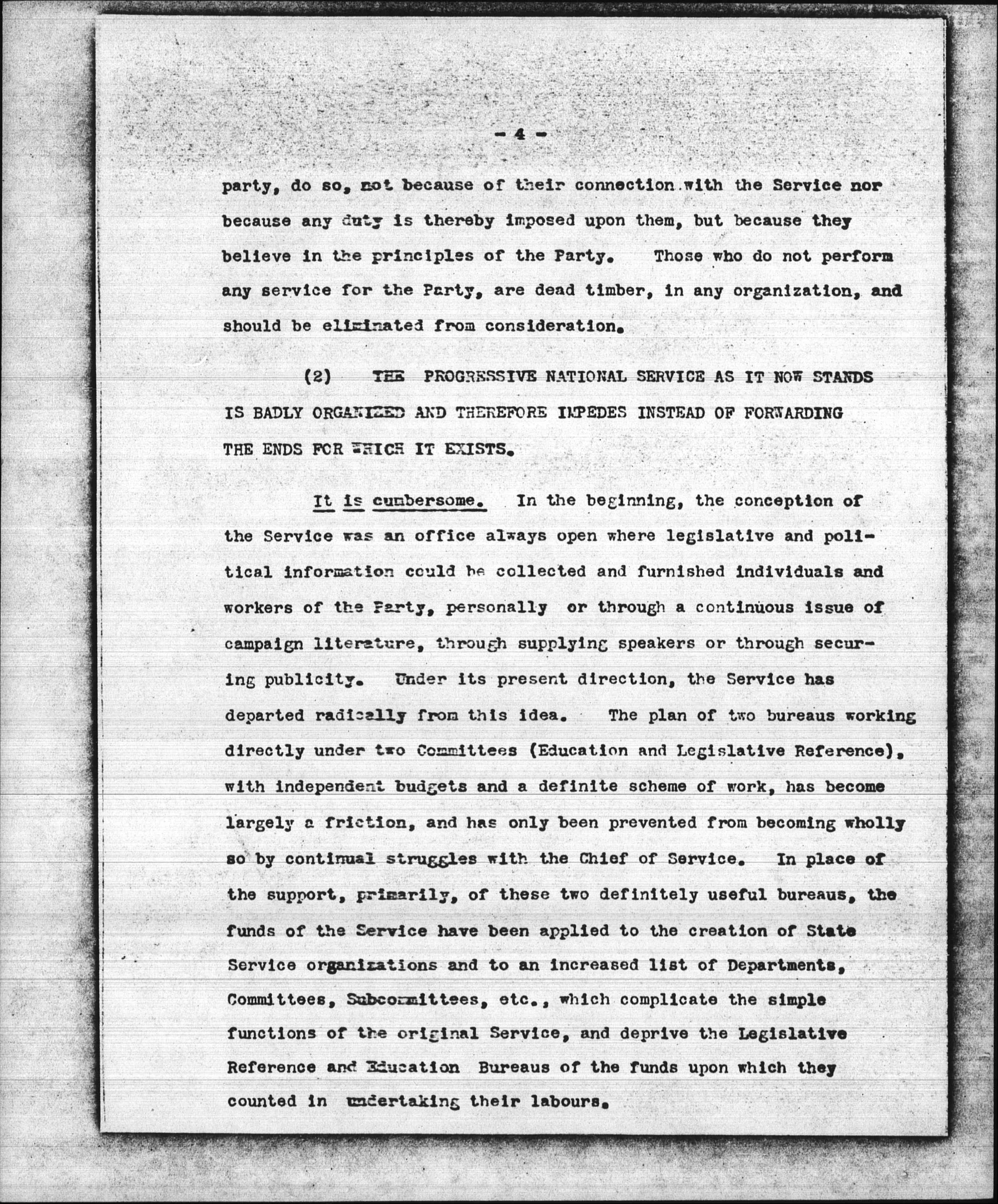 It is ineffective. The organization of the Service is largely a paper organization. Except for the Bureau of Legislative Reference and Education, there is little or no understanding of the functions of the vast array of Committees, Departments, Divisions, etc., which constitute the Service organization. Those individuals in this huge machinery who perform any Service, for the [page 4] party, do so, not because of their connection with the Service nor because any duty is thereby imposed upon them, but because they believe in the principles of the Party. Those who do not perform any service for the Party, are dead timber, in any organization, and should be eliminated from consideration.