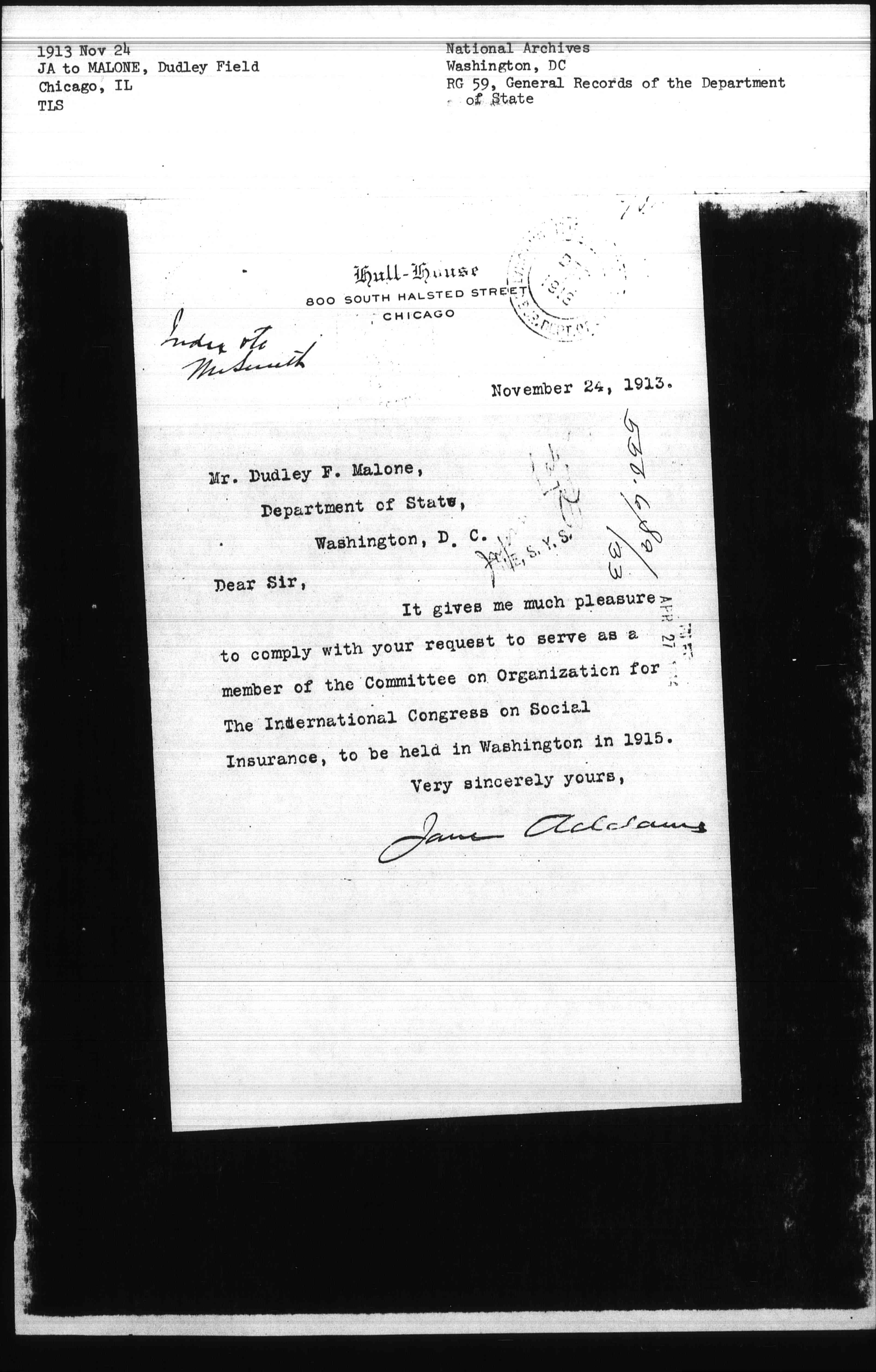 It gives me much pleasure to comply with your request to serve as a member of the Committee on Organization for The International Congress on Social Insurance, to be held in Washington in 1915.