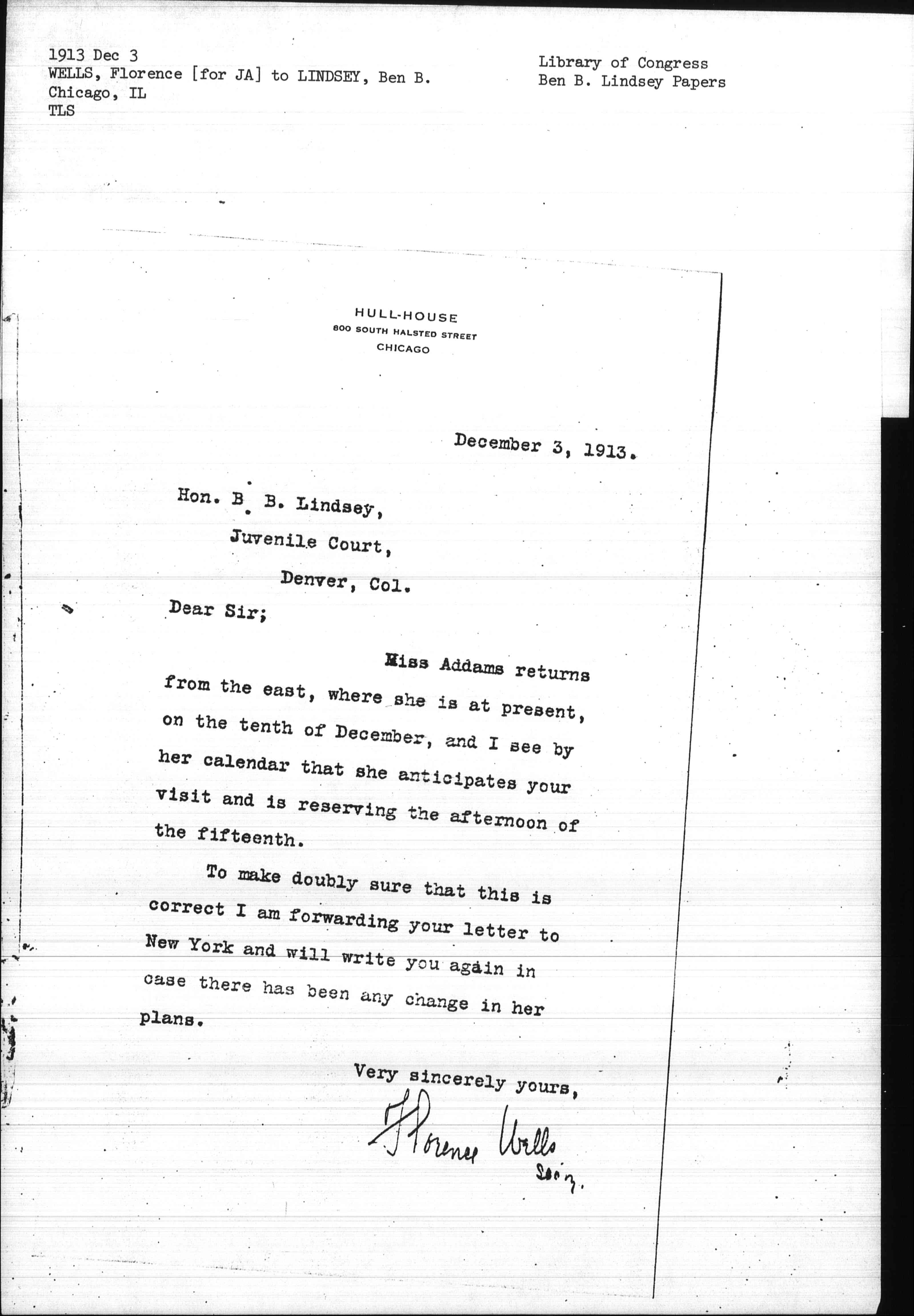 Miss Addams returns from the east, where she is at present, on the tenth of December, and I see by her calendar that she anticipates your visit and is reserving the afternoon of the fifteenth.