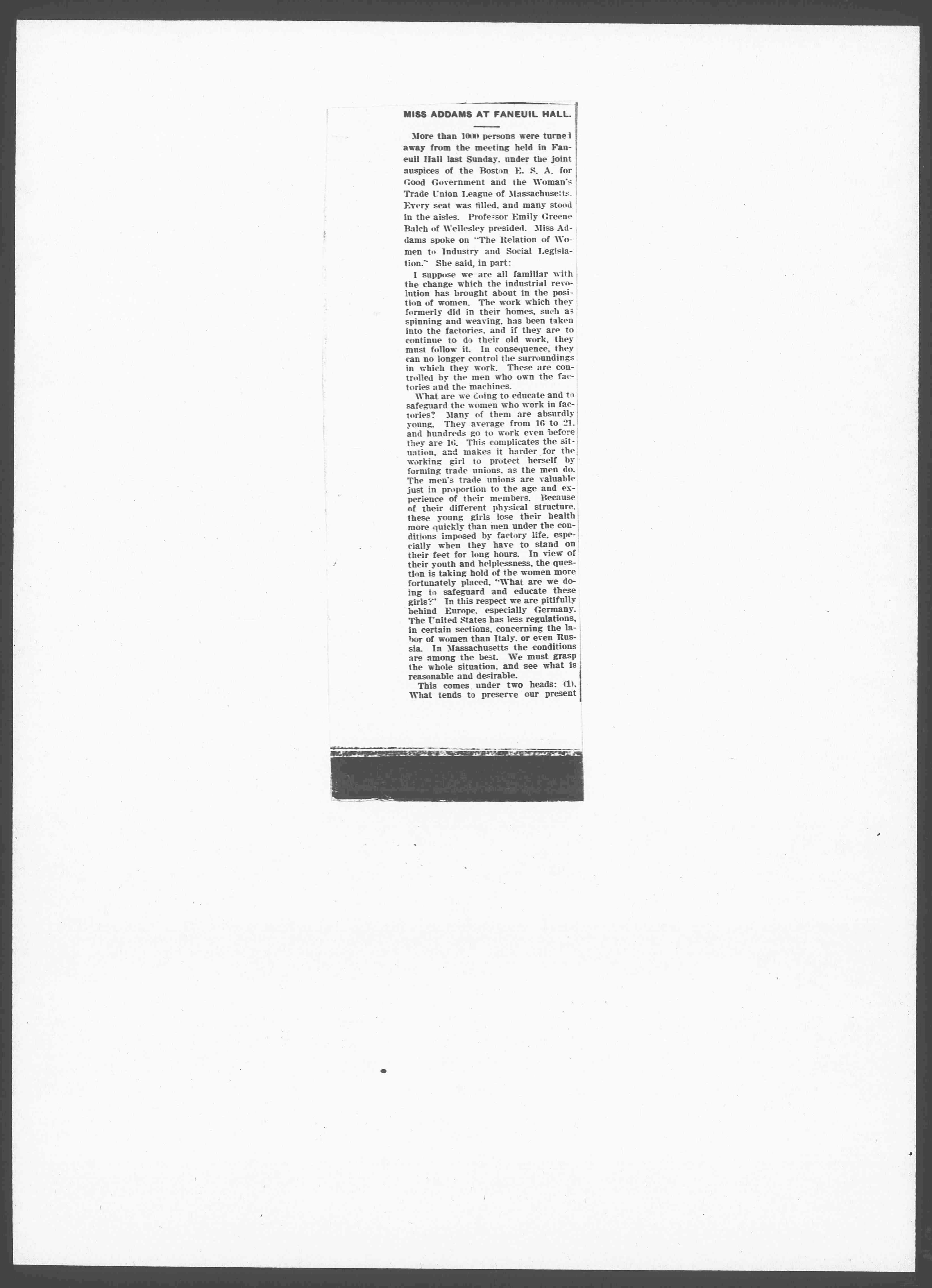More than 1000 persons were turned away from the meeting held in Faneuil Hall last Sunday, under the joint auspices of the Boston E. S. A. for Good Government and the Woman's Trade Union League of Massachusetts. Every seat was filled, and many stood in the aisles. Professor Emily Greene Balch of Wellesley presided. Miss Addams spoke on "The Relation of Women to Industry and Social Legislation." She said, in part: