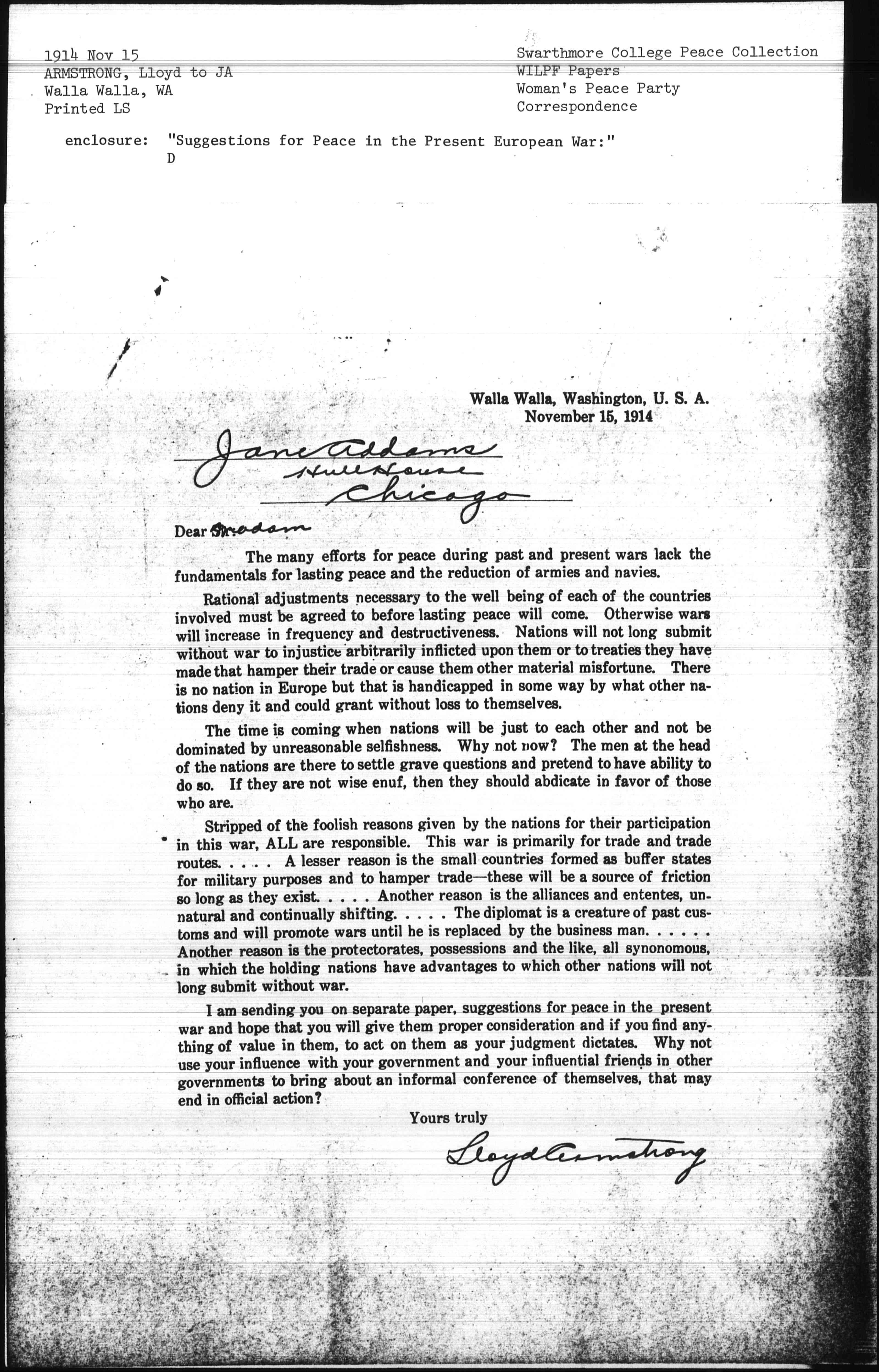 I am sending you on separate paper, suggestions for peace in the present war and hope that you will give them proper consideration and if you find anything of value in them, to act on them as your judgment dictates. Why not use your influence with your government and your influential friends in other governments to bring about an informal conference of themselves, that may end in official action?