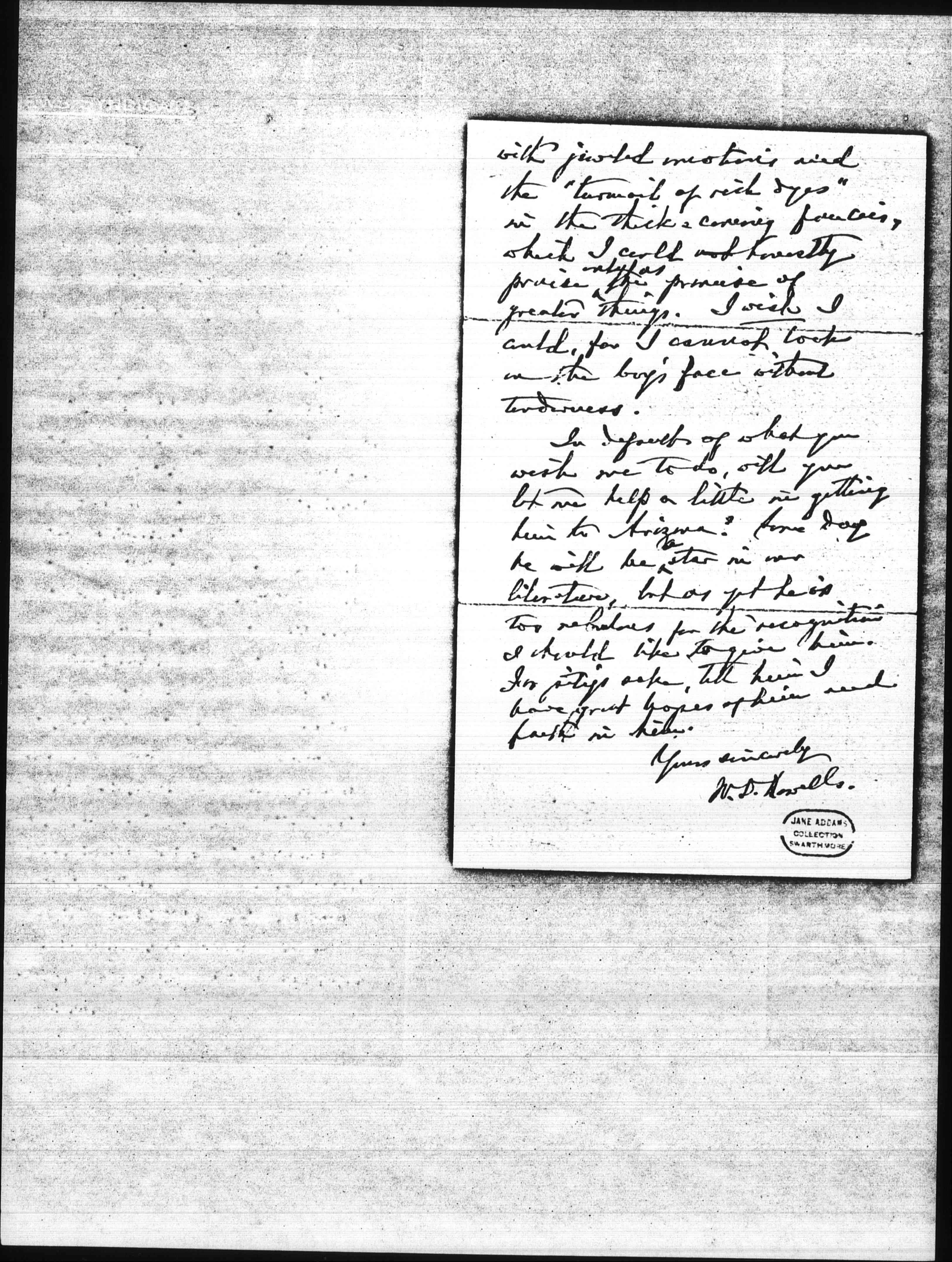In default of what you wish me to do, will you let me help a little in getting him to Arizona? Some day he will be <a> star in our literature, but as yet he is too [nebulous?] for the recognition I should like to give him. For pity's sake, tell him I have great hopes of him and faith in him.