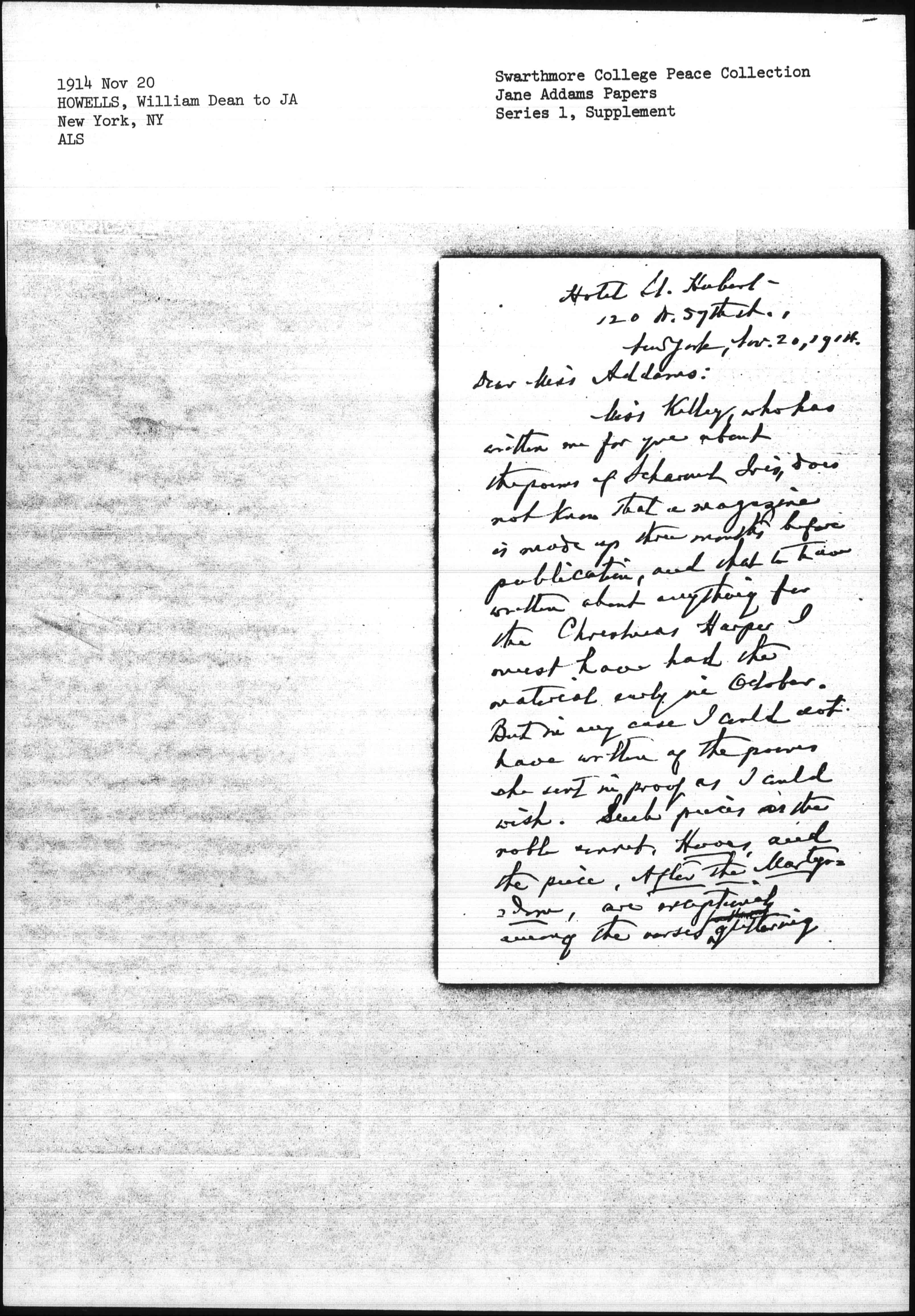 Miss Kelley, who has written me for you about the poems of Scharmel Iris, does not know that a magazine is made up three months before publication, and that to have written about anything for the Christmas Harper I must have had the material early in October. But in any case I could not have written of the poems she sent in proof as I could wish. Such pieces as the noble sonnet Heroes, and the piece After the Martyrdom, are exceptional, among the [verses] <[illegible]> glittering [page 2] with jeweled emotions and the "turmoil of rich dyes" in the thick & [covering fancies], which I could not honestly praise <only as> the promise of greater things. I wish I could, for I cannot look in the boy's face without tenderness.