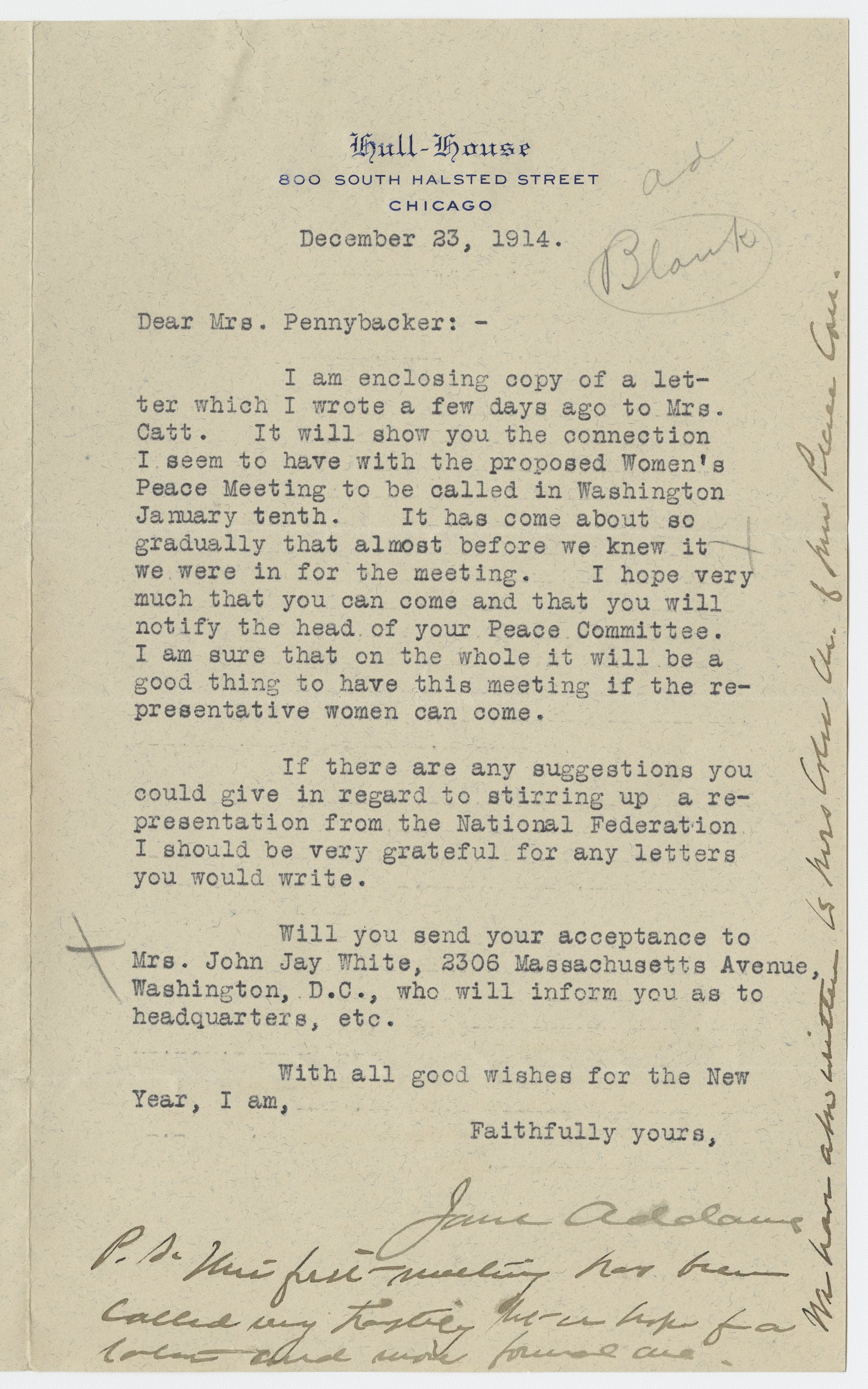 I am enclosing copy of a letter which I wrote a few days ago to Mrs. Catt. It will show you the connection I seem to have with the proposed Women's Peace Meeting to be called in Washington January tenth. It has come about so gradually that almost before we knew it we were in for the meeting. I hope very much that you can come and that you will notify the head of your Peace Committee. I am sure that on the whole it will be a good thing to have this meeting if the representative women can come.