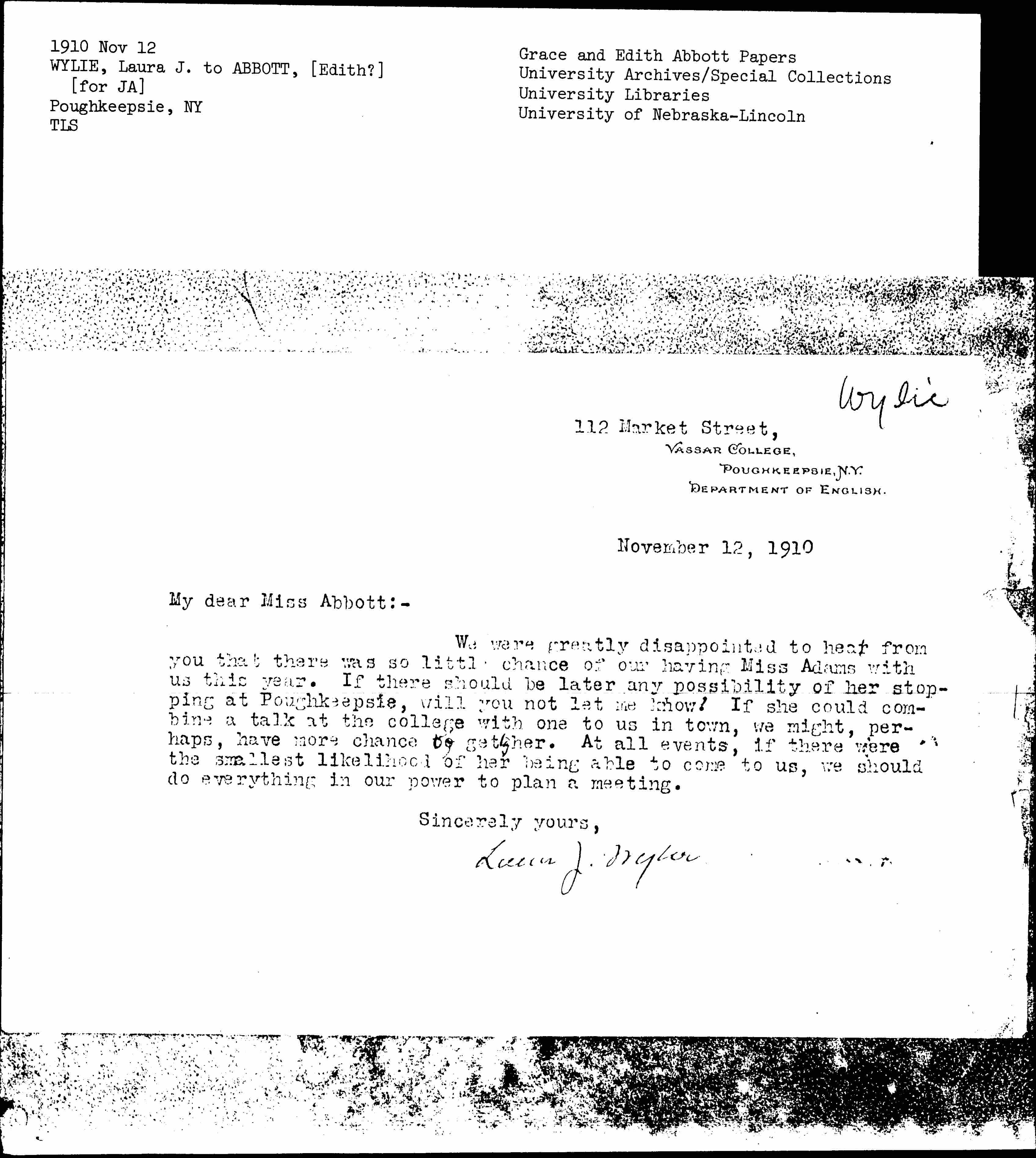 We were greatly disappointed to hear from you that there was so little chance of our having Miss [Addams] with us this year. If there should be later any possibility of her stopping at Poughkeepsie, will you not let me know? If she could combine a talk at the college with one to us in town, we might, perhaps, have more chance together. At all events, if there were the smallest likelihood of her being able to come to us, we should do everything in our power to plan a meeting.