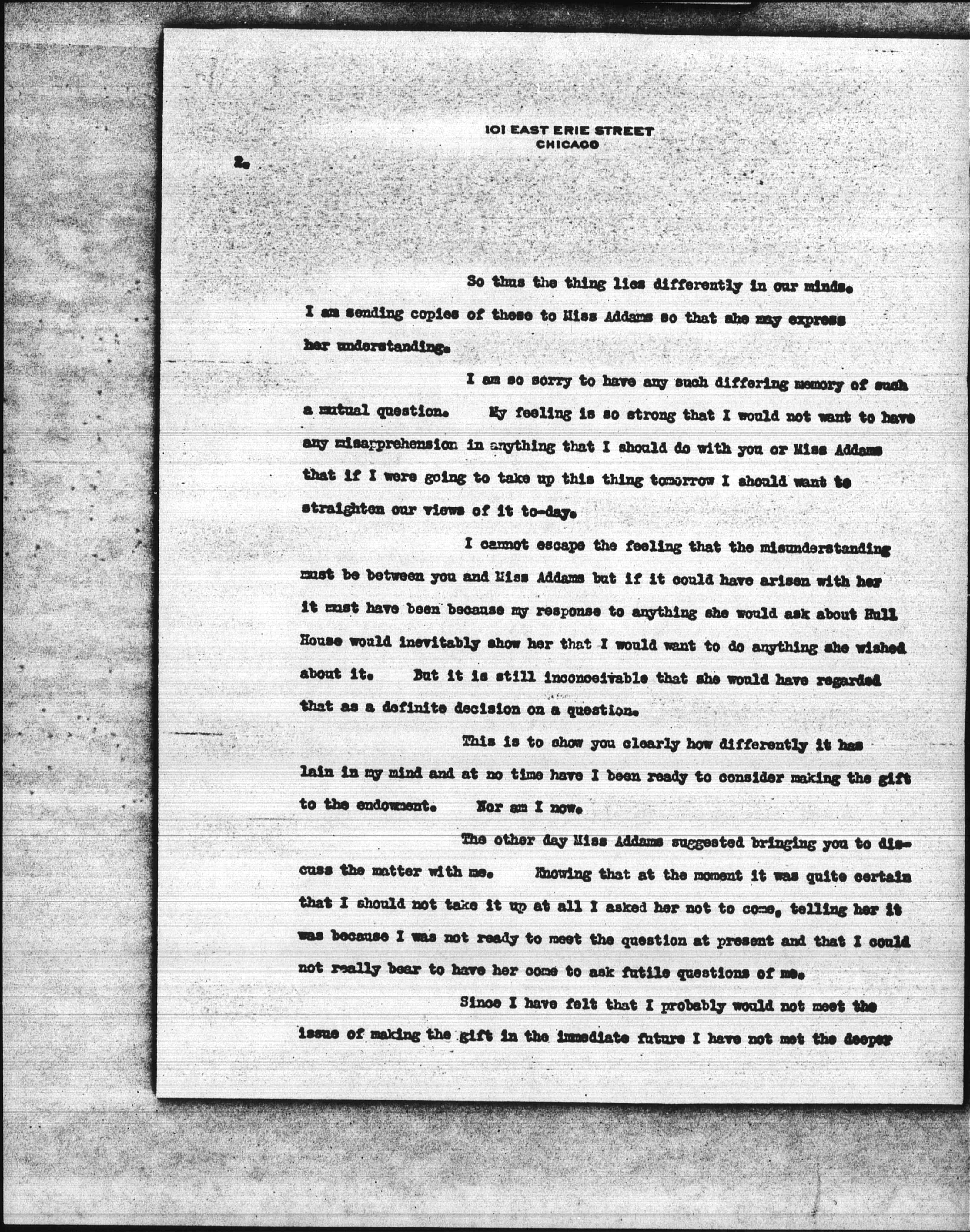 I had so few words with you about it -- I think only in a hurried moment here before a meeting -- that the misunderstandings must have been with Miss Addams who has spoken to me about my taking part in the Hull House Endowment several times.